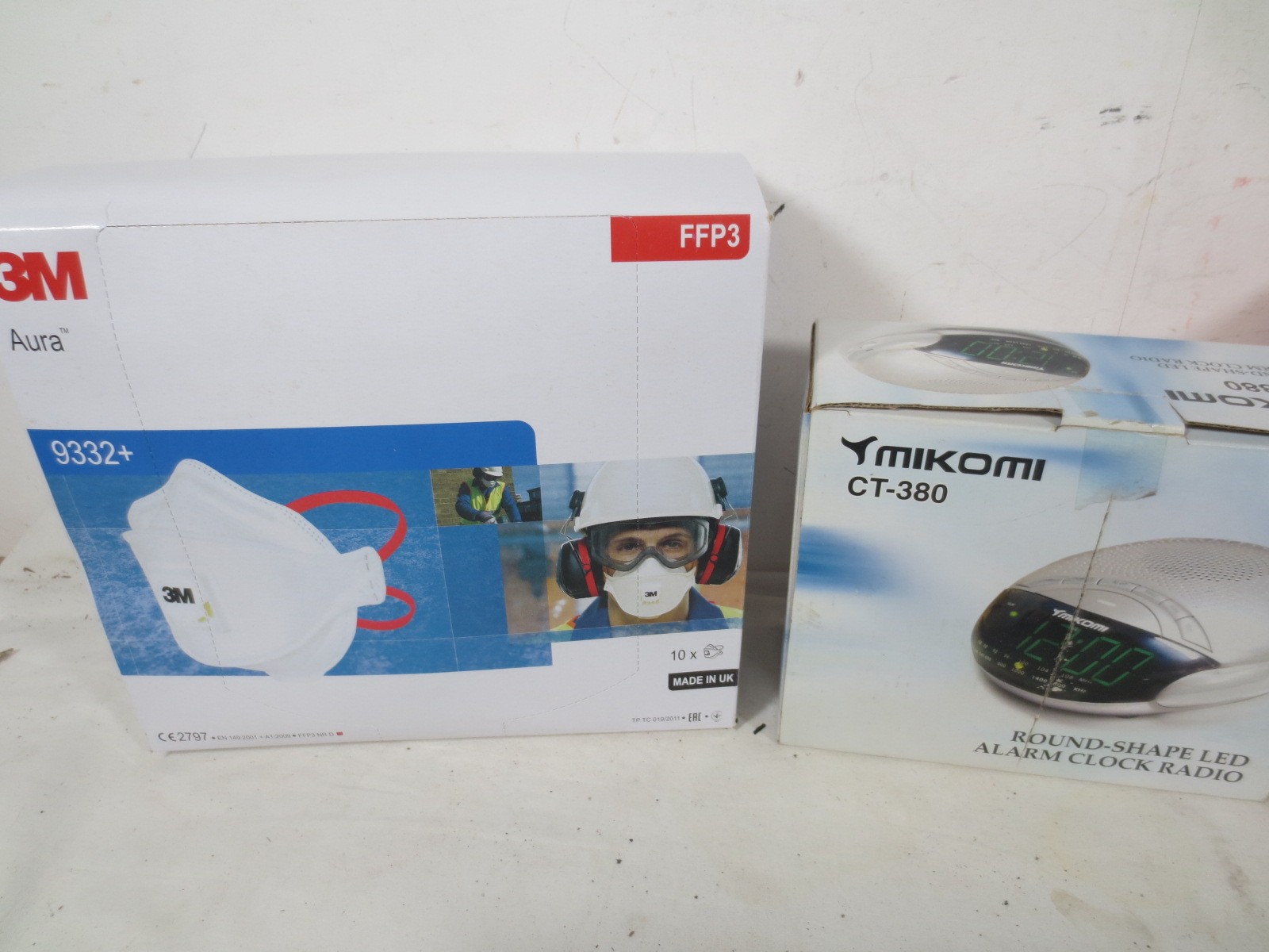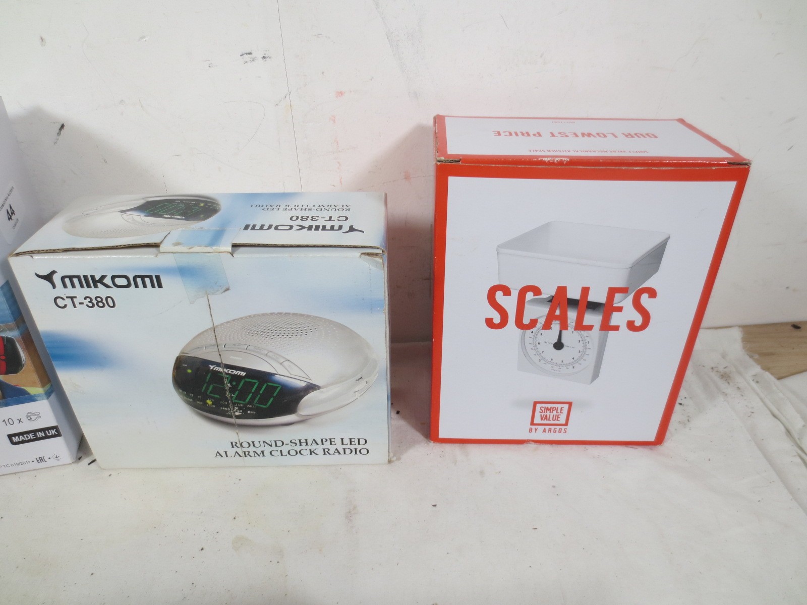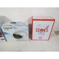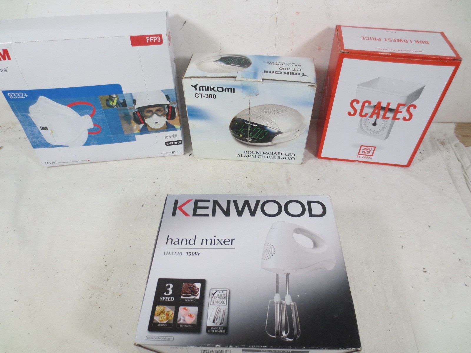 A selection of household appliances to include Hand mixer ,set of kitchen scales, Radio alarm clock Mains and battery and a pack of 3M industrial face masks all as per pictures.