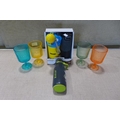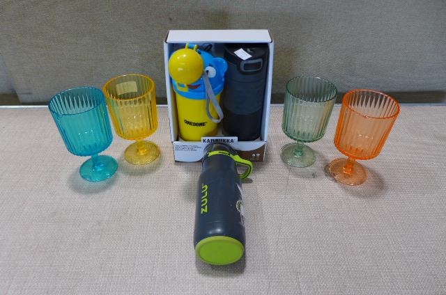 Two Kambukka hot/cold bottles, four plastic wine glasses (two cracked) and a Zulu water bottle (360-325) *This lot is subject to VAT