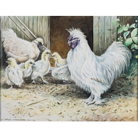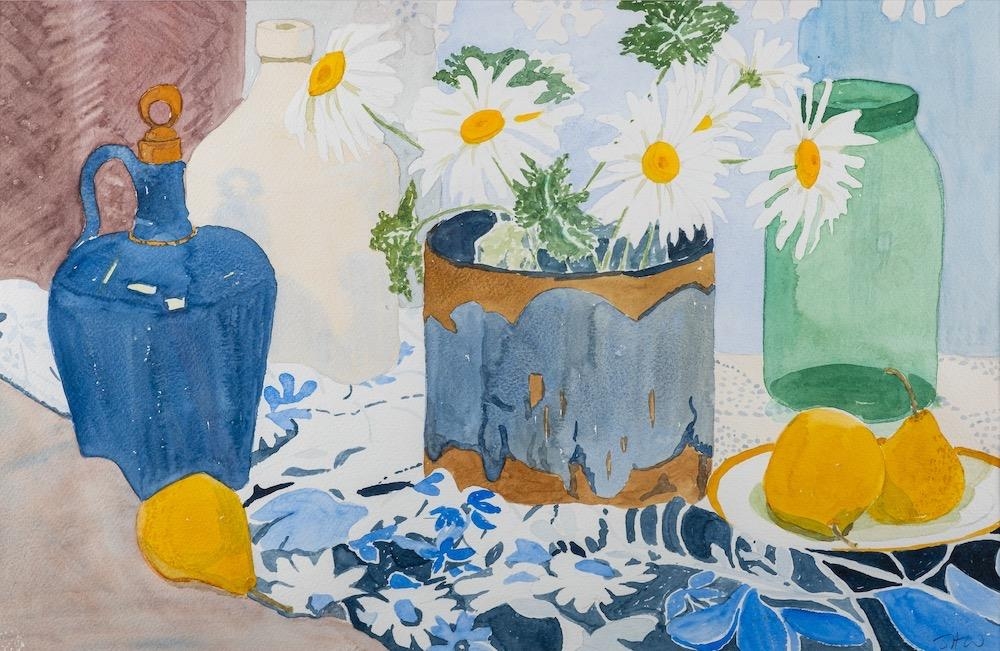 British School (second half 20th century) Still life of daisies, pears and crockery on a table initialled JHW lower right watercolour 34 x 53cm