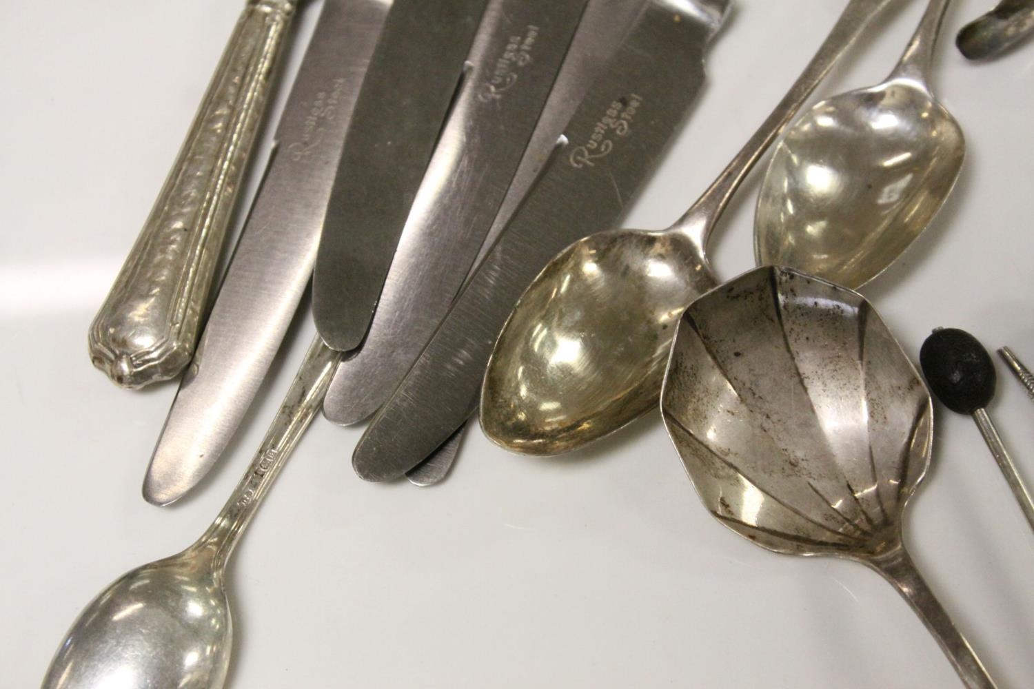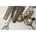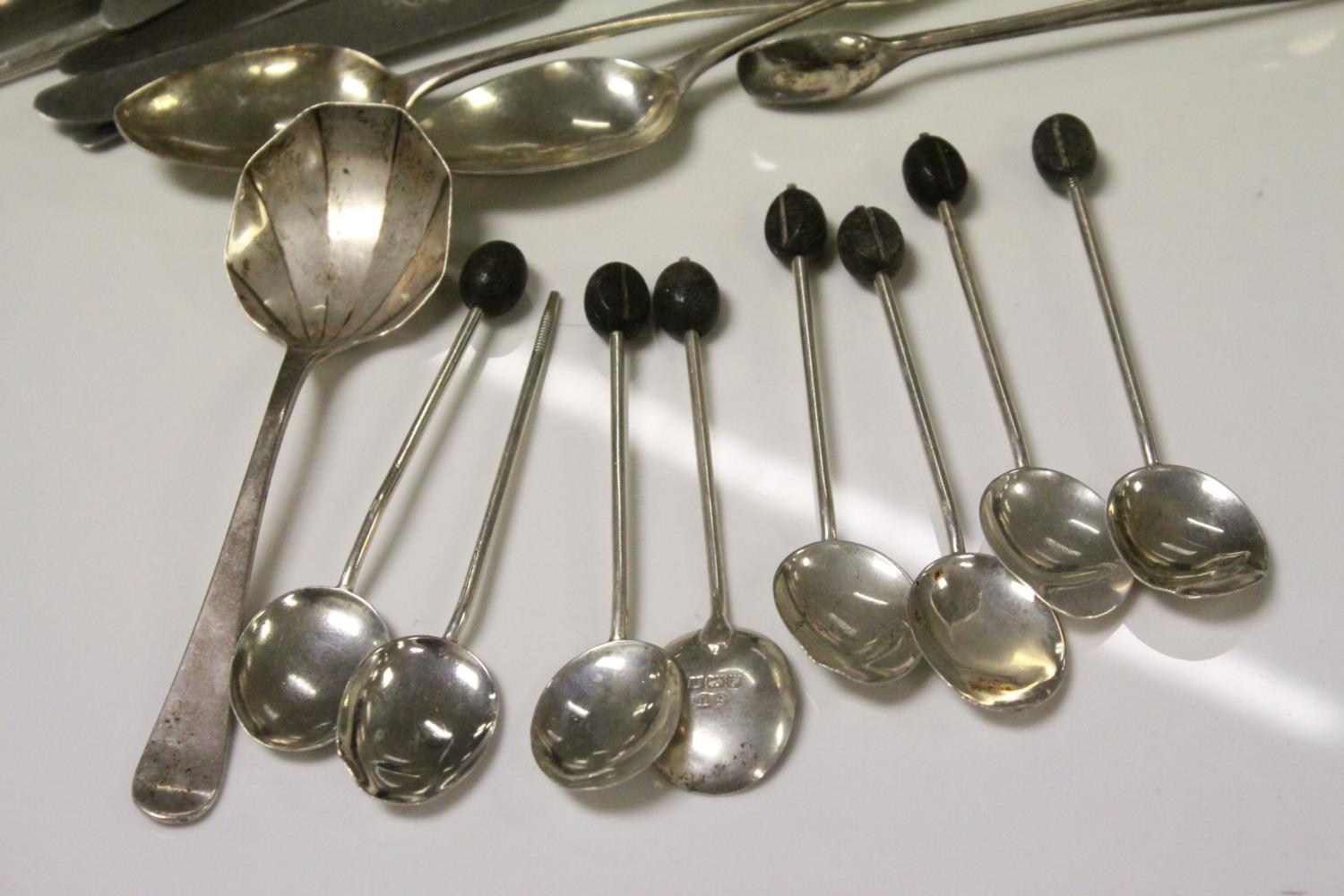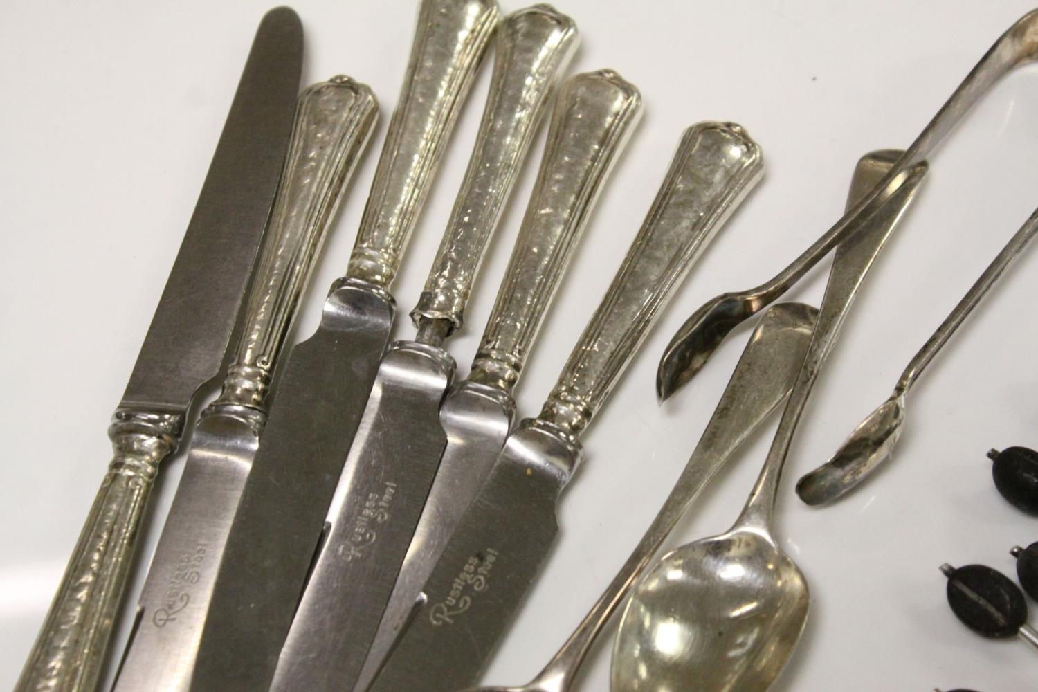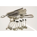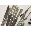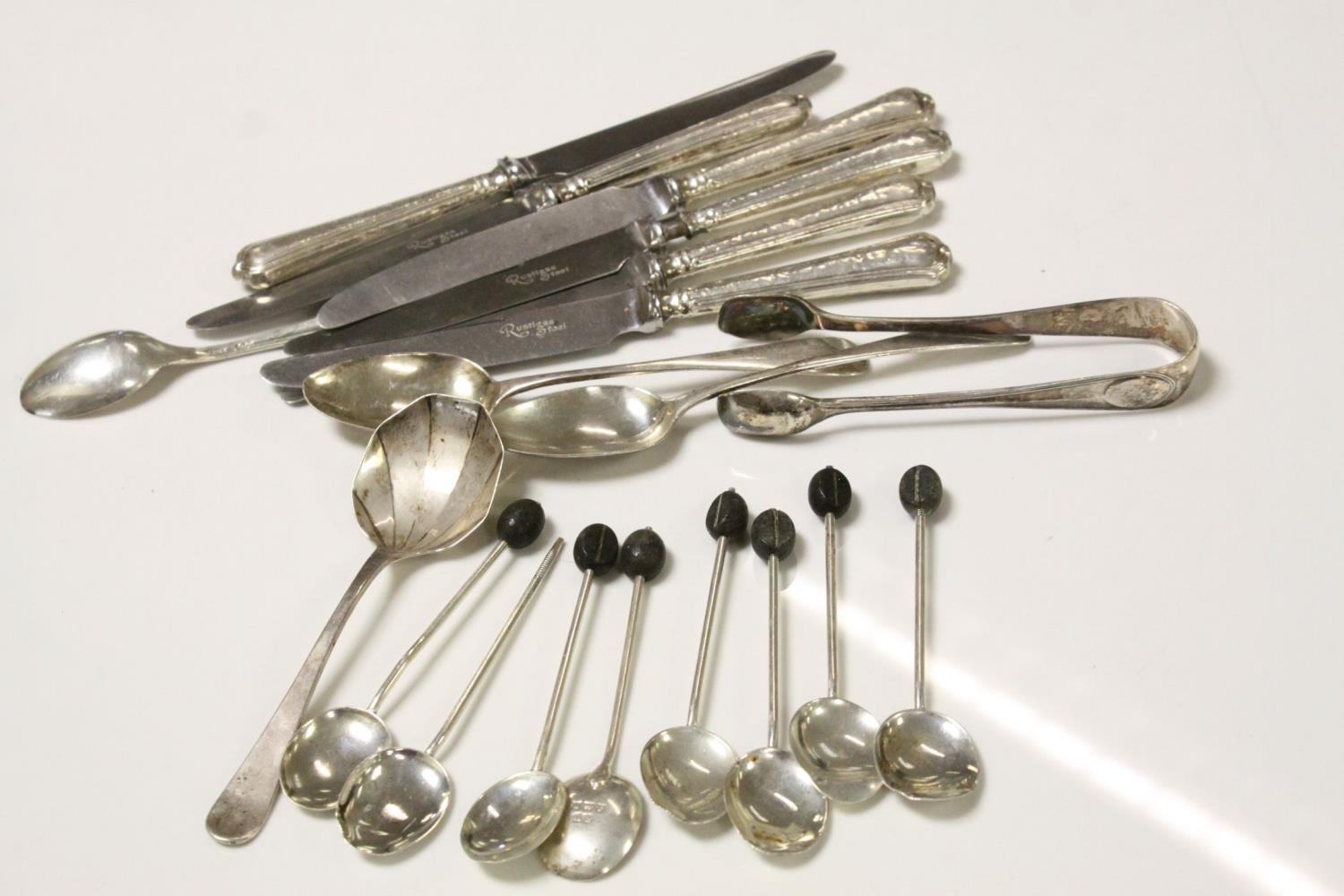 Quantity of Silver Cutlery including Six Knives with Silver Handles, Sugar Tongs, Four Teaspoons and Eight Coffee Bean Spoons