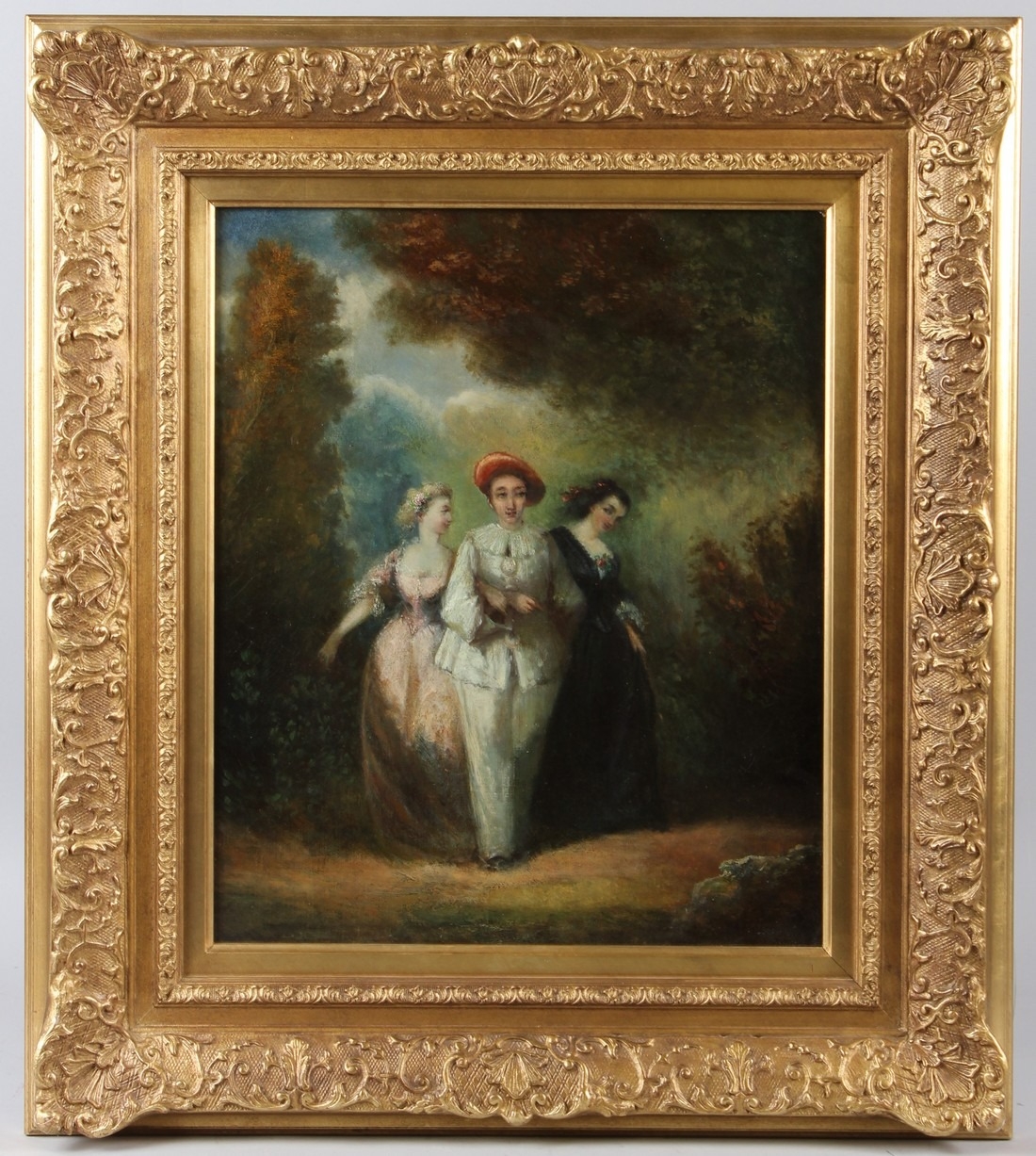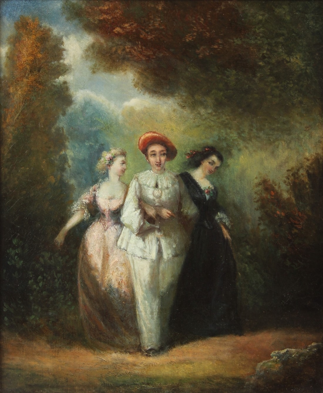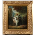 CONTINENTAL SCHOOL (19TH CENTURY) Two ladies with an escort on a woodland path oil on canvas 44 x 36.5cm