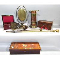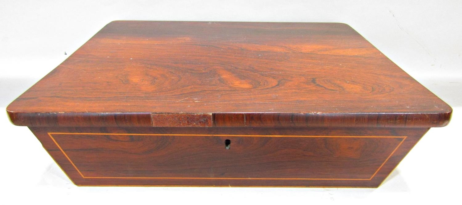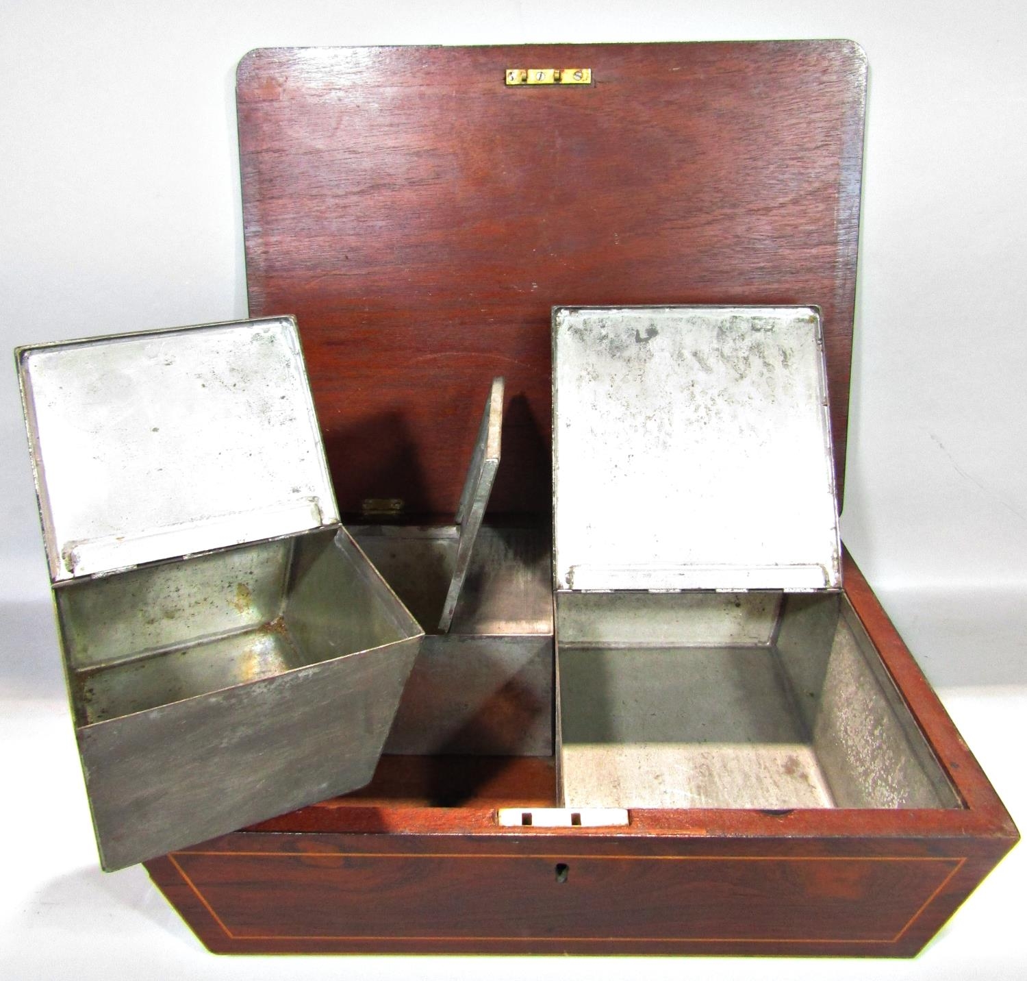 A rosewood caddy with rising and closing lid enclosing three zinc containers