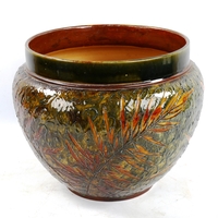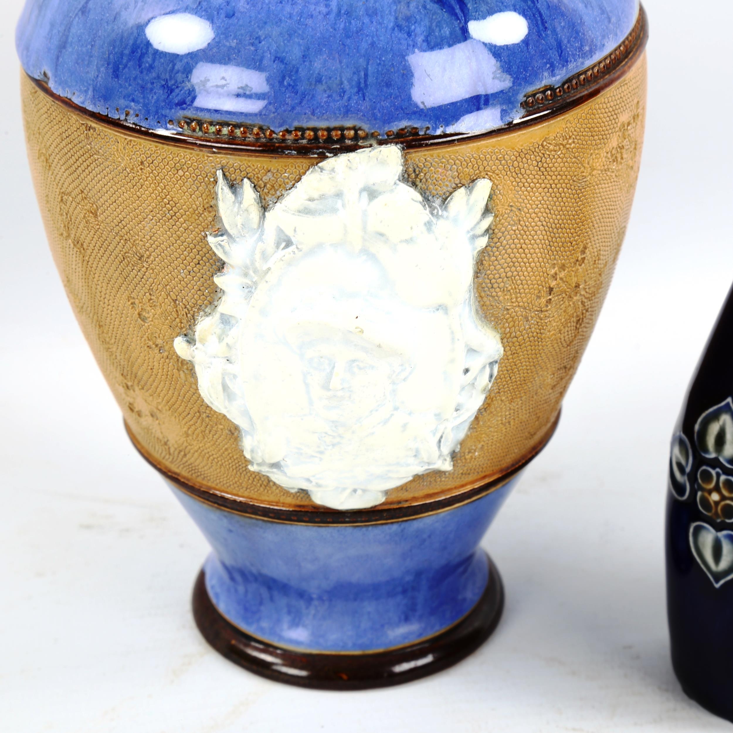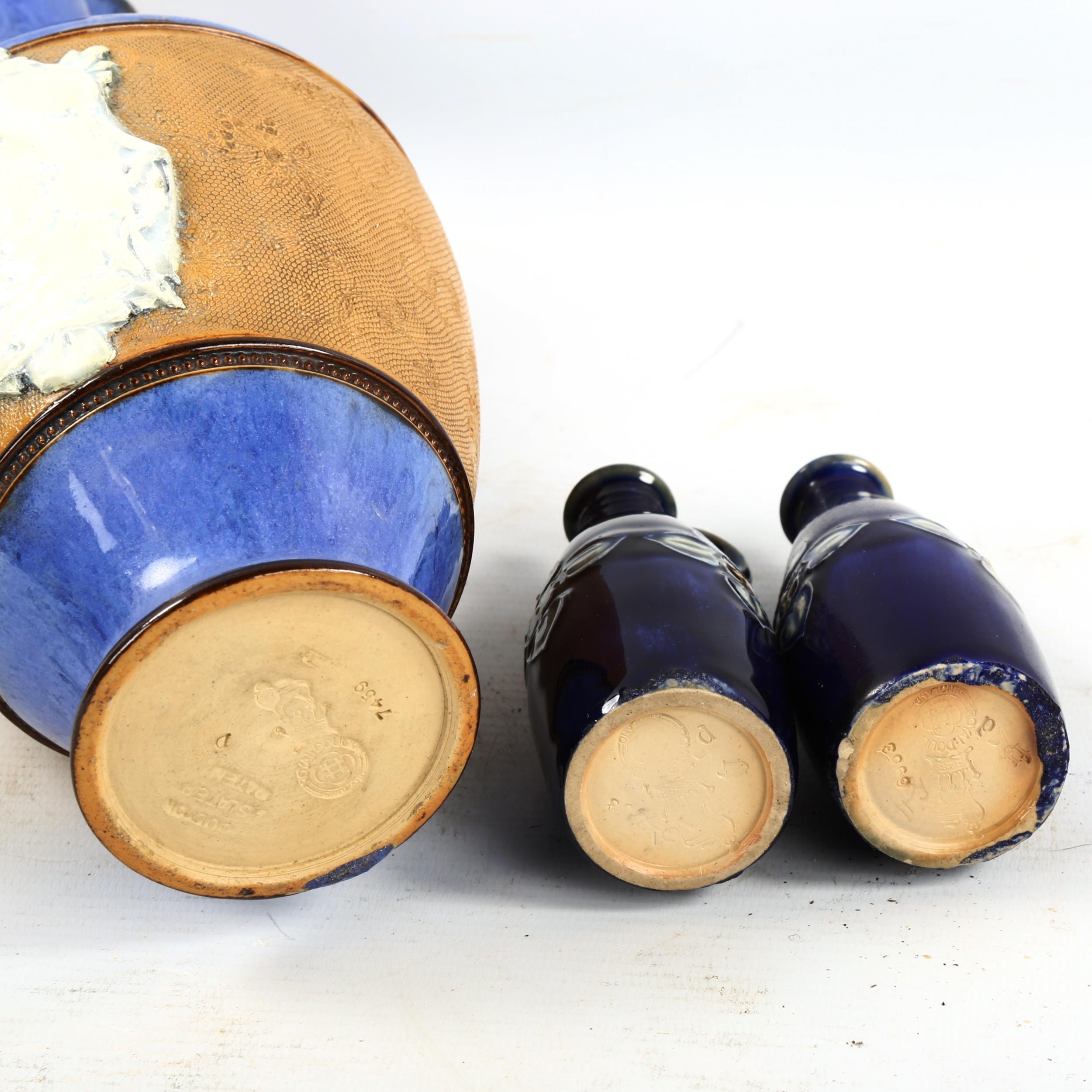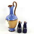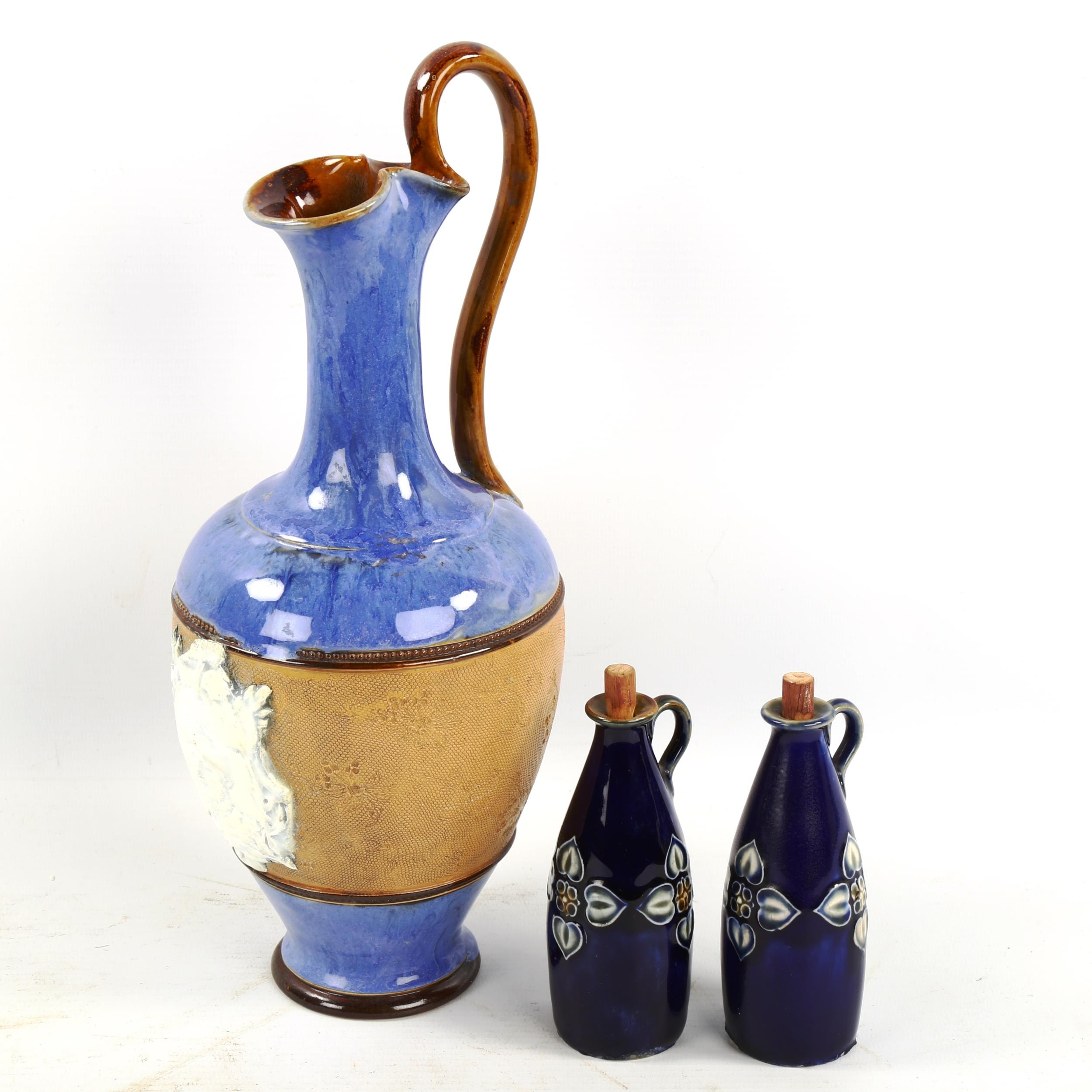 A Royal Doulton ewer with relief Jockey plaque and two Doulton bottles, tallest 29cm