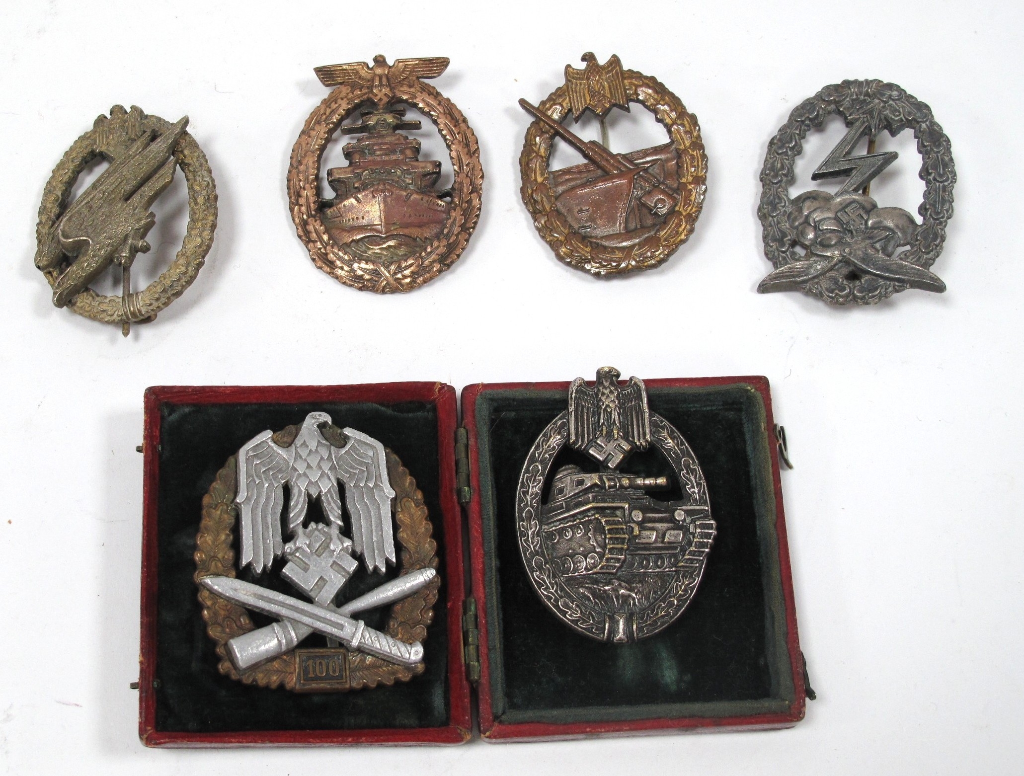 Collectables, reproduction German Combat Awards, including Luftwaffe Paratroops badge, Luftwaffe Ground Combat badge, Coastal Artillery badge, High Seas Fleet badge, Panzer Assault badge, and General Assault 100 Actions badge.