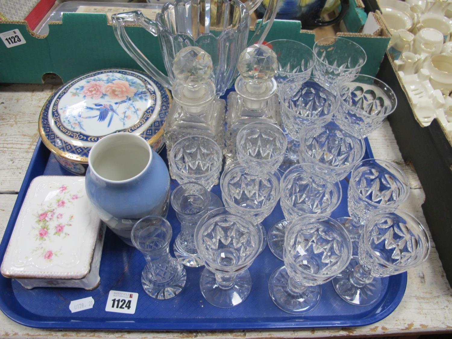 Royal Copenhagen Flying Goose Vase, 1087, Tudor drinking glasses, decanters, Paragon 'Victoriana Rose' trinket box, etc:- One Tray