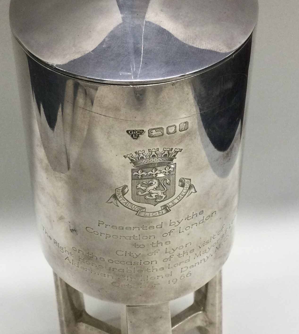 A silver presentation lidded goblet. London 1966. Designed by AG Styles. Retailed by Garrard & Co. Approx. 1081 grams. Est. £2000 - £3000.