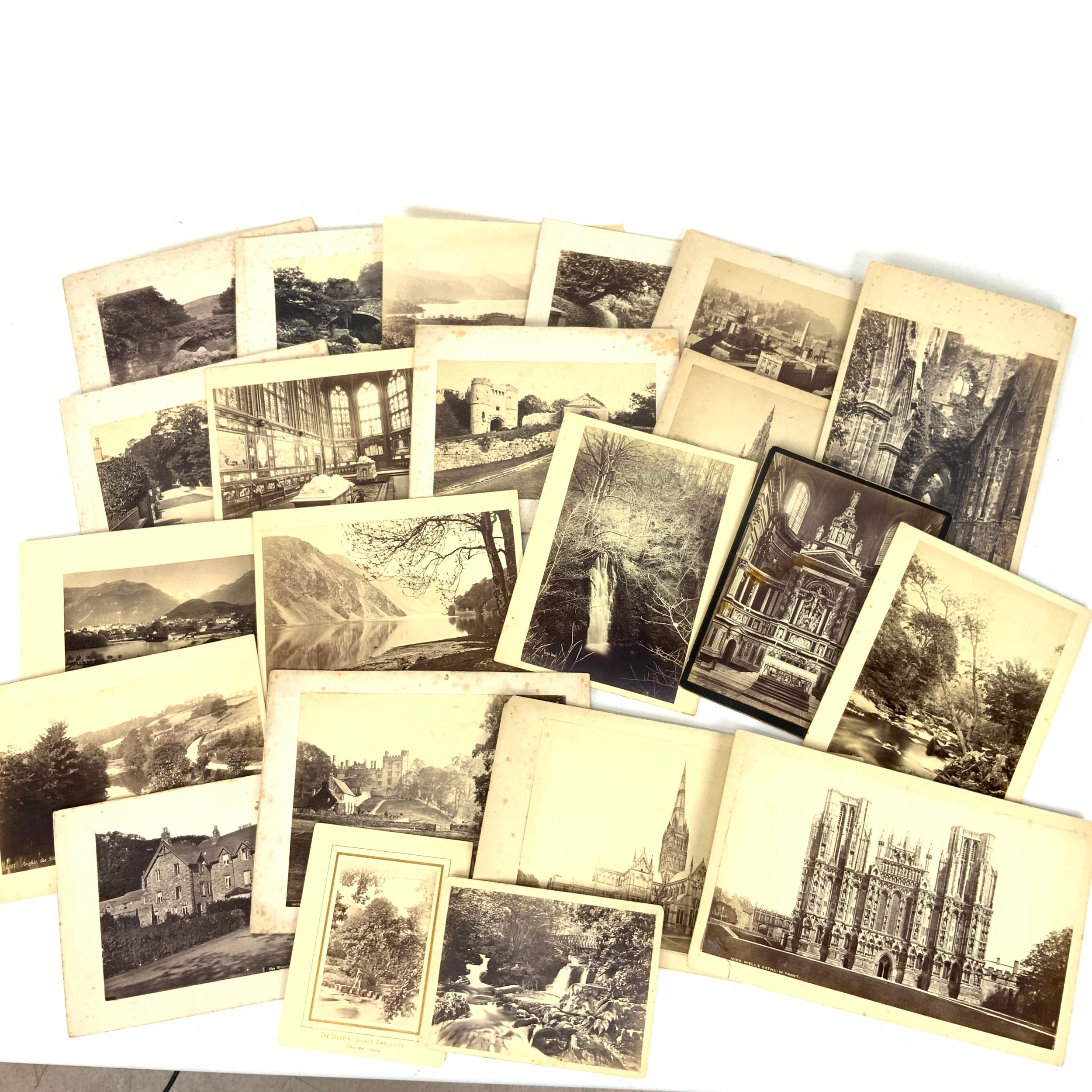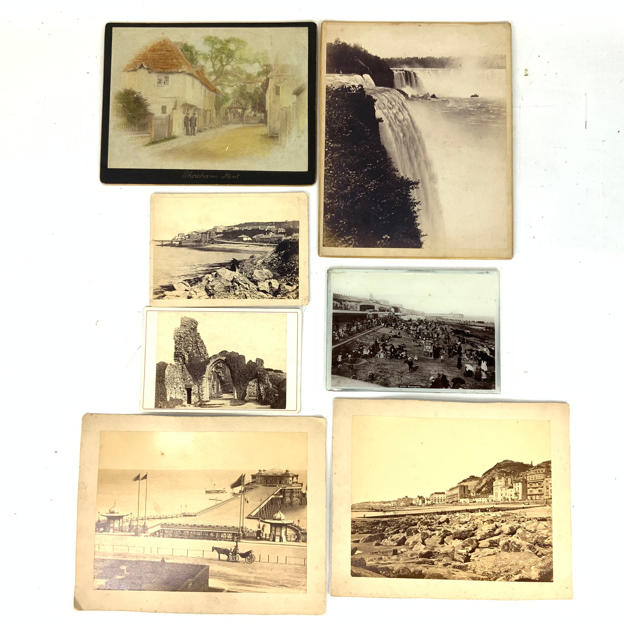 19th Century mounted photographs. Includes: Clevedon, Ramsgate, Hastings, Shoreham, Niagara Falls (dated 1888), Betws-y-Coed, Haddon Hall, Edinburgh, English cathedrals, flowers and others. (Approx 34)
