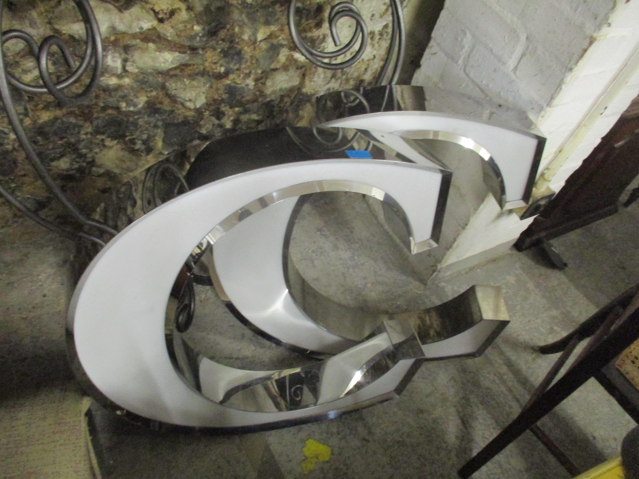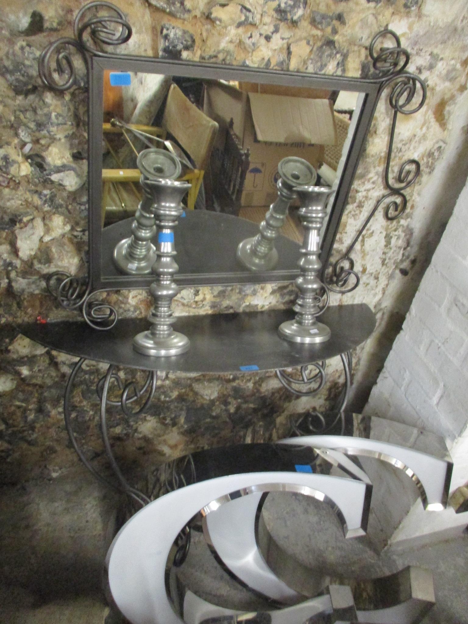 A modern contemporary silver coloured hall stand, together with a matching wall mirror, two candlesticks and two decorative 'C' ornaments