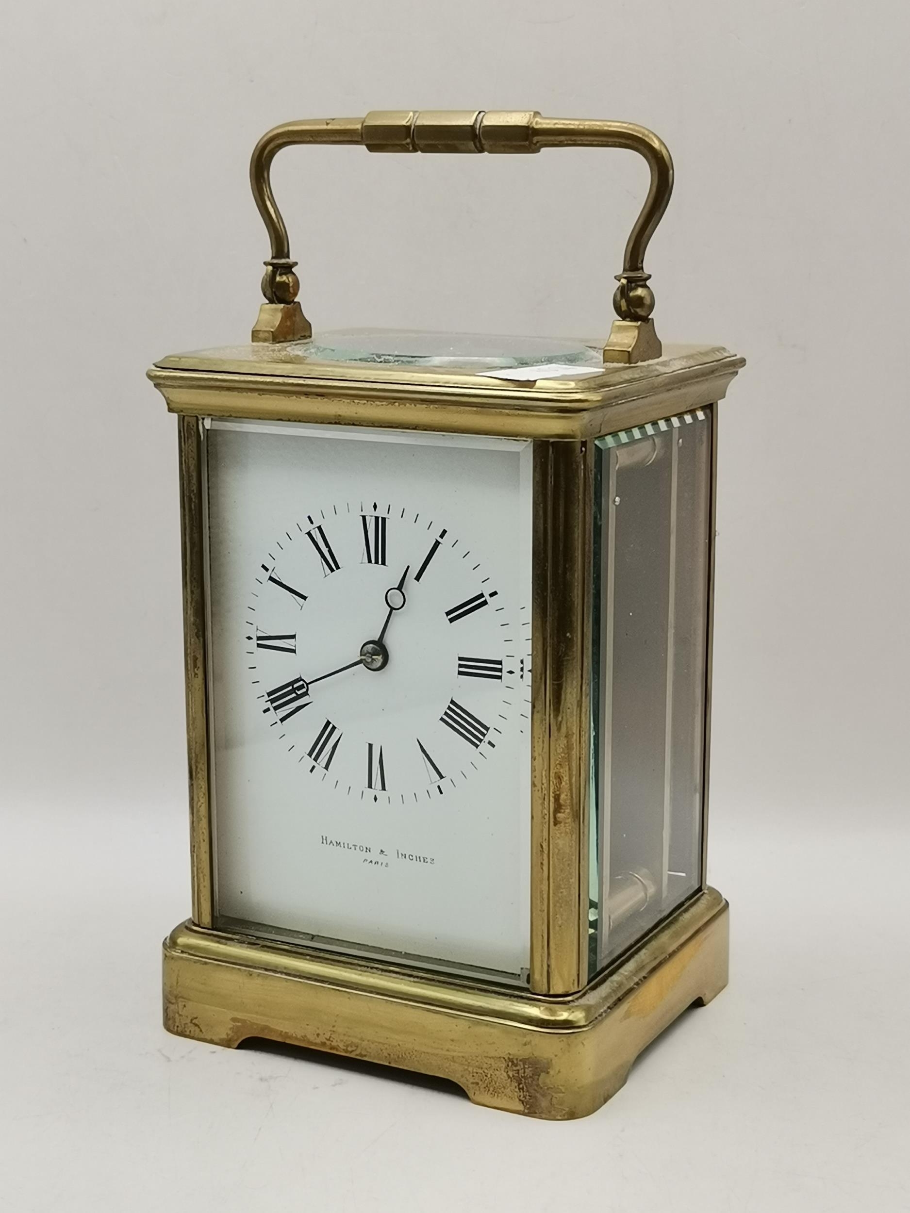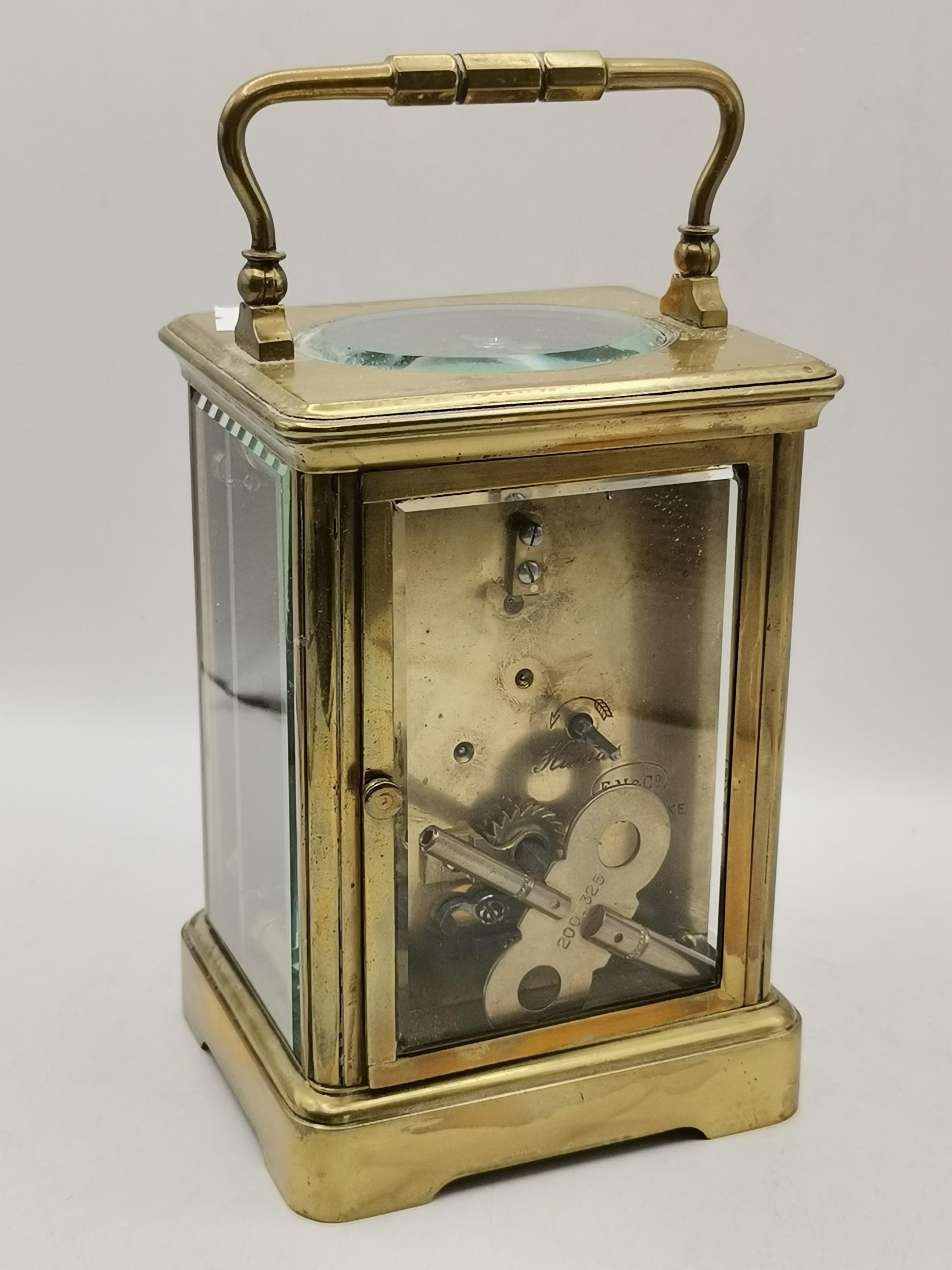 A brass carriage clock made by Rappord Est. 1898 plus a Mathew Norman London brass carriage clock