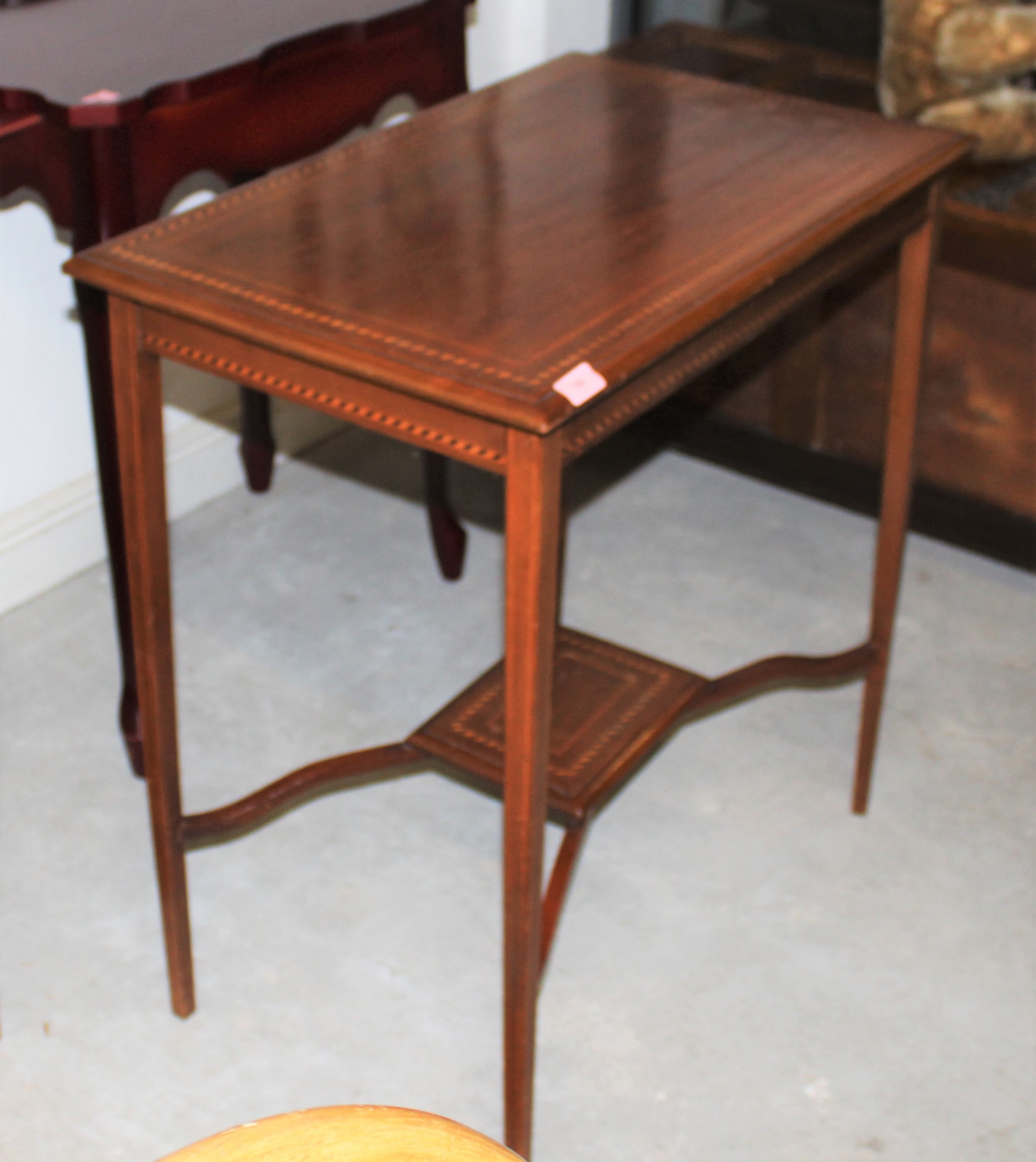 Mahogany with Satin-Wood and Ebony Inlays Hall Table having Raised Under-Shelf (some wood loss to cross stretcher)