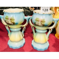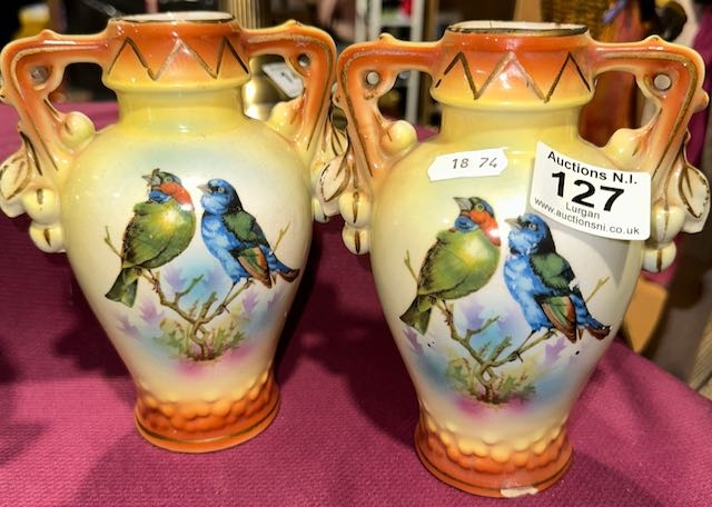 Pair of Antique Handled Bird Detail Vases with H Marked on Base