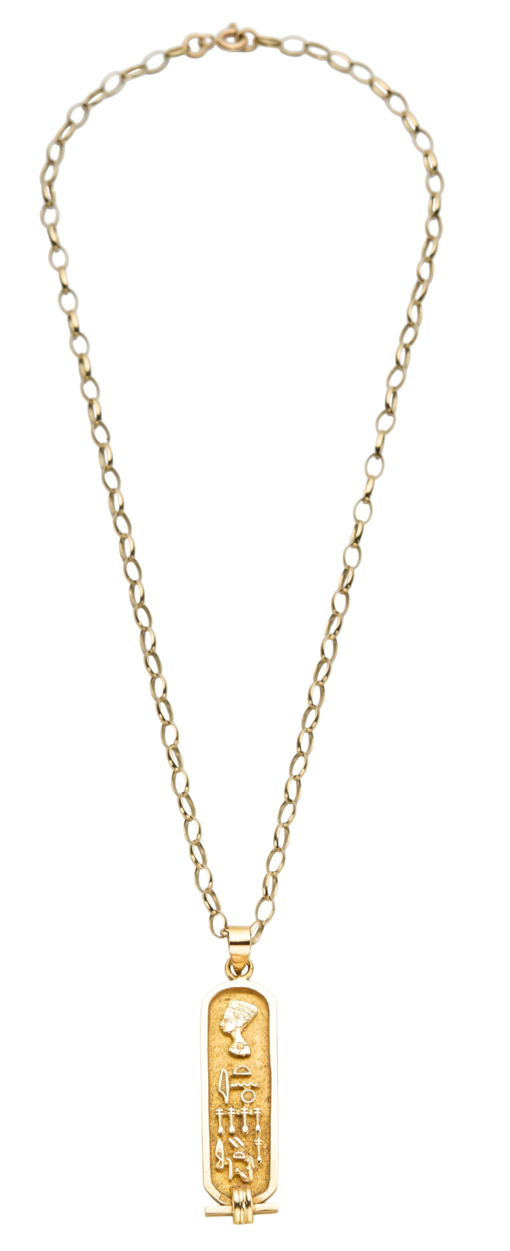 the pendant with 48mm drop, unmarked, surface testing as 18ct, on a chain, the bolt ring clasp stamped 375, approximately 9.61 grams