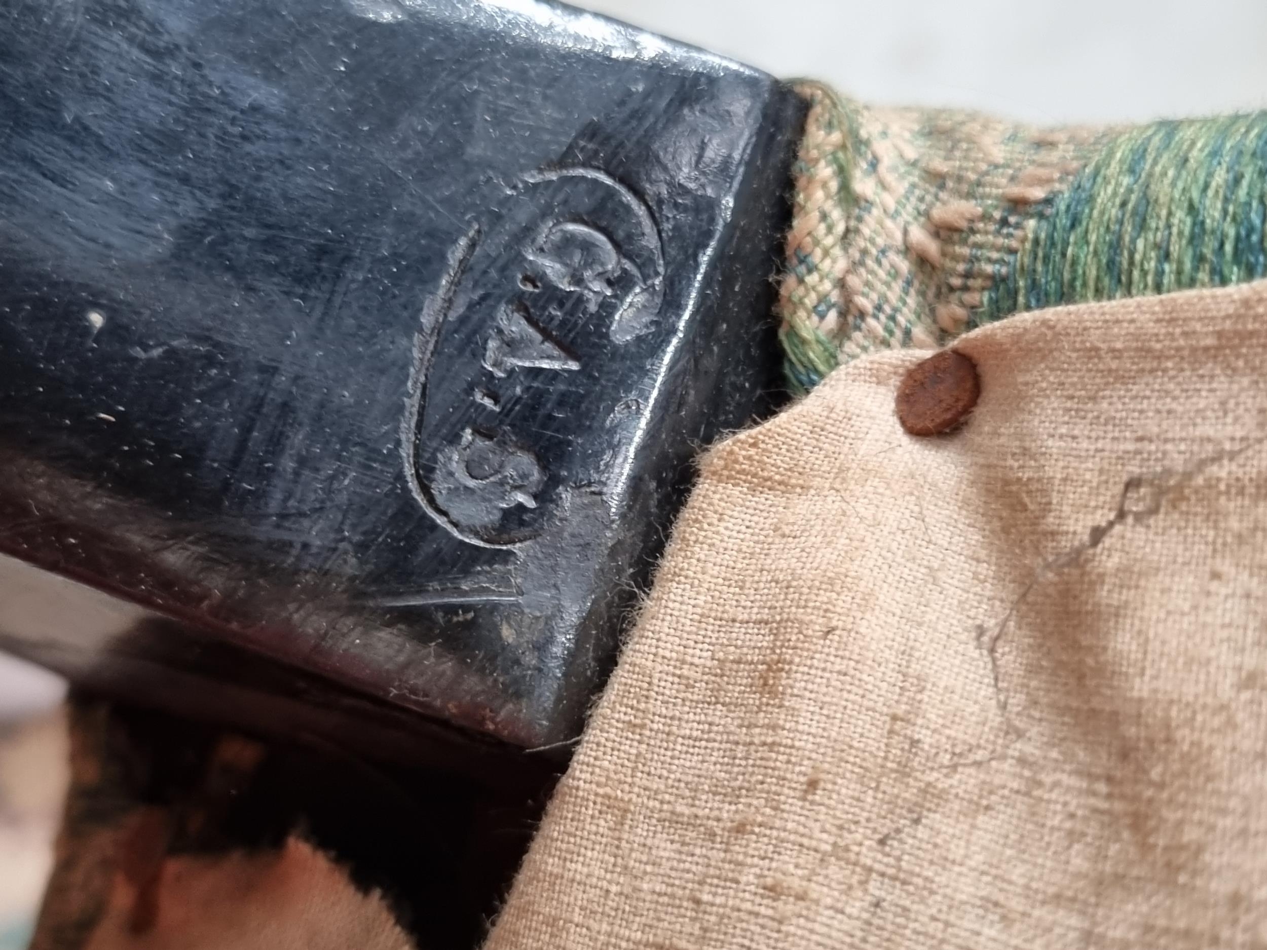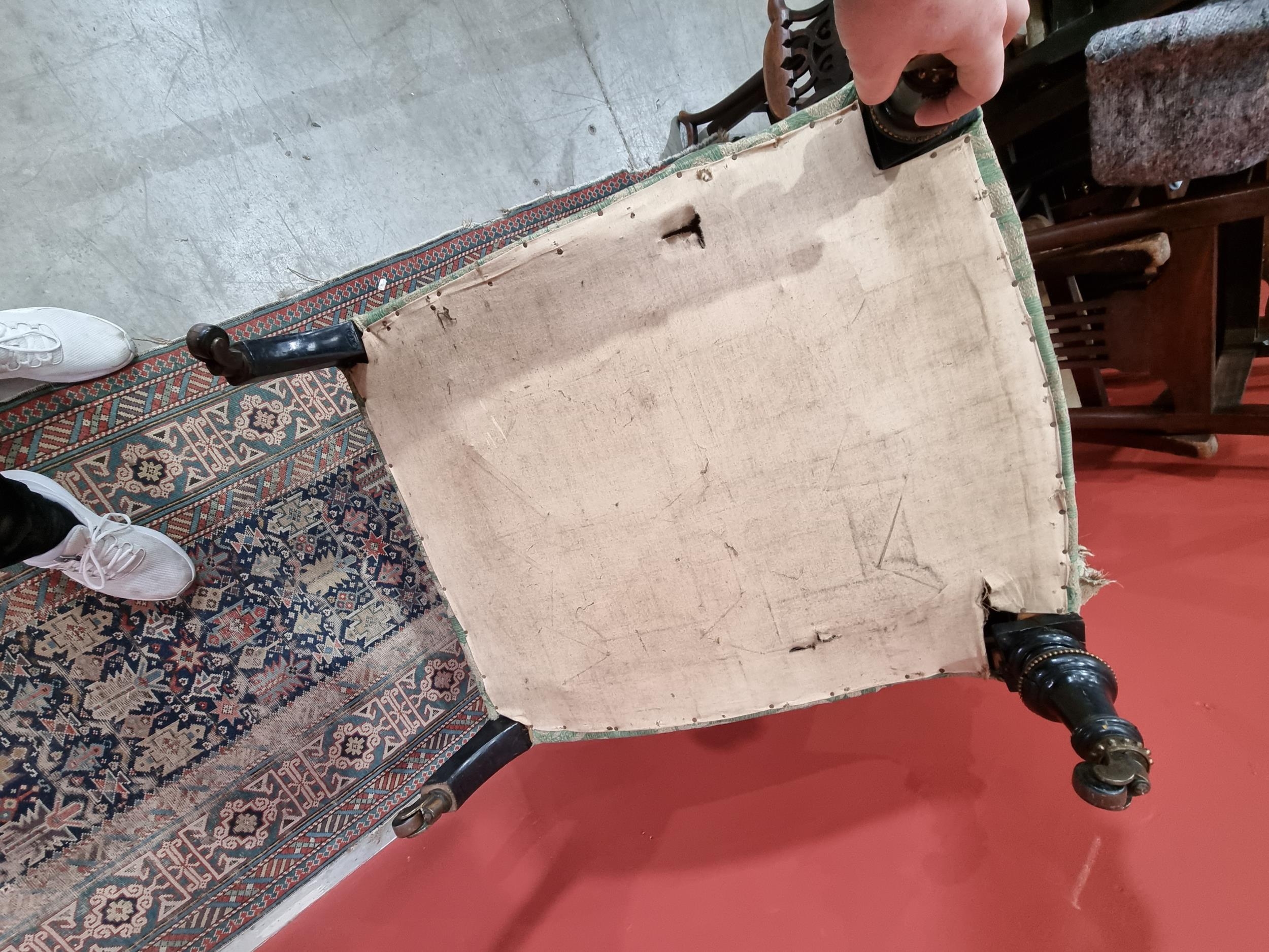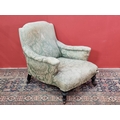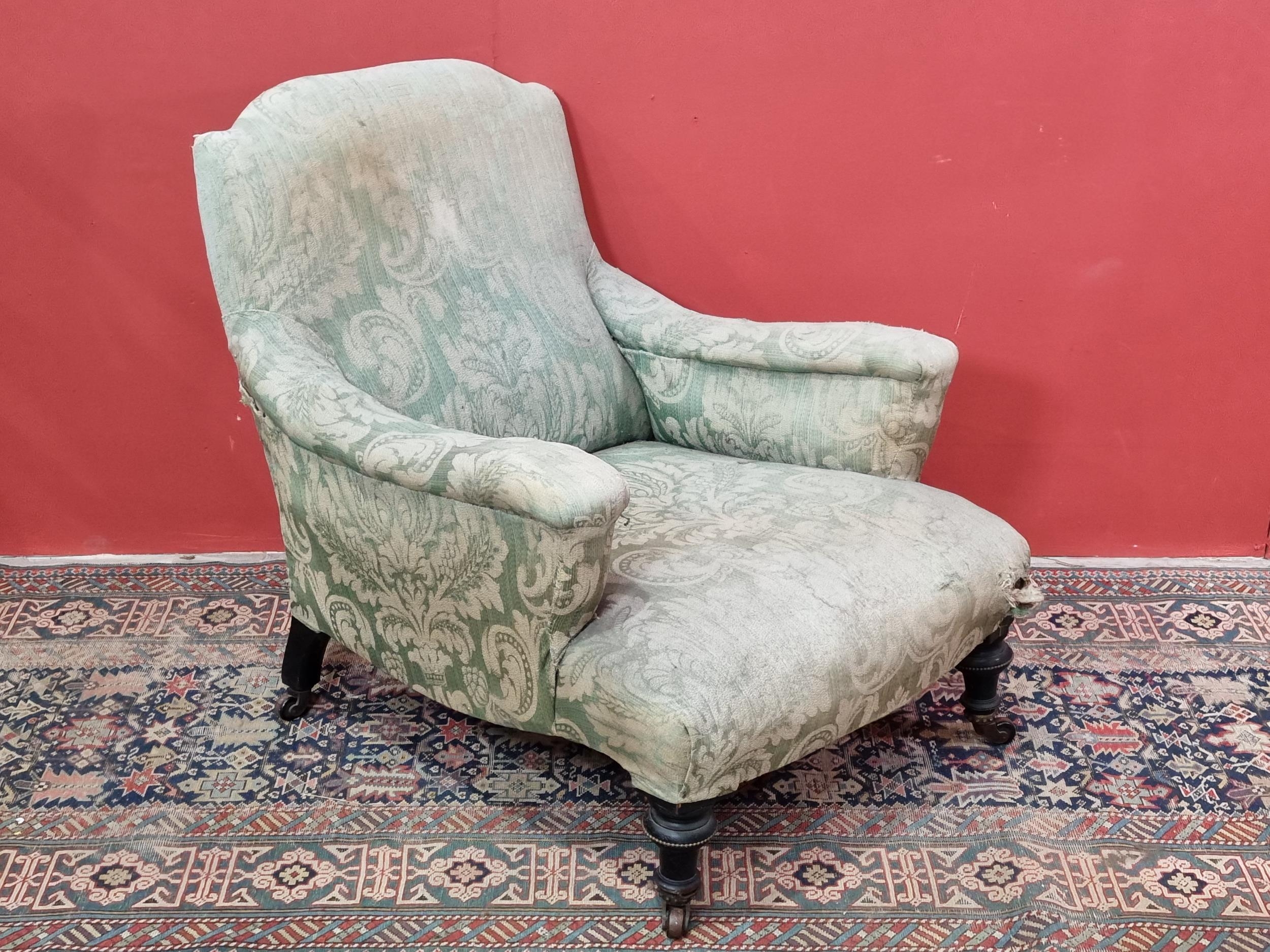 A green and cream upholstered deep seated Armchair with acanthus leaf type decoration, raised on turned ebonised front supports and casters, rear left leg bearing oval maker's mark G.A.S., A/F, (R3)