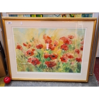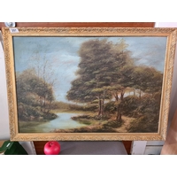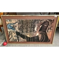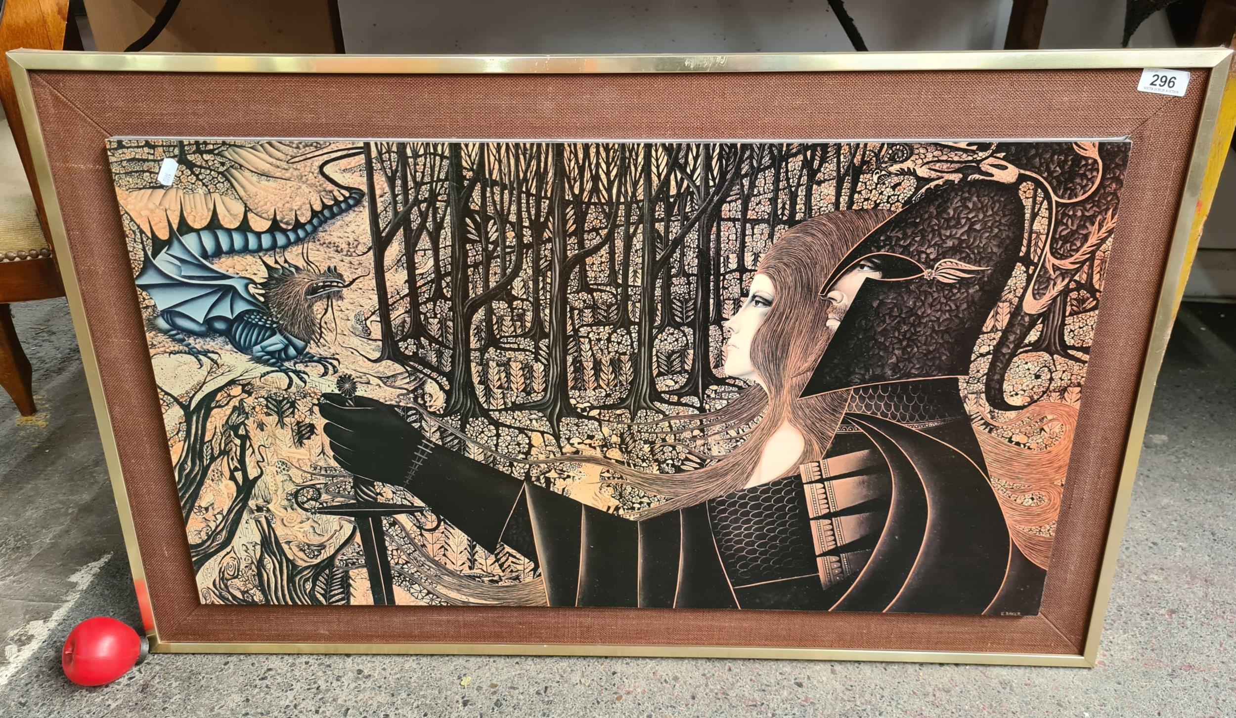 A classic print on board of a 1970s Eugene Ames Baker (1928-1982) titled 'Another time'. Features a medieval knight, maiden and a dragon. Housed in a brass frame with linen matting.