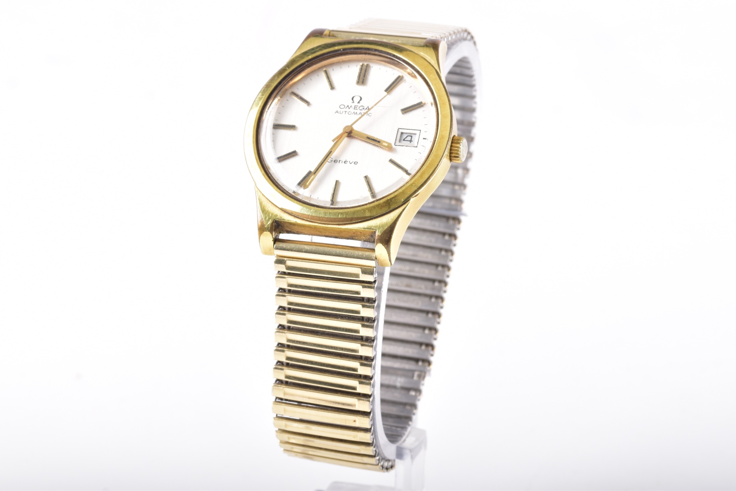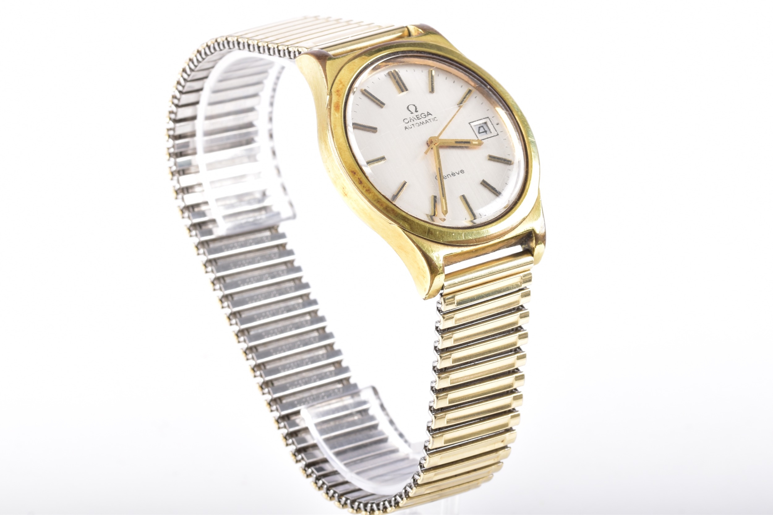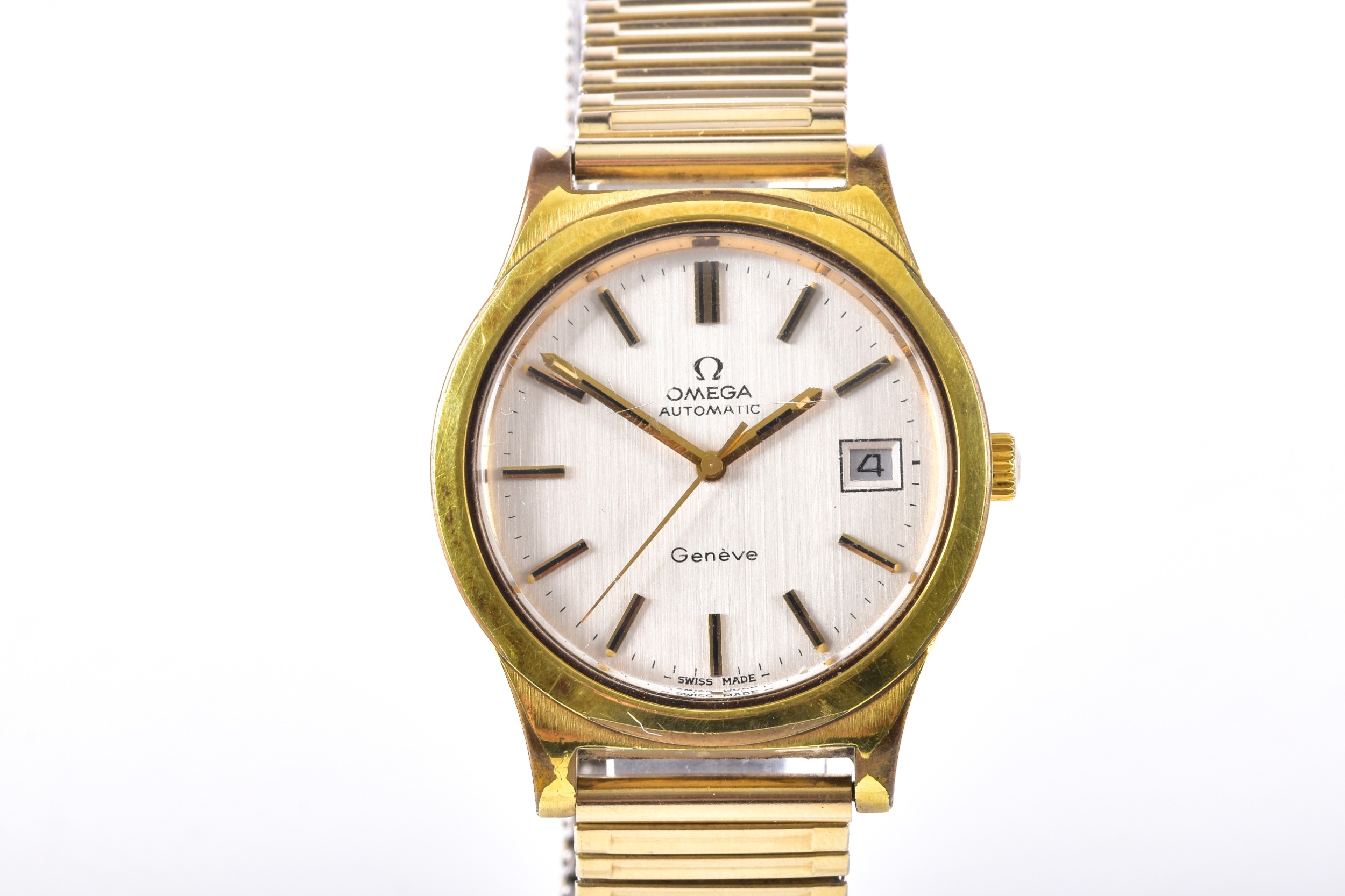 A 1970's Omega Geneve Automatic gold plated wristwatch, reference 166 0168, the silvered dial with baton indices, date aperture, Calibre 1012 movement, personalised engraved to case back, case size 35 mm, on a expandable bracelet. Serial number 37676007.