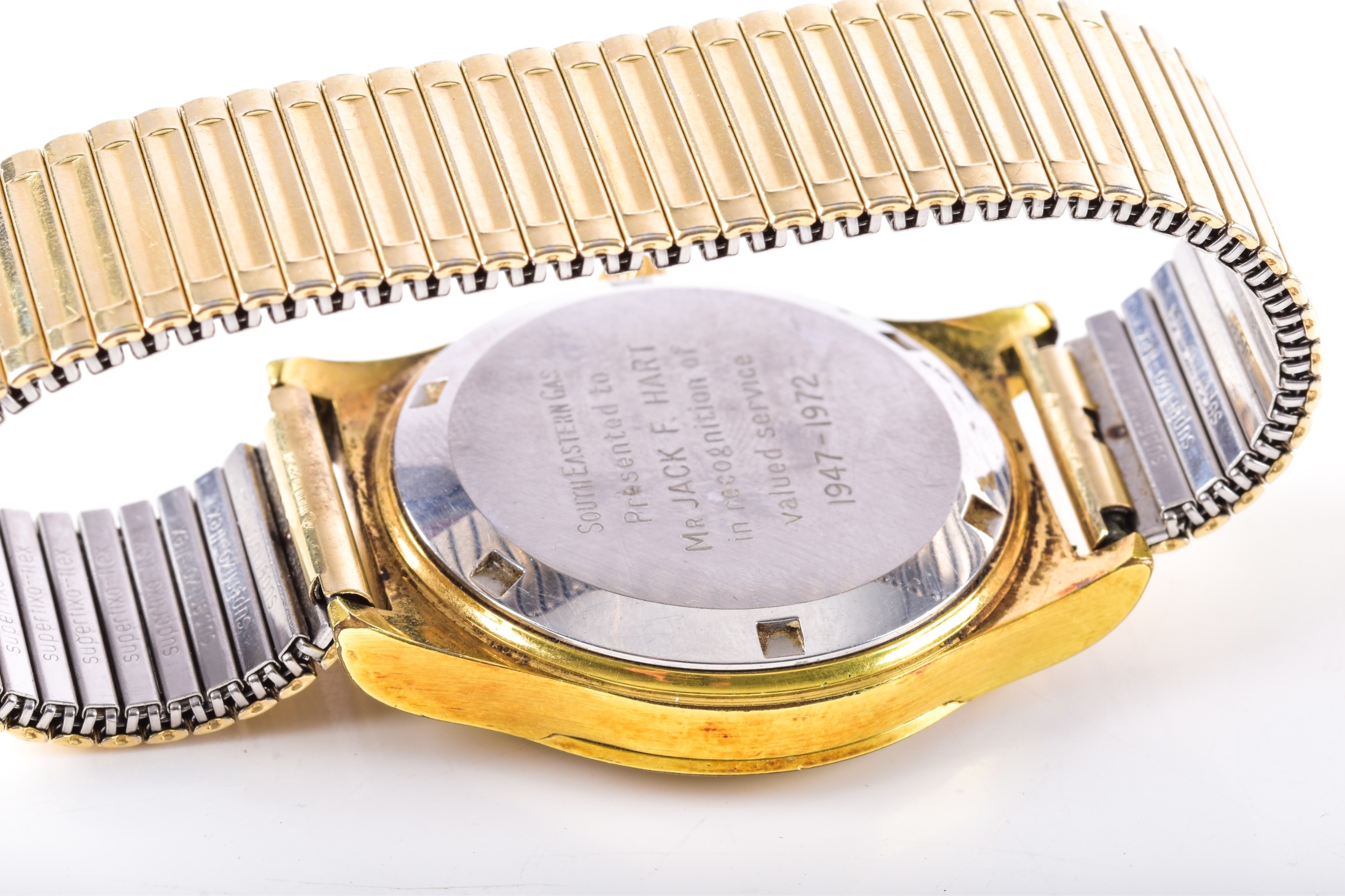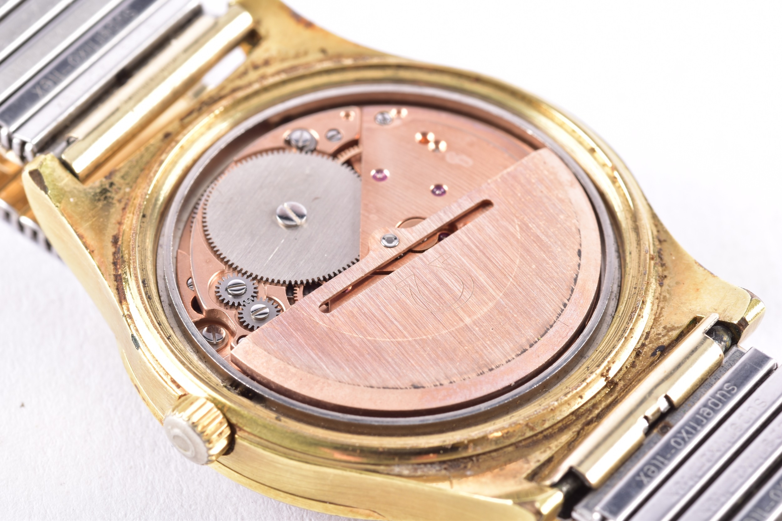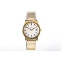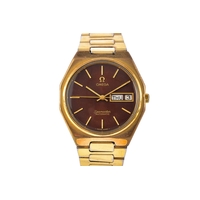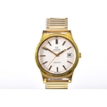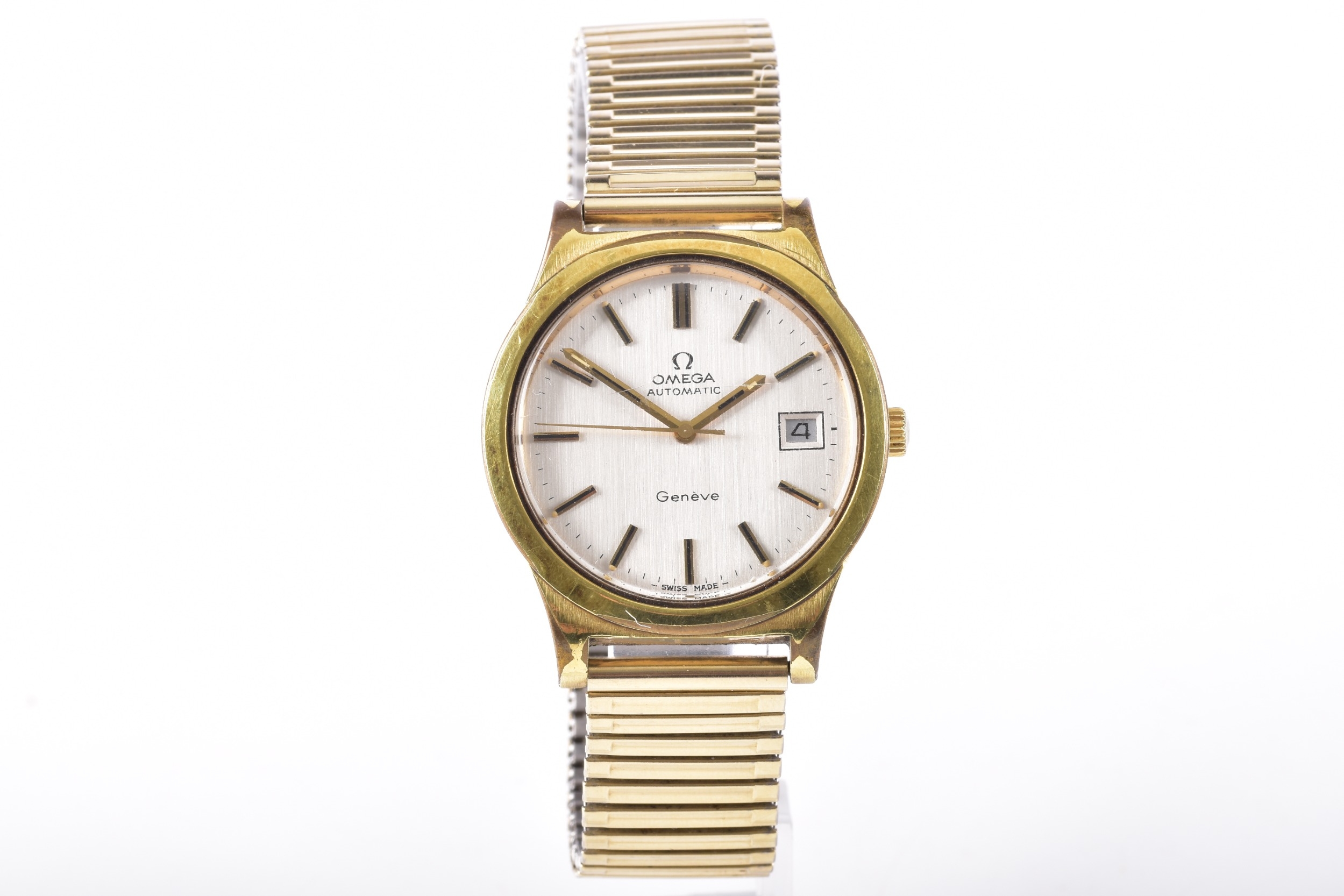 A 1970's Omega Geneve Automatic gold plated wristwatch, reference 166 0168, the silvered dial with baton indices, date aperture, Calibre 1012 movement, personalised engraved to case back, case size 35 mm, on a expandable bracelet. Serial number 37676007.