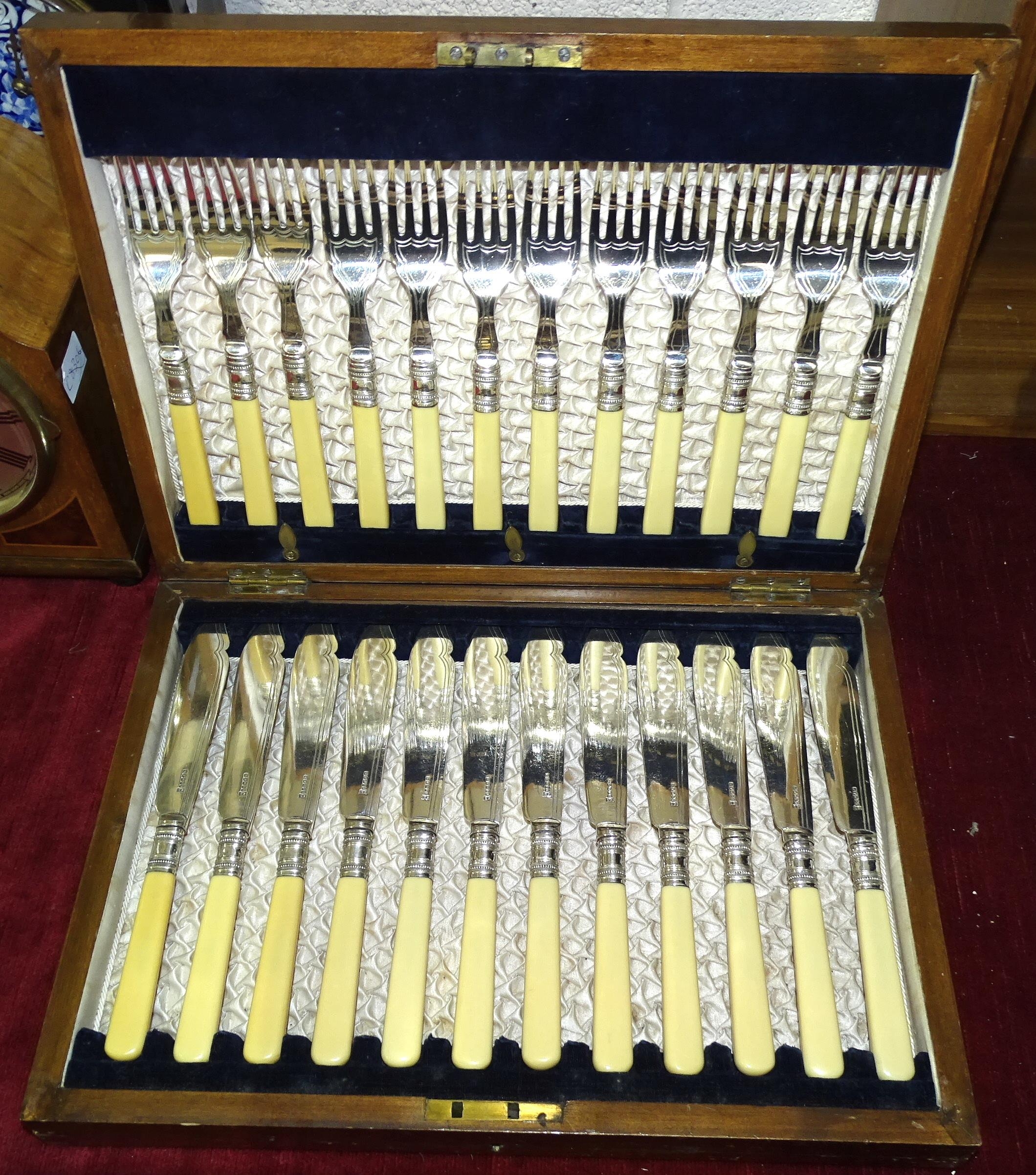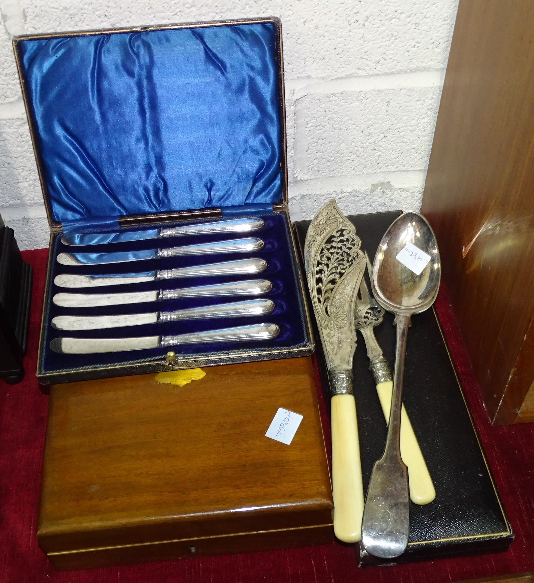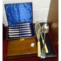 A set of twelve each plated fish knives and forks in fitted mahogany case, a cased set of six each plated fish knives and forks, a cased set of plated fish servers, a cased set of six silver-handled dessert knives, a pair of plated fish servers and a plated spoon.