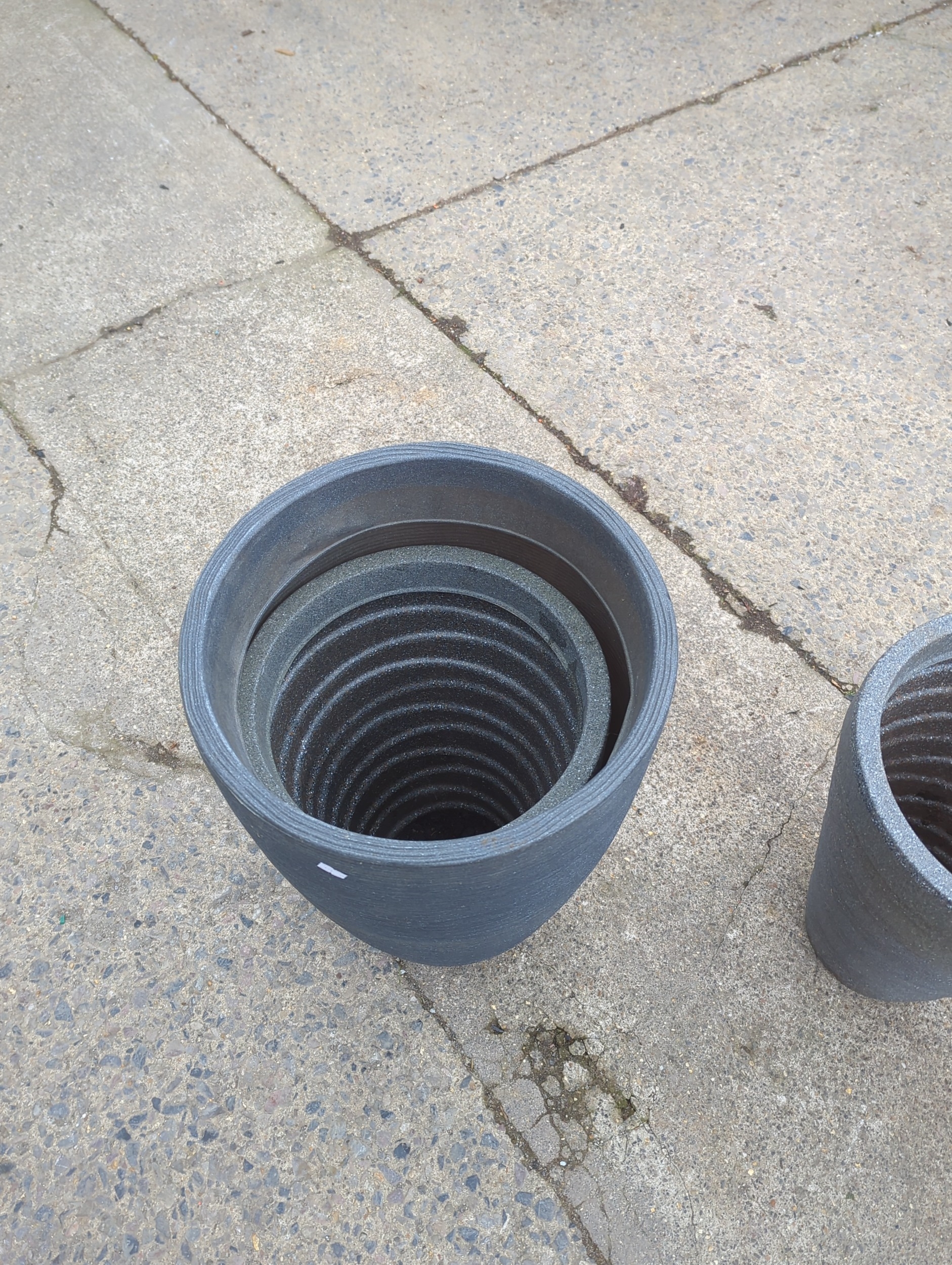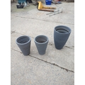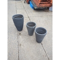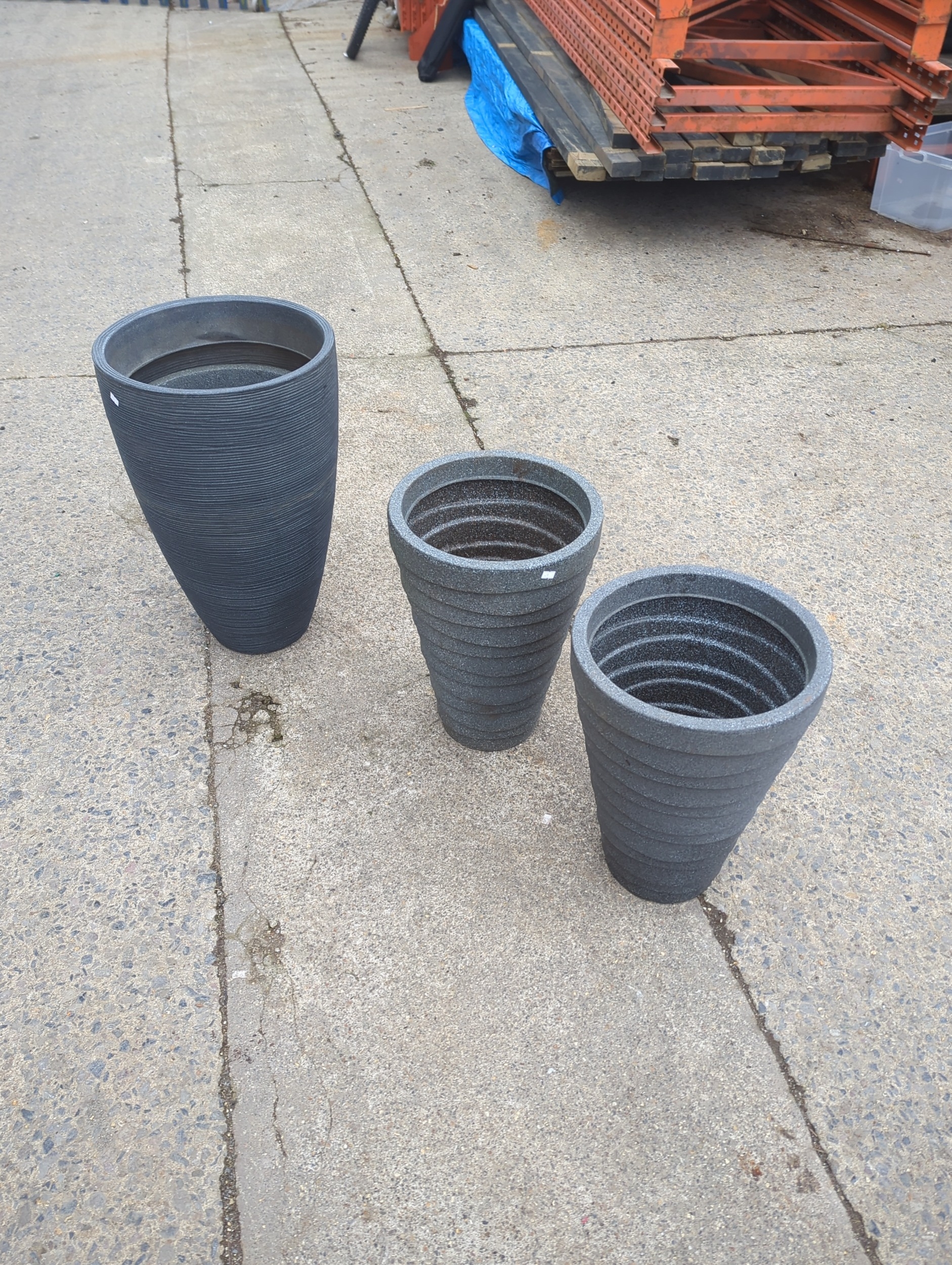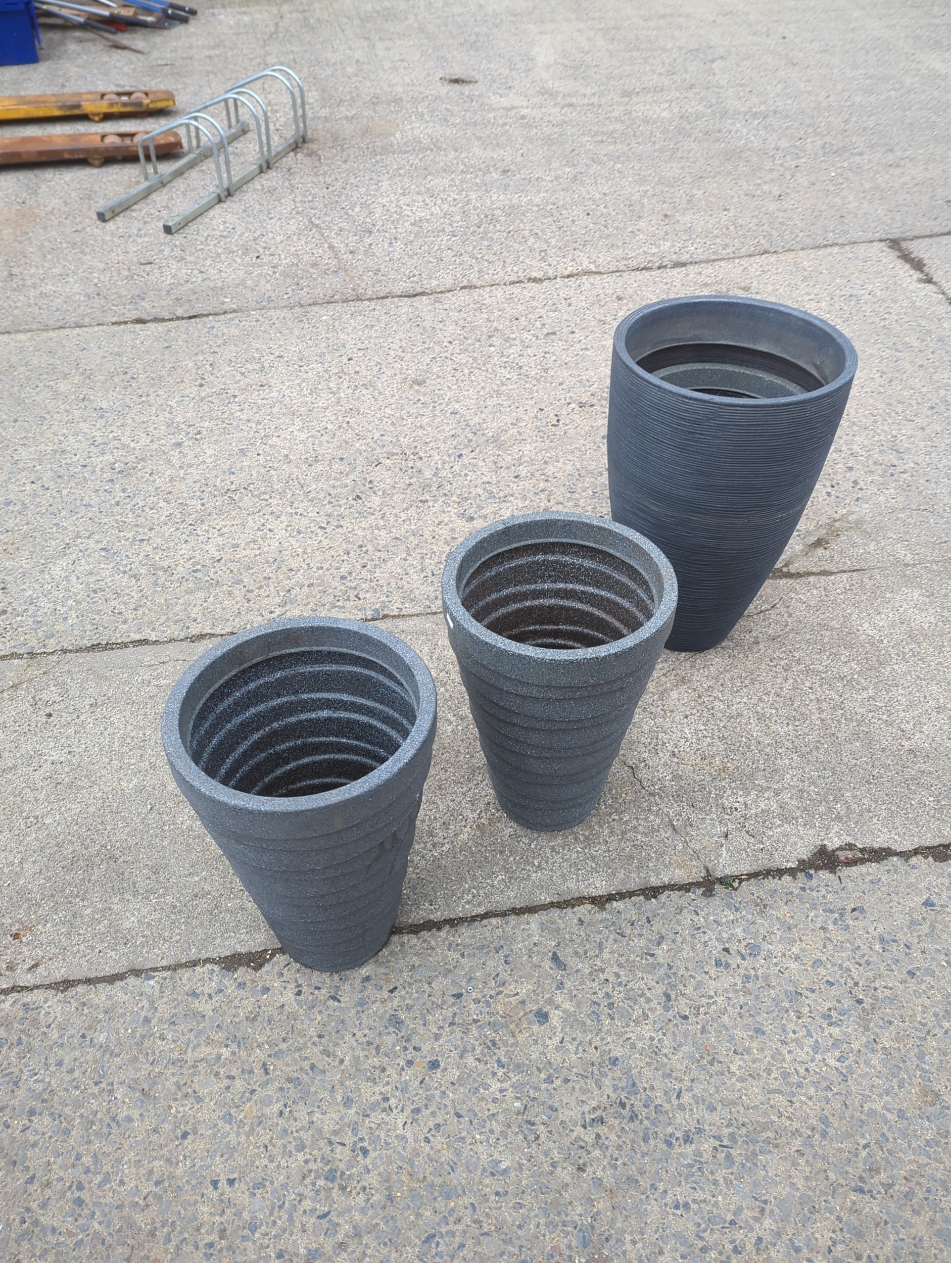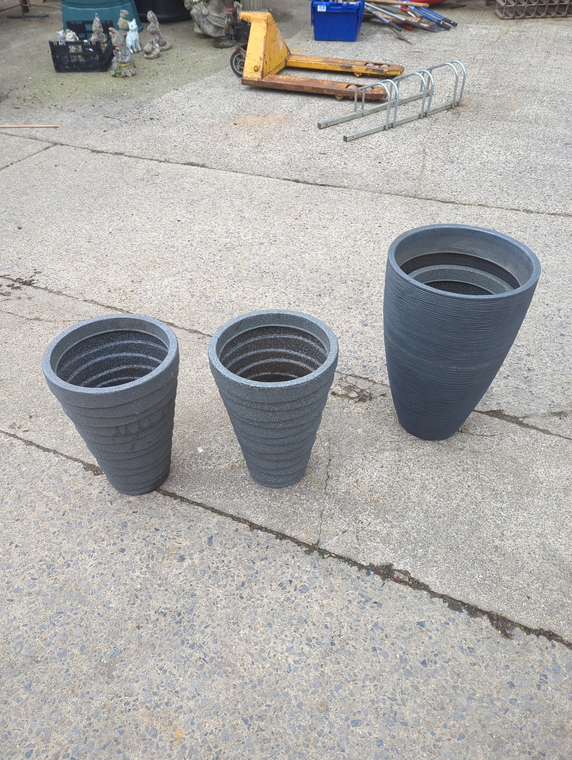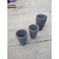 This lot includes three circular planters, each featuring a textured surface. The planters are designed to nest inside each other, offering space-saving storage. Suitable for outdoor use, they would make an attractive addition to any garden or patio.