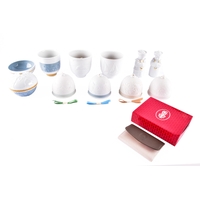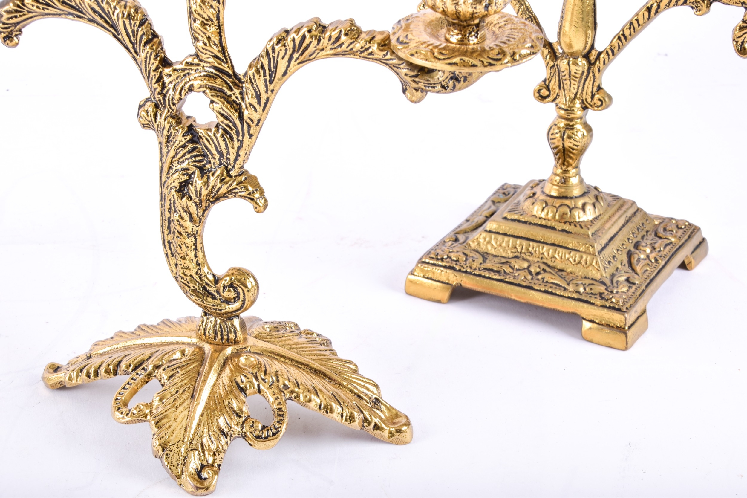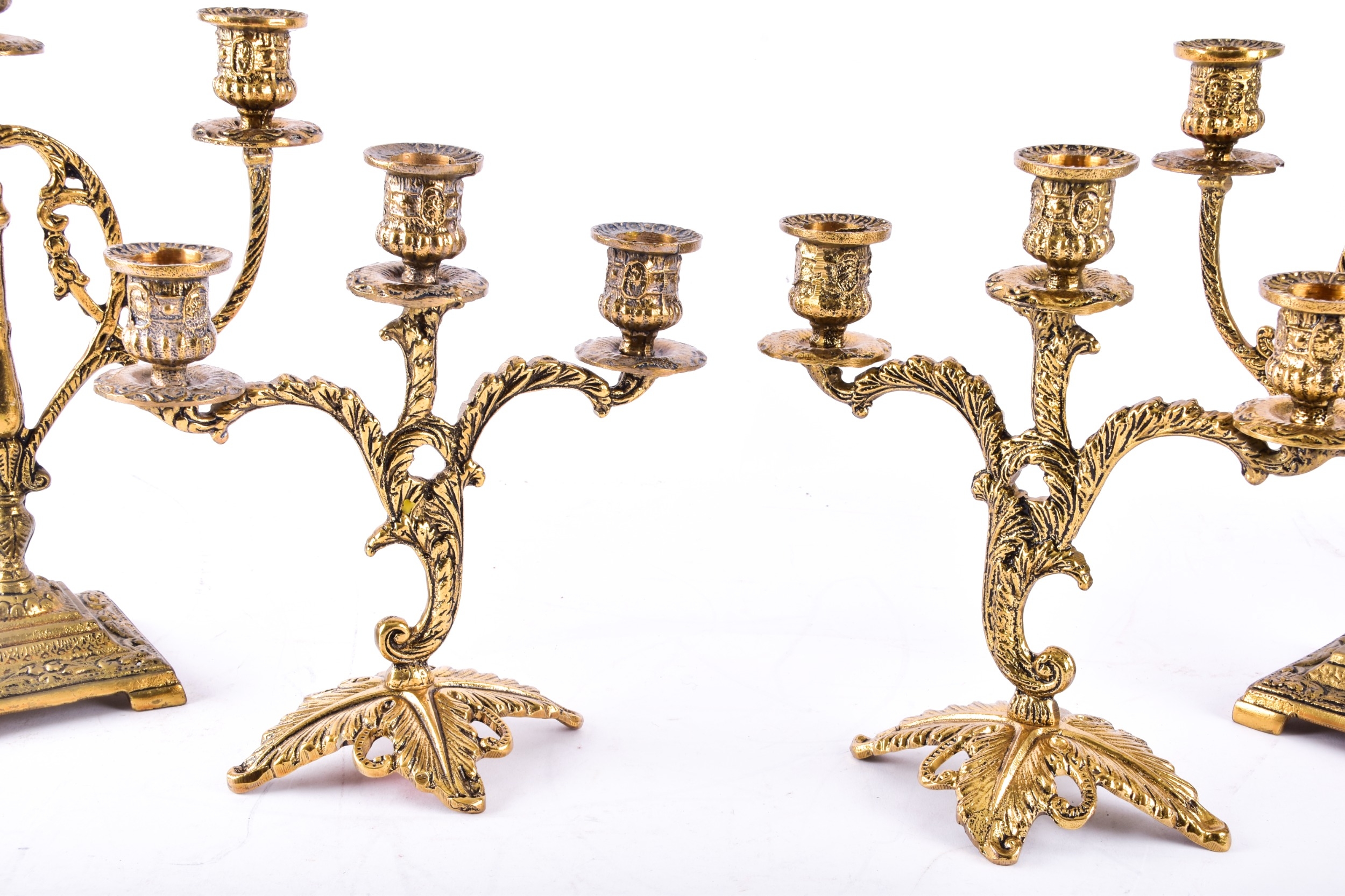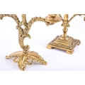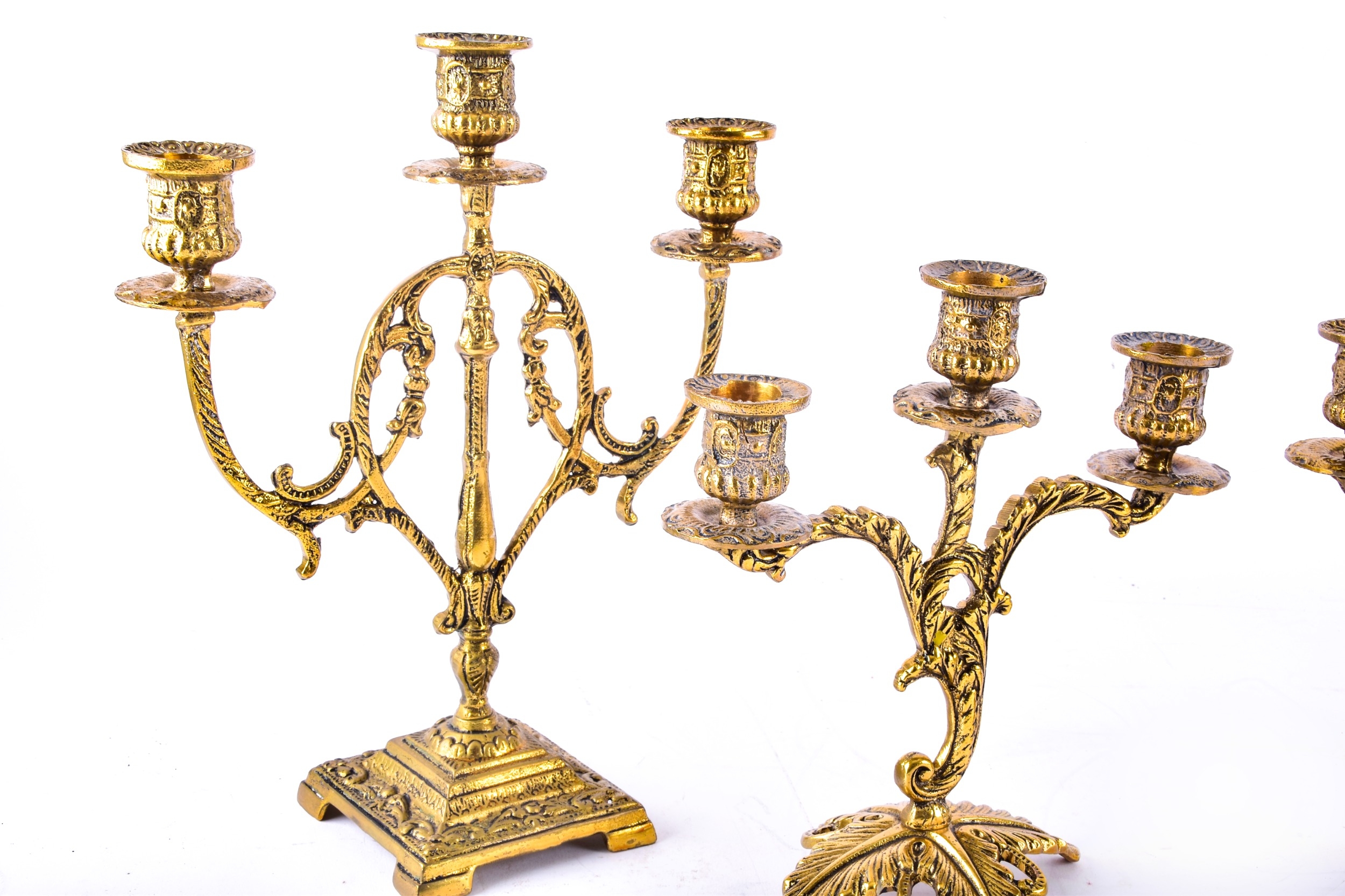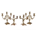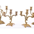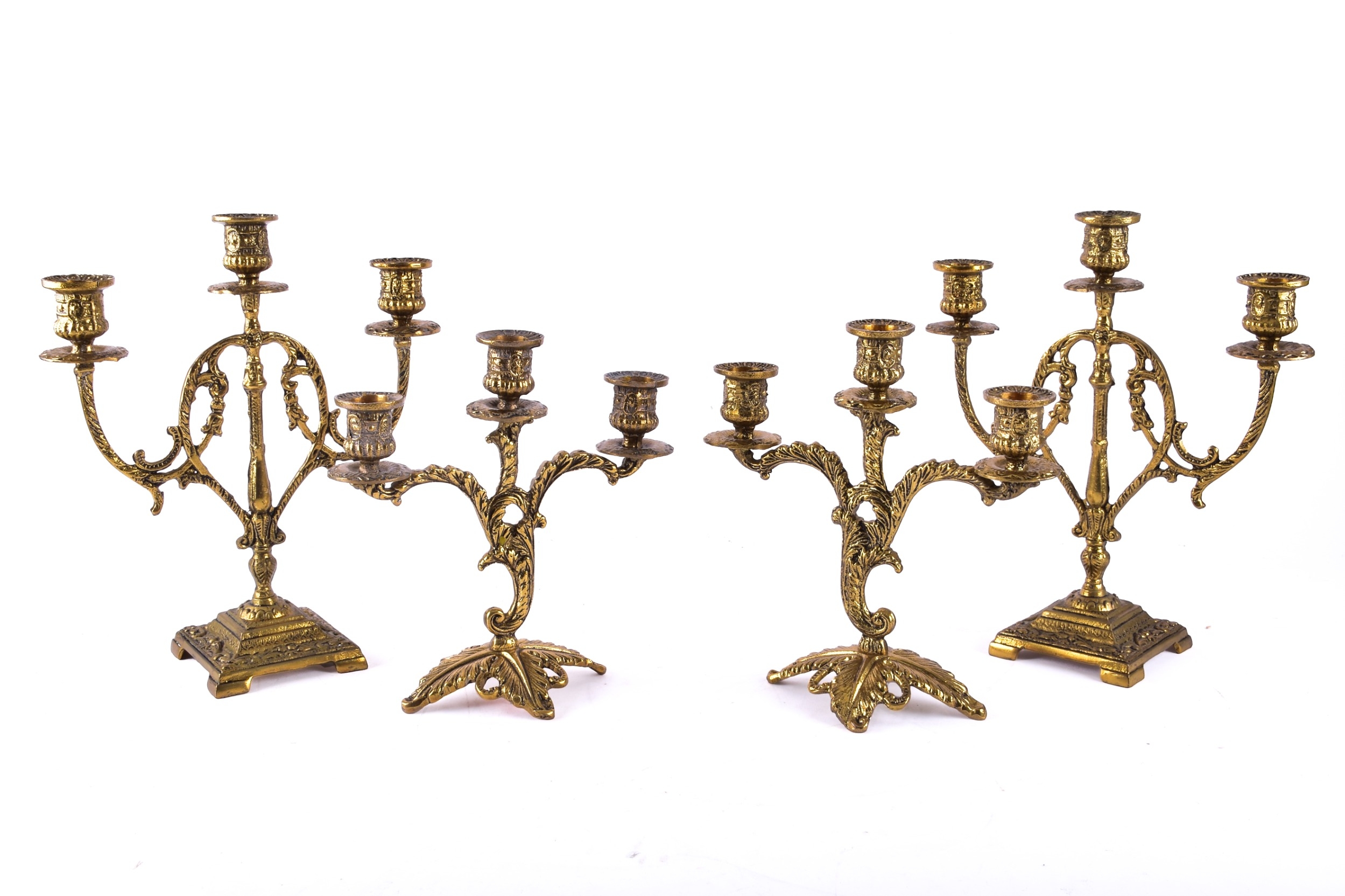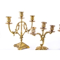 Two pairs of three arm candelabras, comprising a pair of gilt metal candelabras with asymmetrical scrolling branches from a central stem with foliate ornament, the stem rising from a naturalistic base formed as a spreading leaf motif, each 22 cm high, 21.5 cm wide, together with a larger pair of gilt metal candelabras with more symmetrical arrangement, the scrolling arms supported by openwork foliate elements, the central stem is raised on a square, stepped base with applied decoration, 28.5 cm high, 25 cm wide. (4)