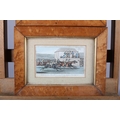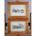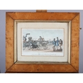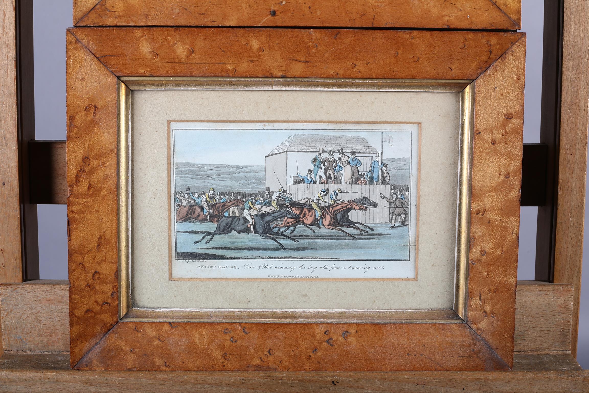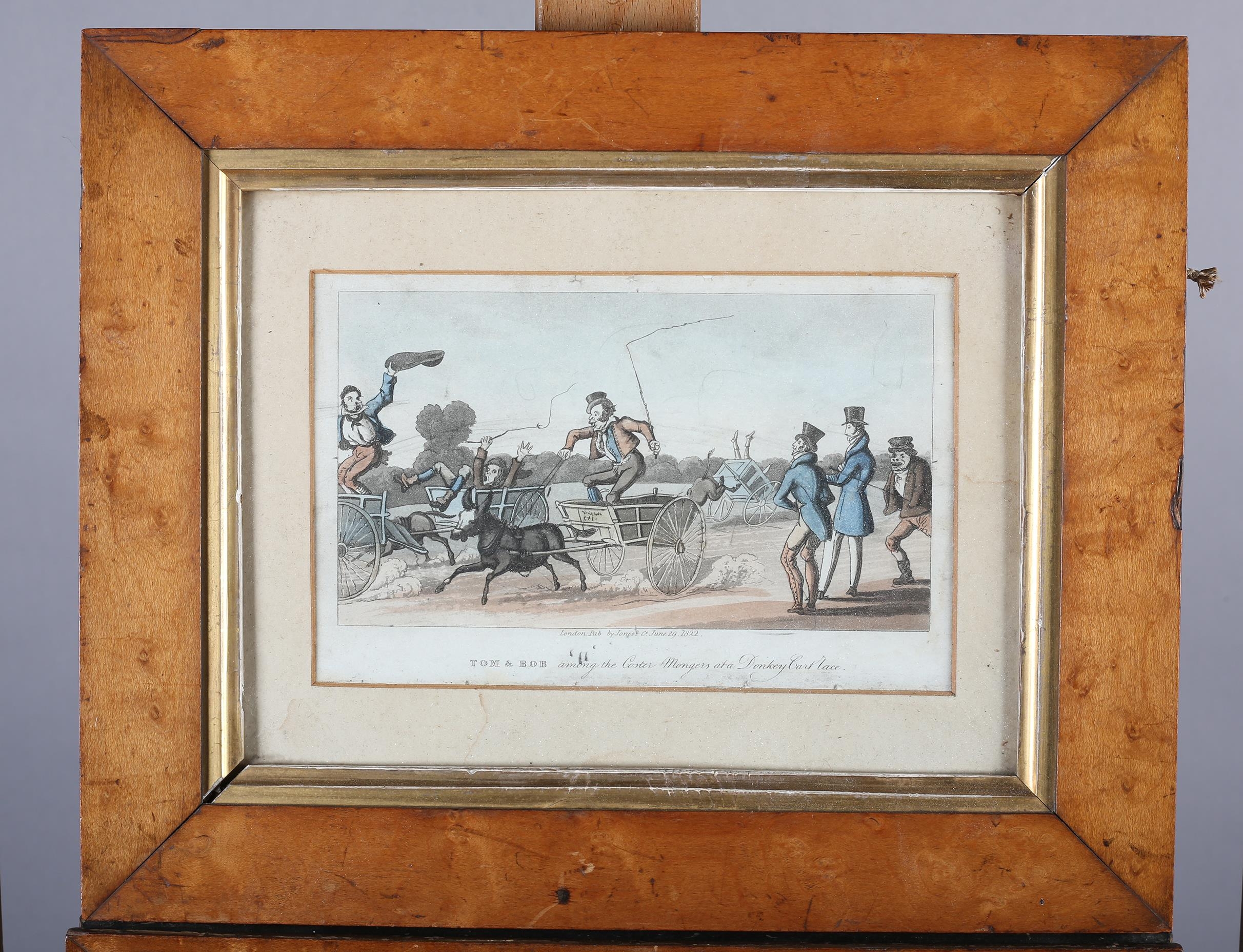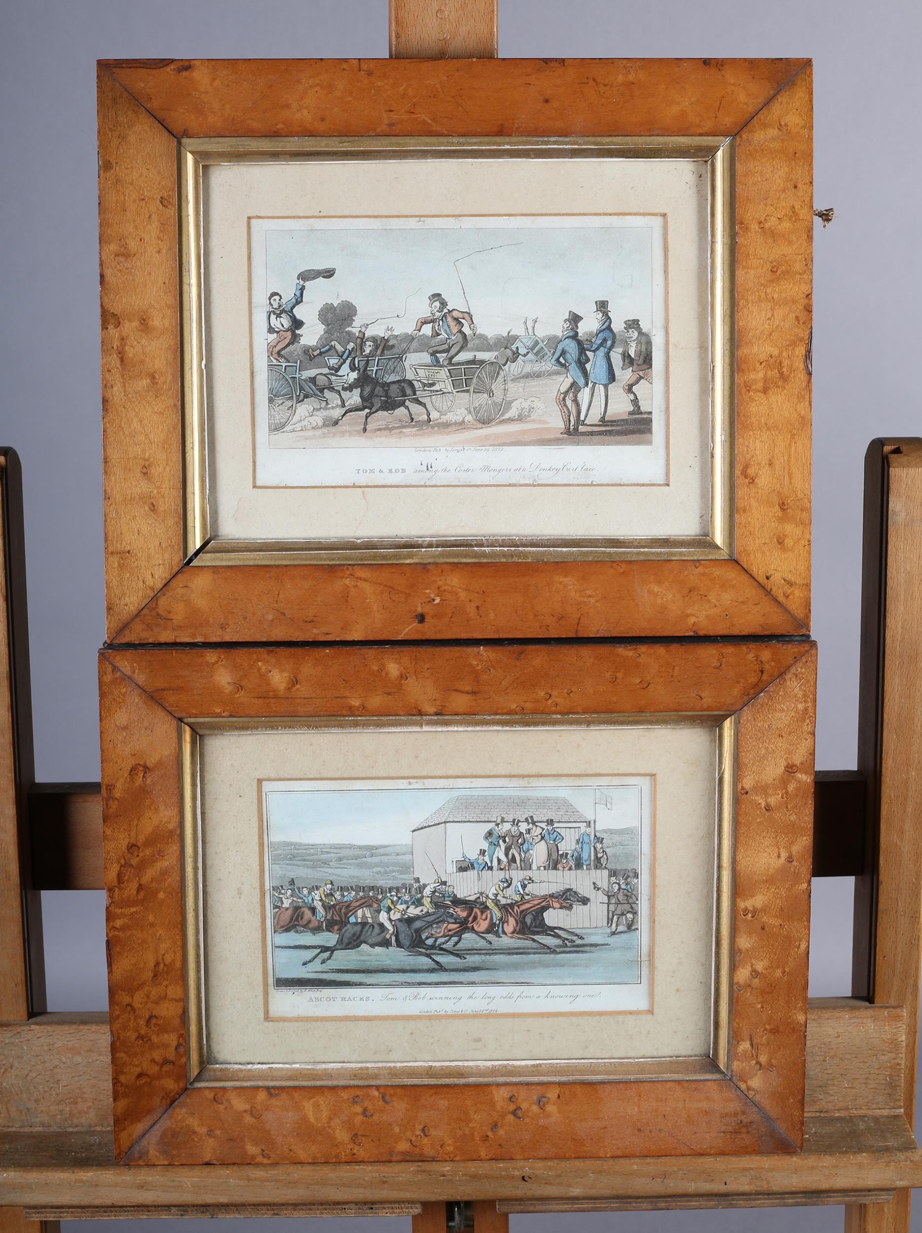 AFTER H ALKEN, 19th century, Ascot Races - Tom & Bob Winning the Long Odds from a Knowing One and Tom & Bob among the Coster Mongers at a Donkey Cart Race, two, engraving with colour, pub. by Jones & Co., June 1822, 12cm x 19cm and 12.5cm x 20cm, maple veneered frames