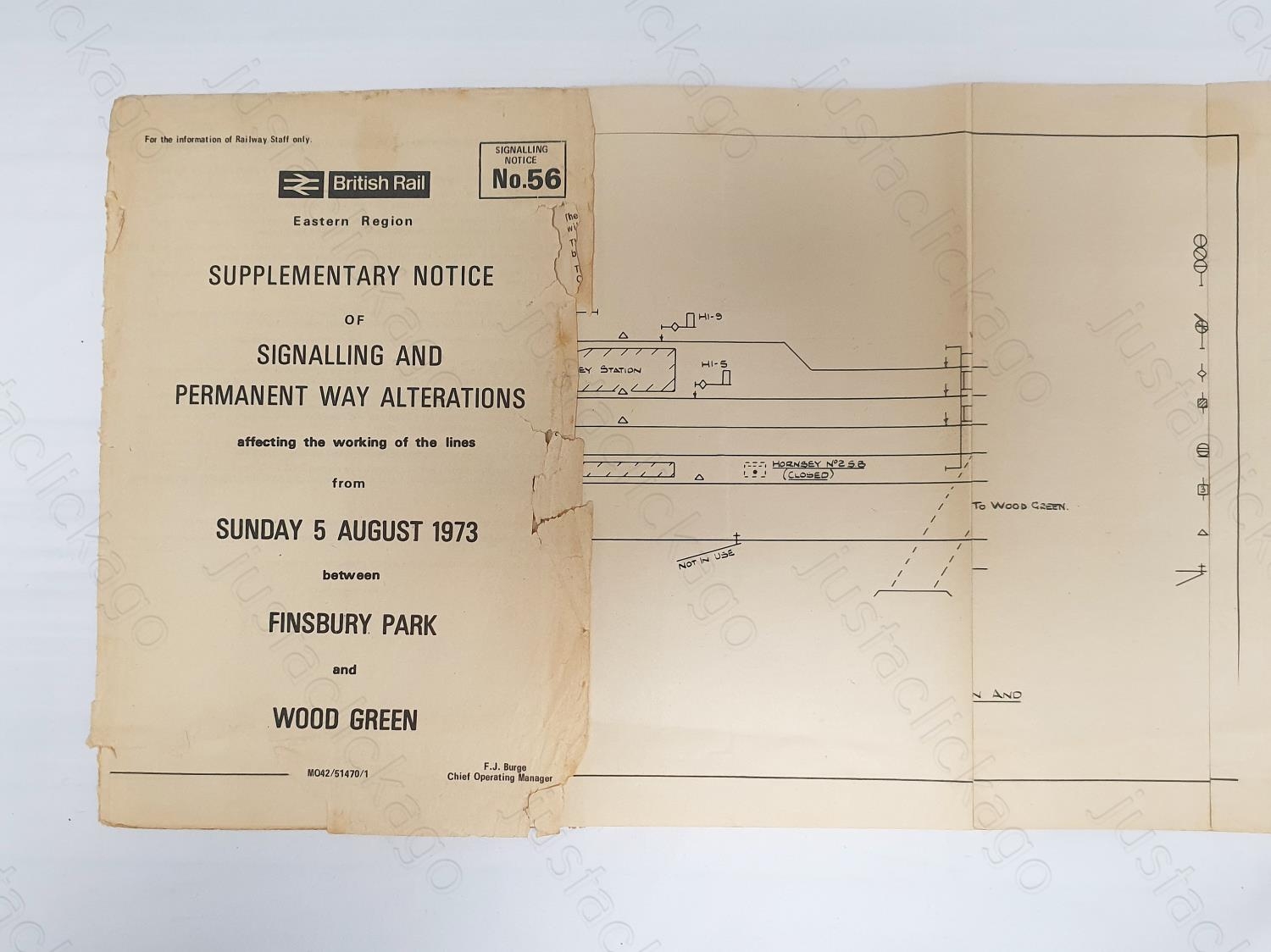 Railway. A B.R. Eastern Region Supplementary Notice of Signalling and Permanent Way Alterations. Finsbury Park - Wood Green. August 1973. With good sized associated fold out signalling diagram.