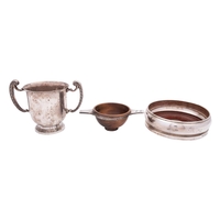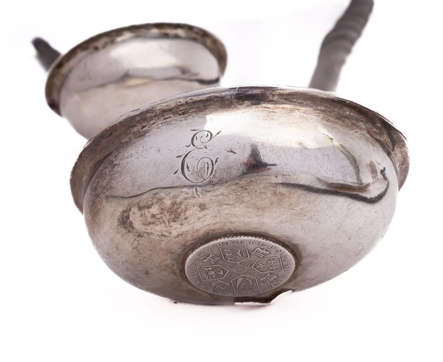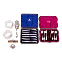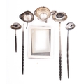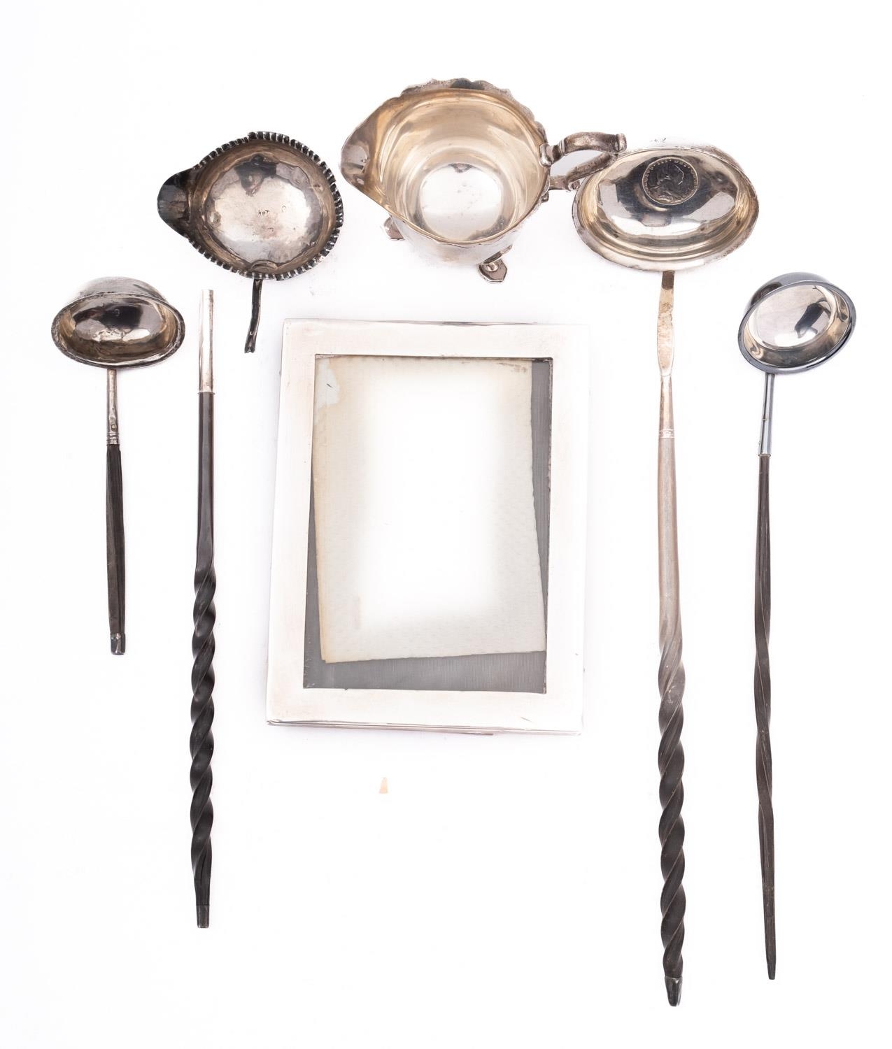 A mixed group of silver including; a silver and mahogany photograph frame by William Neale & Son, Birmingham, 1917, internal 12.2x9cm., a Sheffield cream jug- 98gms. three silver punch ladles and a silver plated punch ladle, (6)