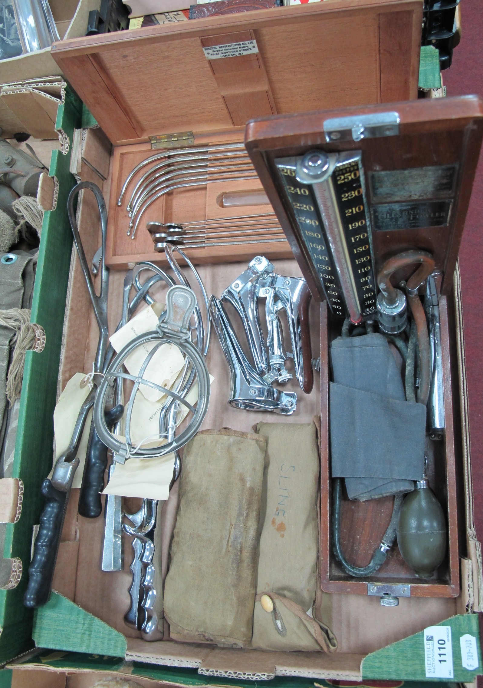 Medical Instruments, to include Lister Sounds in Mortimer St, wooden case, Anderson's Forceps, Decapitation saw, stethoscope, sling in canvas roll, etc:- One Box.