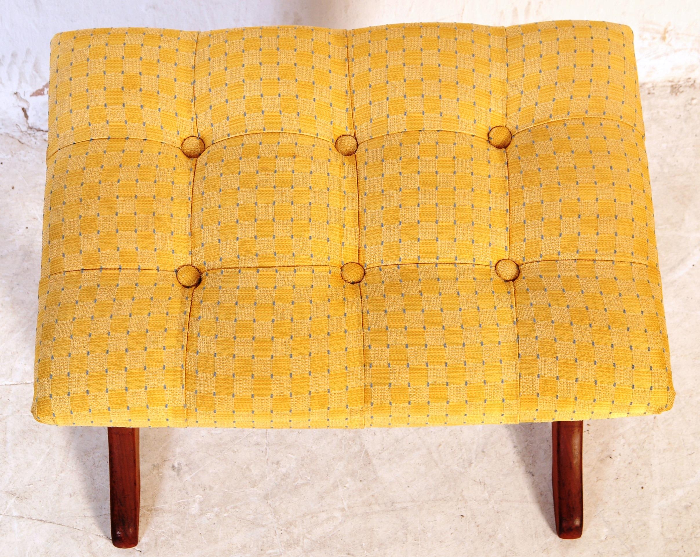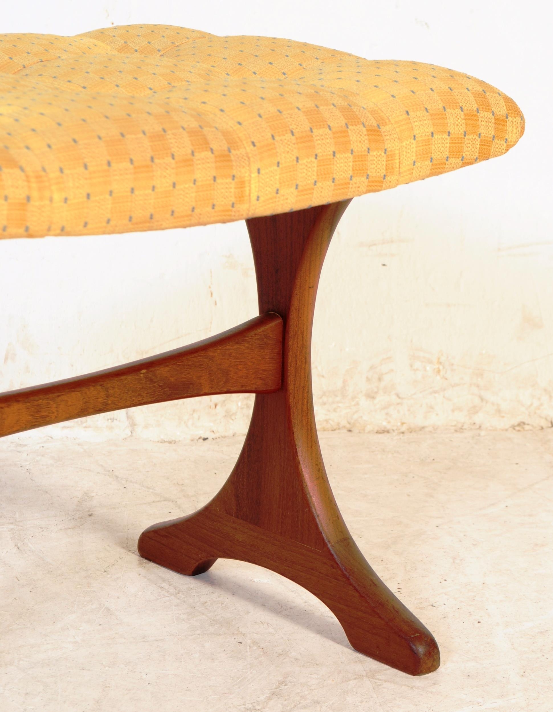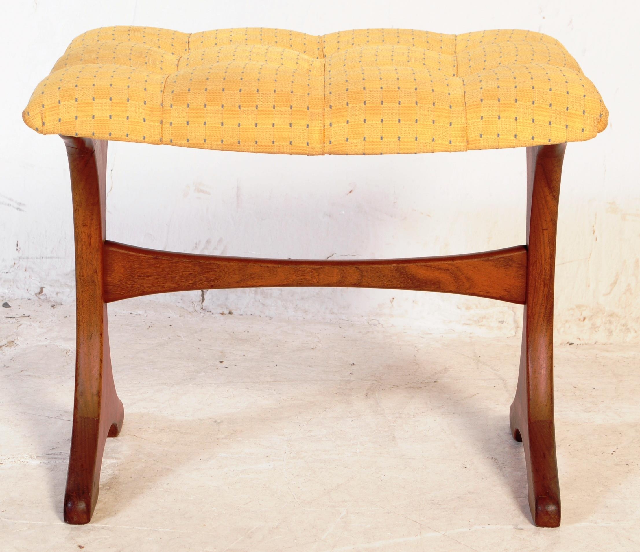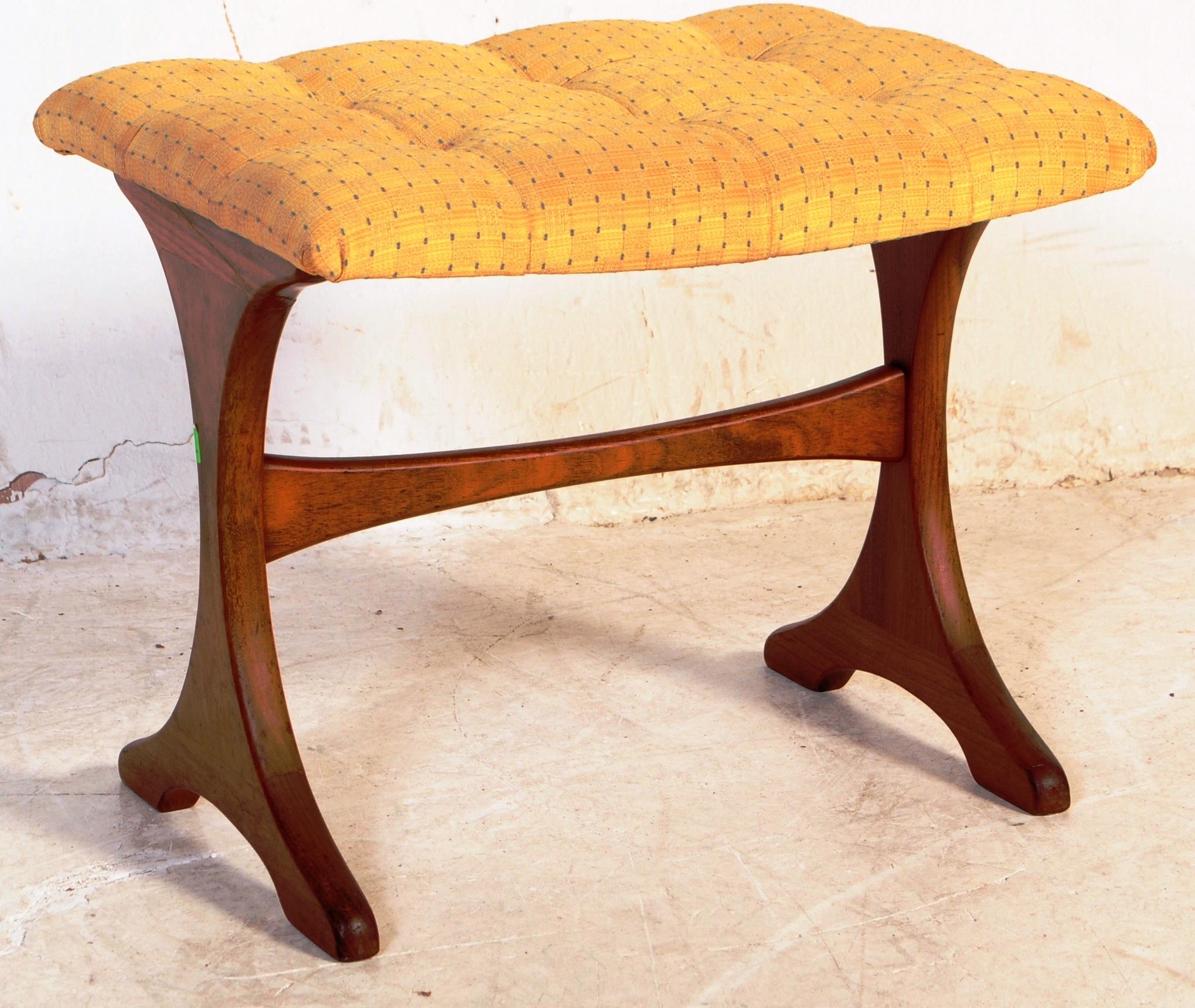 G Plan - A retro mid 20th century circa 1960s teak dressing table stool. The stool having tufted upholstered cushion seat over a trestle type whale tale supports united by stretcher.40x50x35cm