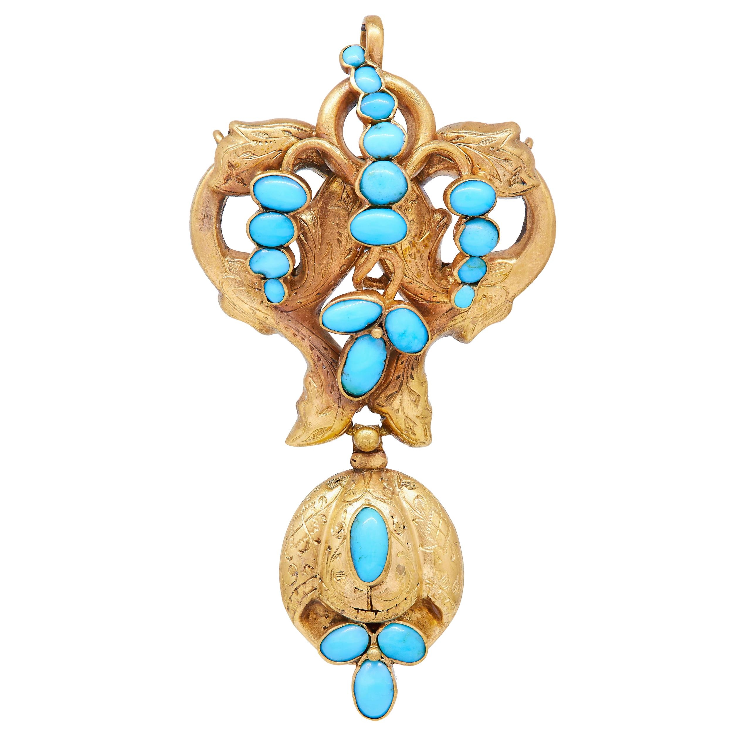 ANTIQUE VICTORIAN TURQUOISE DROP PENDANT, of part openwork scrolling anf floral design. Set with cabochoon cut turquoise. The drop set with turqoise and locket back. L. 5 cm. 4.9 grams.
