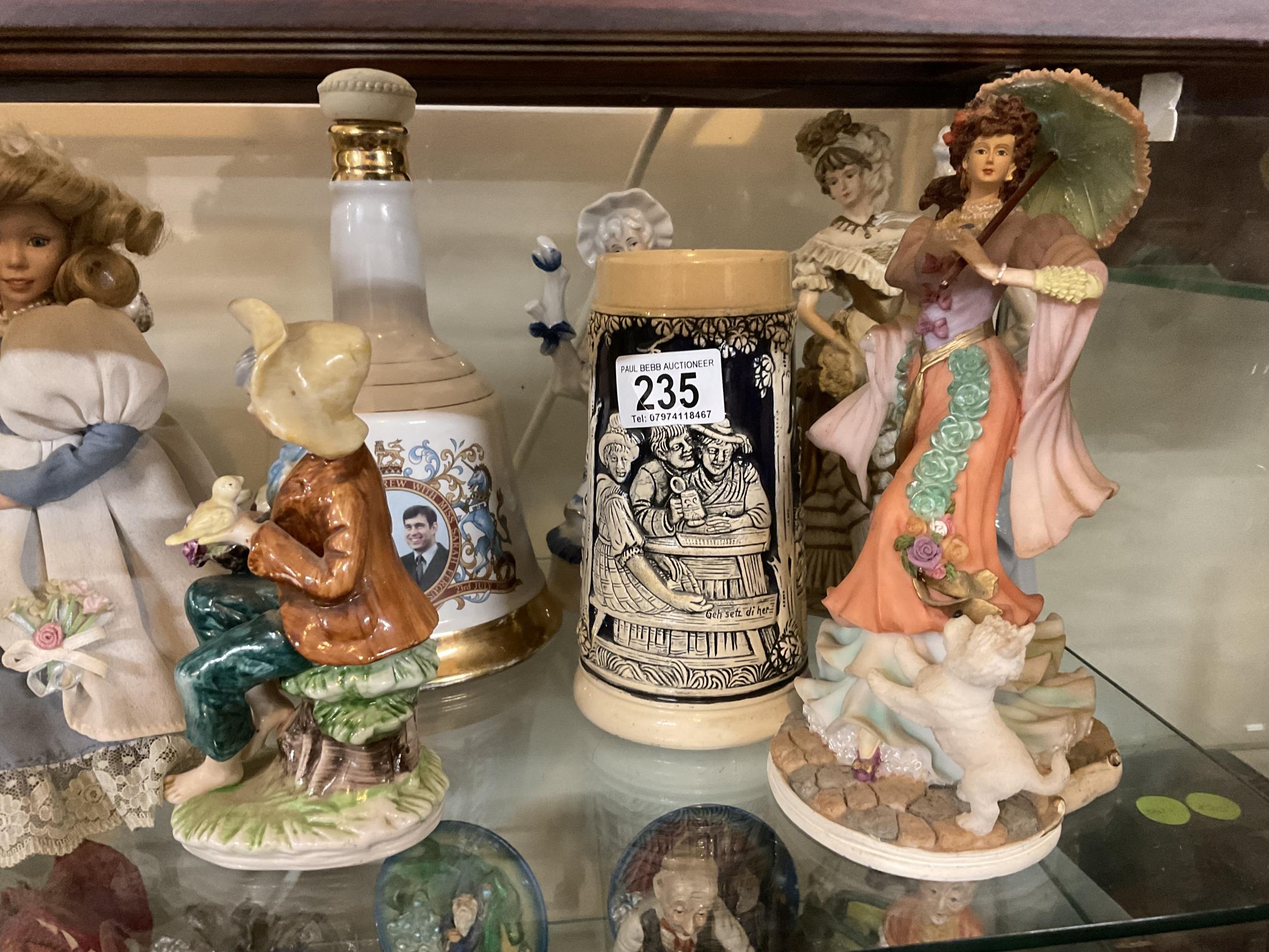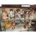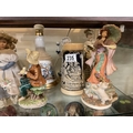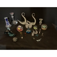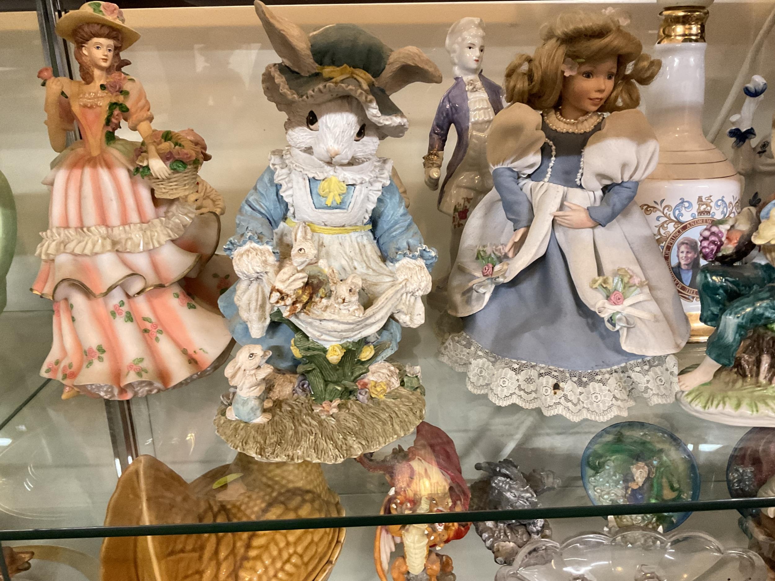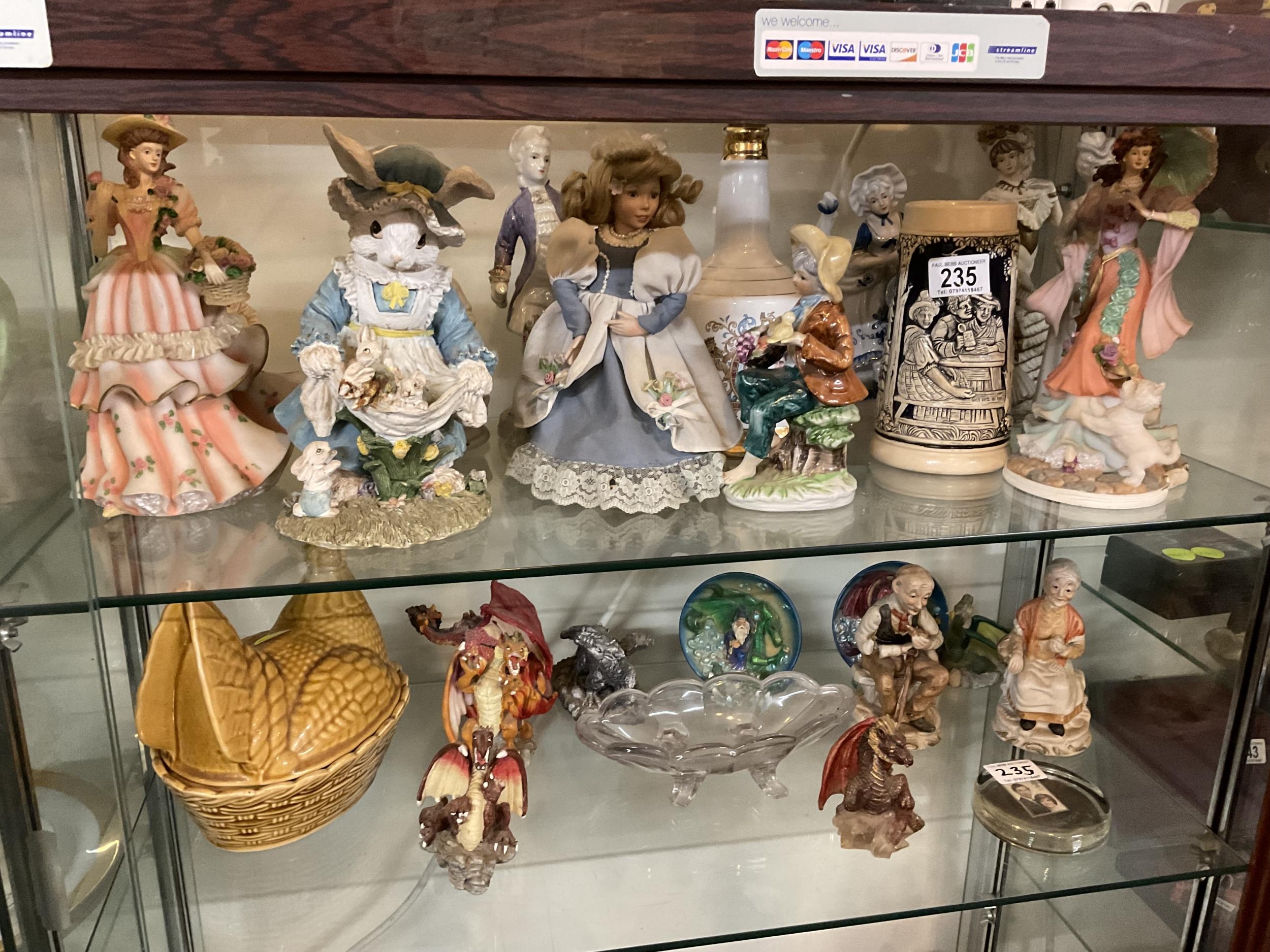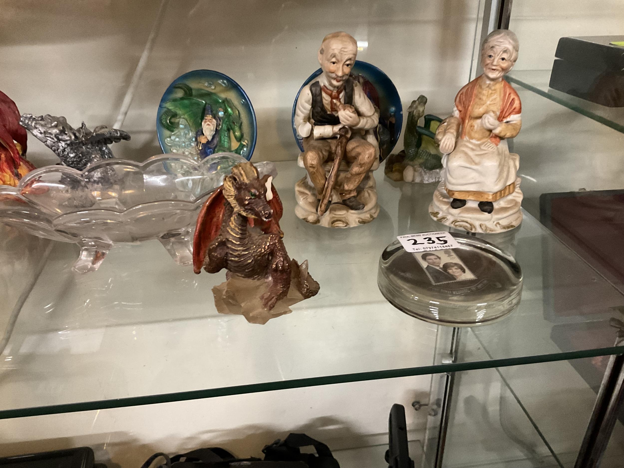 2 SHELVES OF SUNDRY FIGURES ETC TO INCLUDE COMMERATIVE STAMP PAPERWEIGHT, ASSORTED DRAGONS, ETC