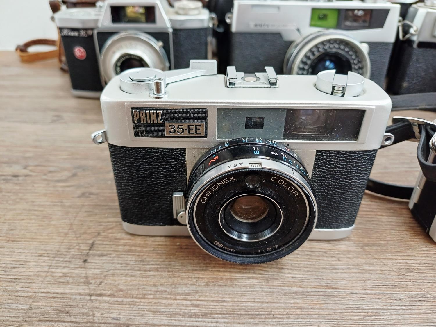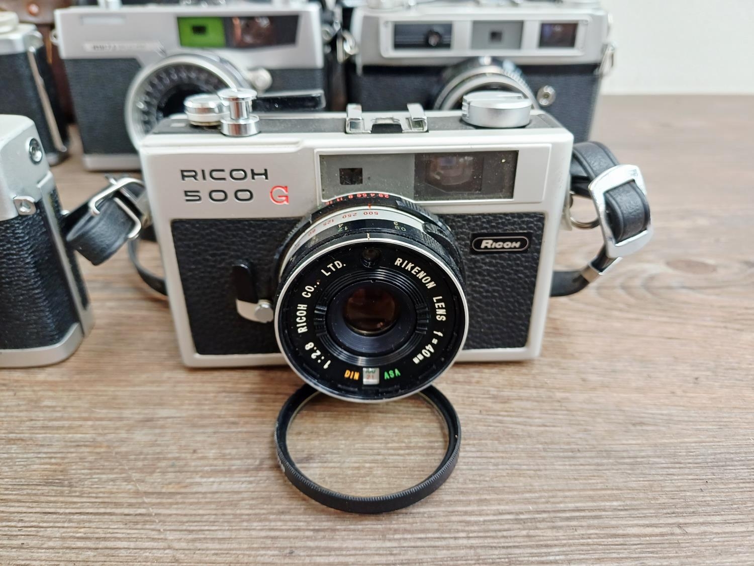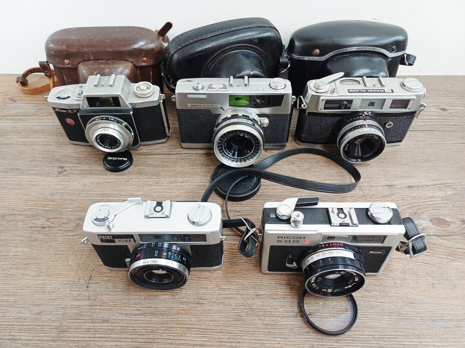 Five 35mm cameras, one Ricoh 500G compact coupled rangefinder, one cased Rank Aldis Ranger 35 rangefinder, one cased Petri 7S rangefinder, one cased Kowa 35N viewfinder and one Prinz 35-EE compact coupled rangefinder (rebadged Cosina)
