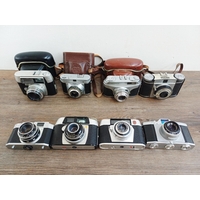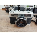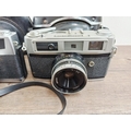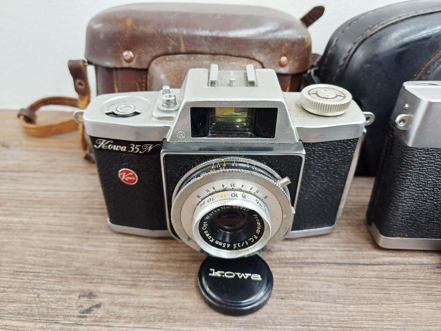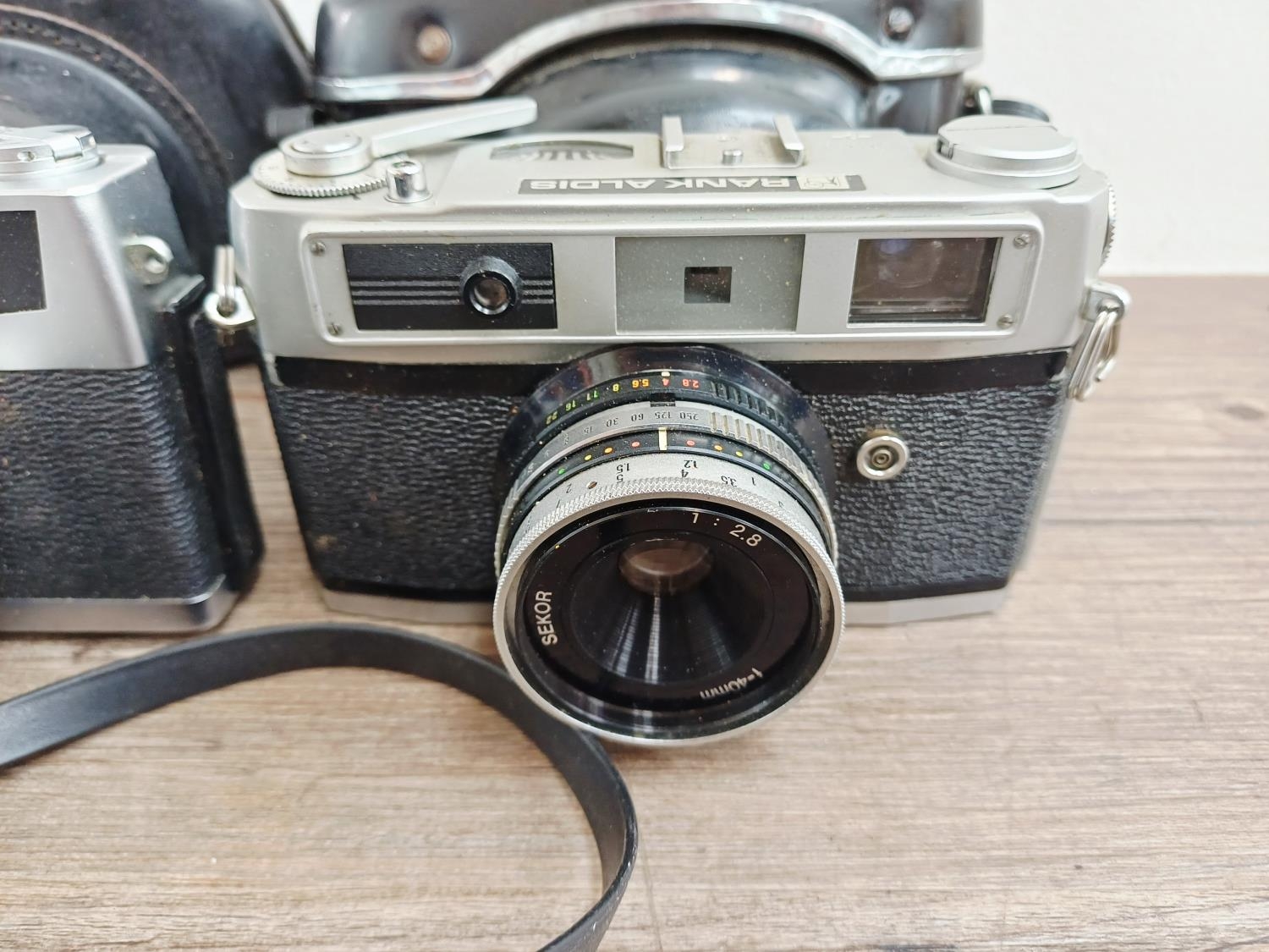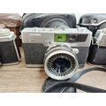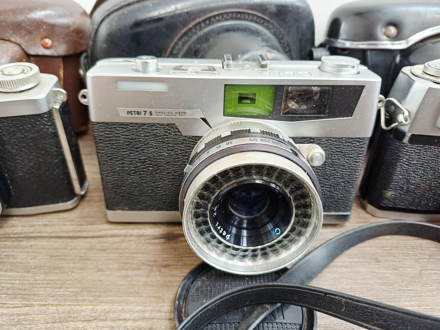 Five 35mm cameras, one Ricoh 500G compact coupled rangefinder, one cased Rank Aldis Ranger 35 rangefinder, one cased Petri 7S rangefinder, one cased Kowa 35N viewfinder and one Prinz 35-EE compact coupled rangefinder (rebadged Cosina)
