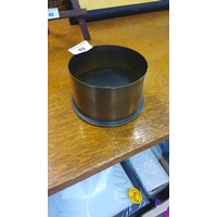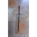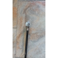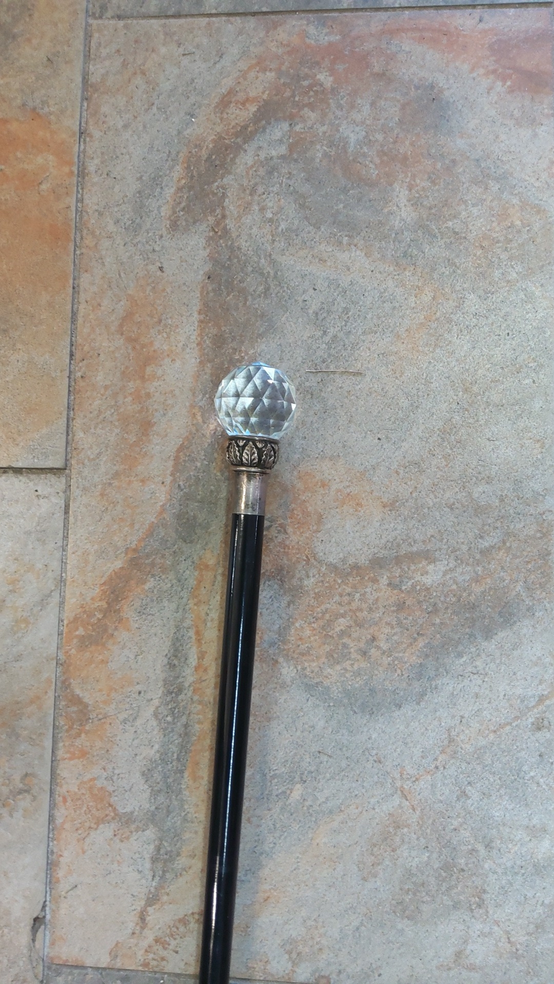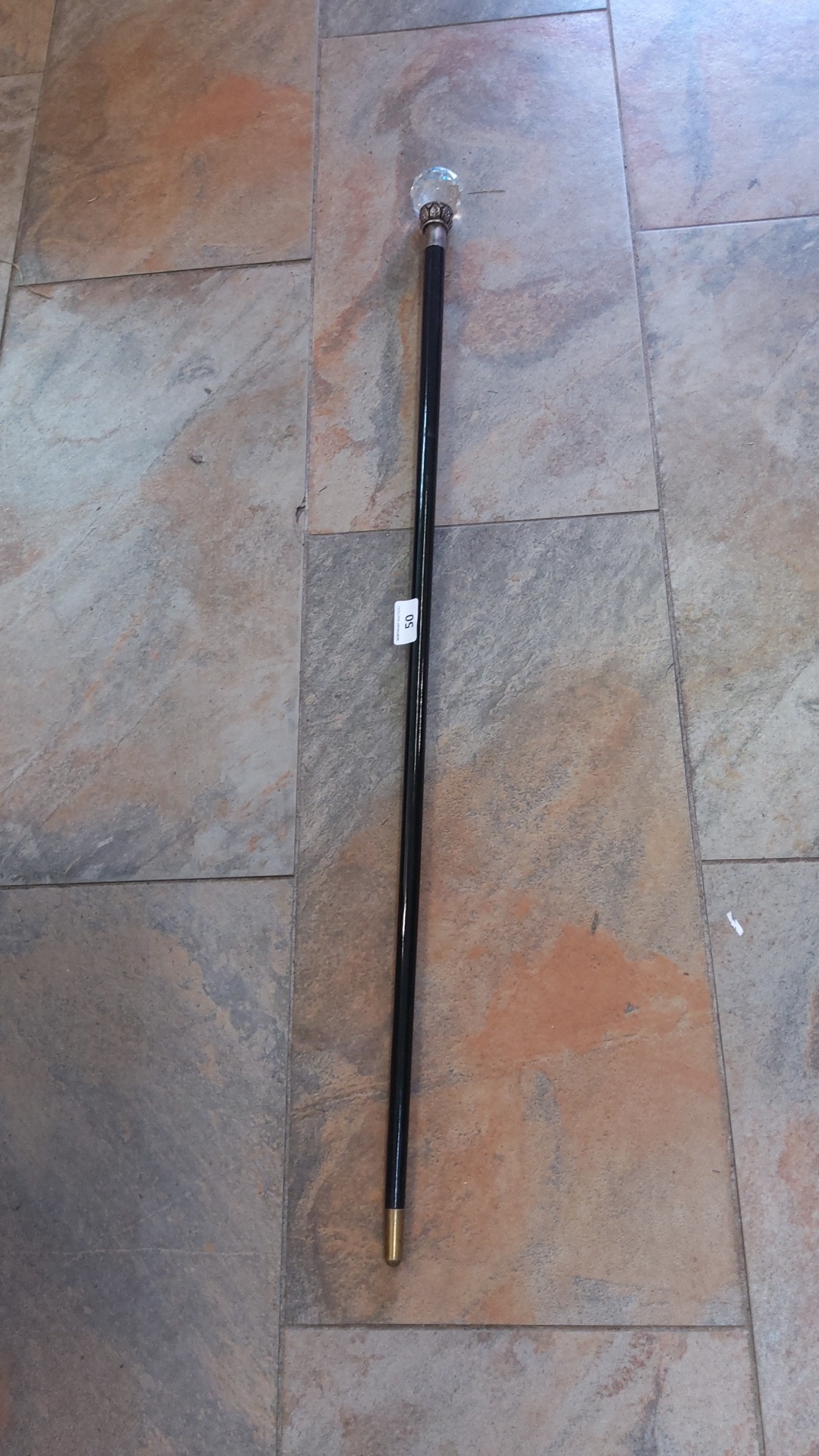 Walking cane with faceted glass spherical knop, foliate-cast metal collar and plain metal ferrule, on a glossy black shaft with brass terminal.