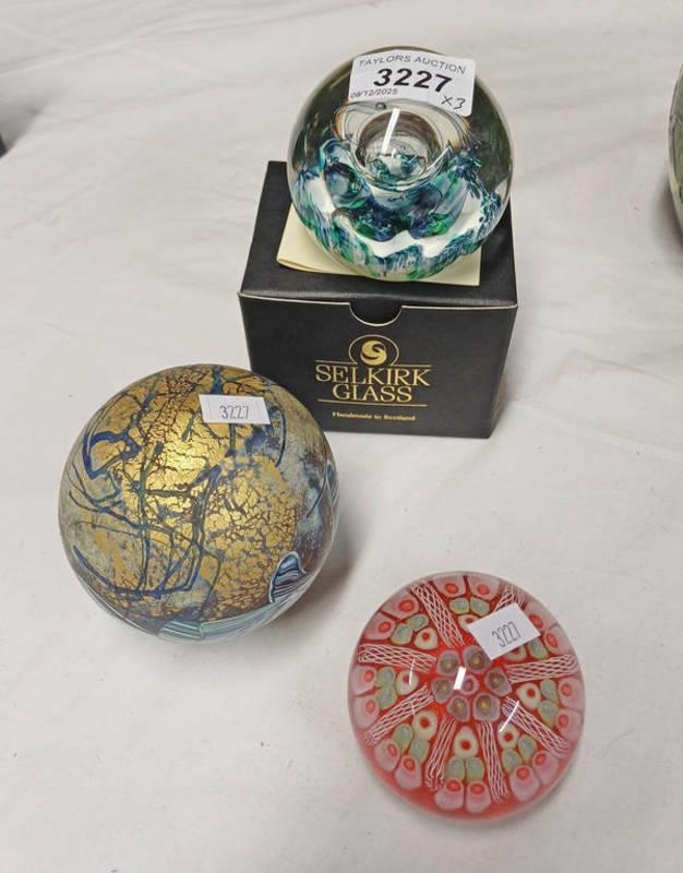 ISLE OF WIGHT GLASS PAPERWEIGHT SIGNED TO BASE, STRATHEARN GLASS PAPERWEIGHT & SELKIRK GLASS PAPERWEIGHTS