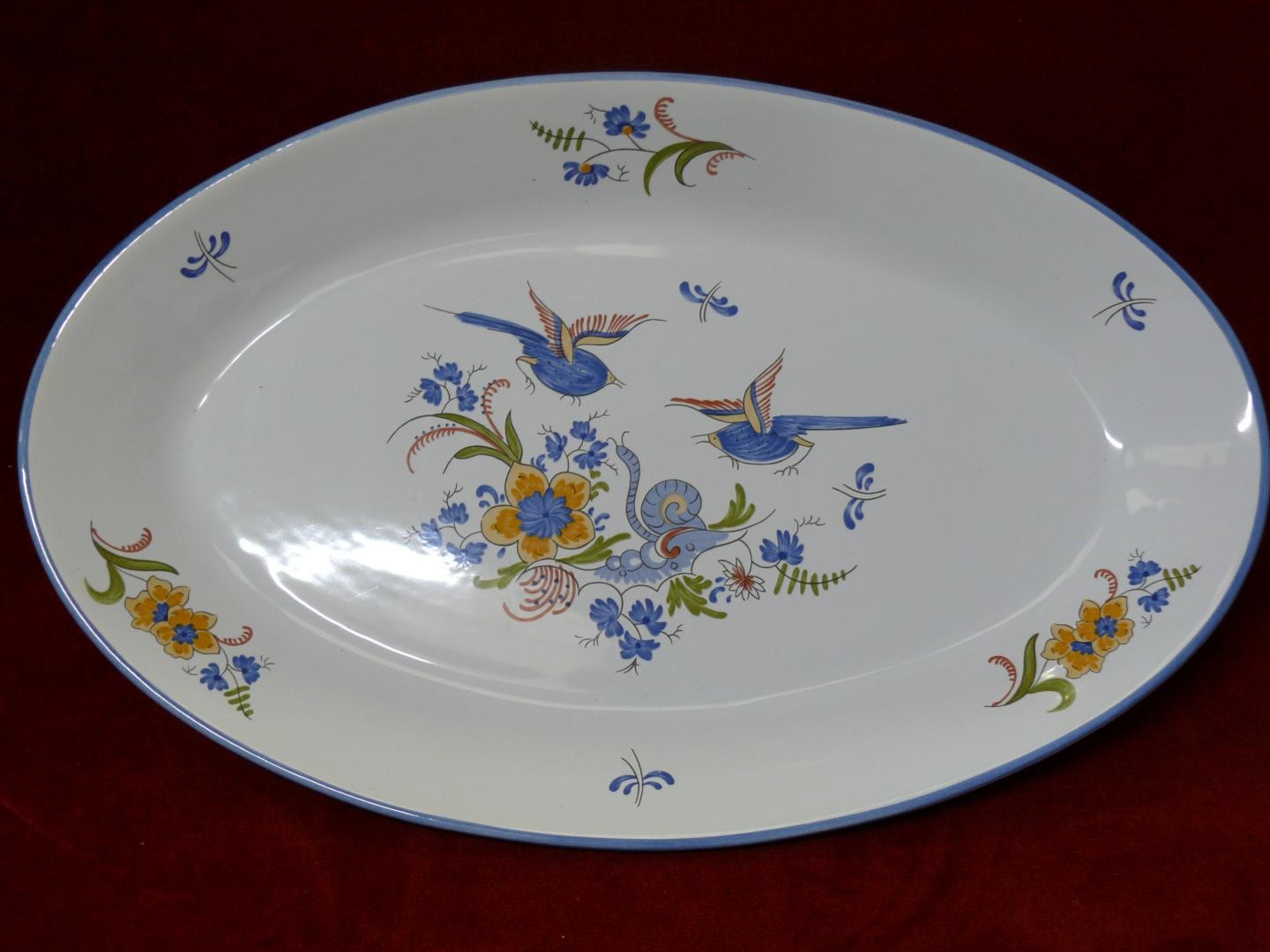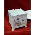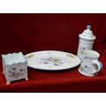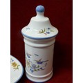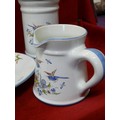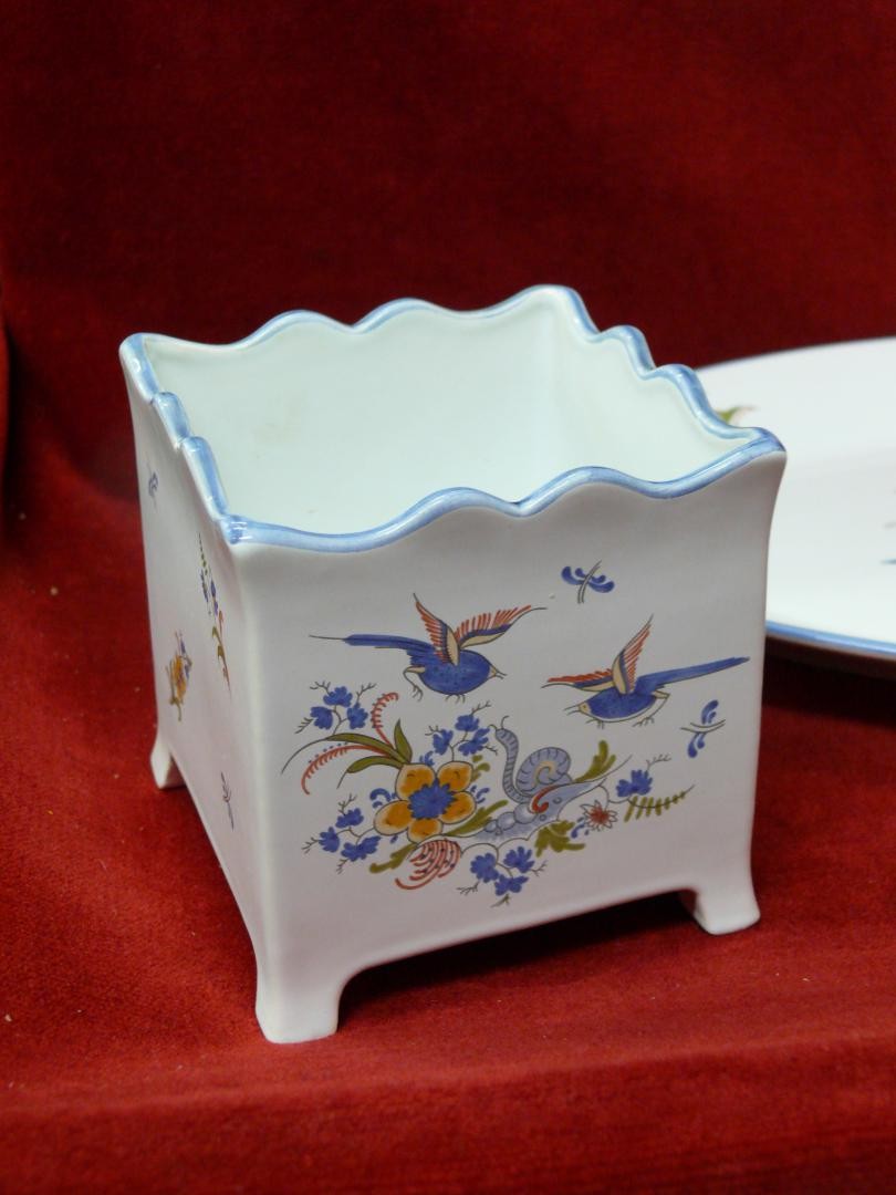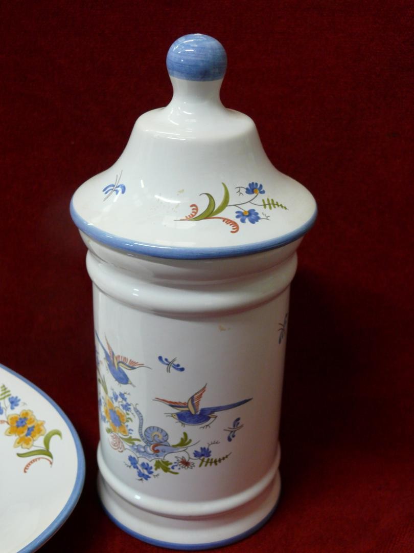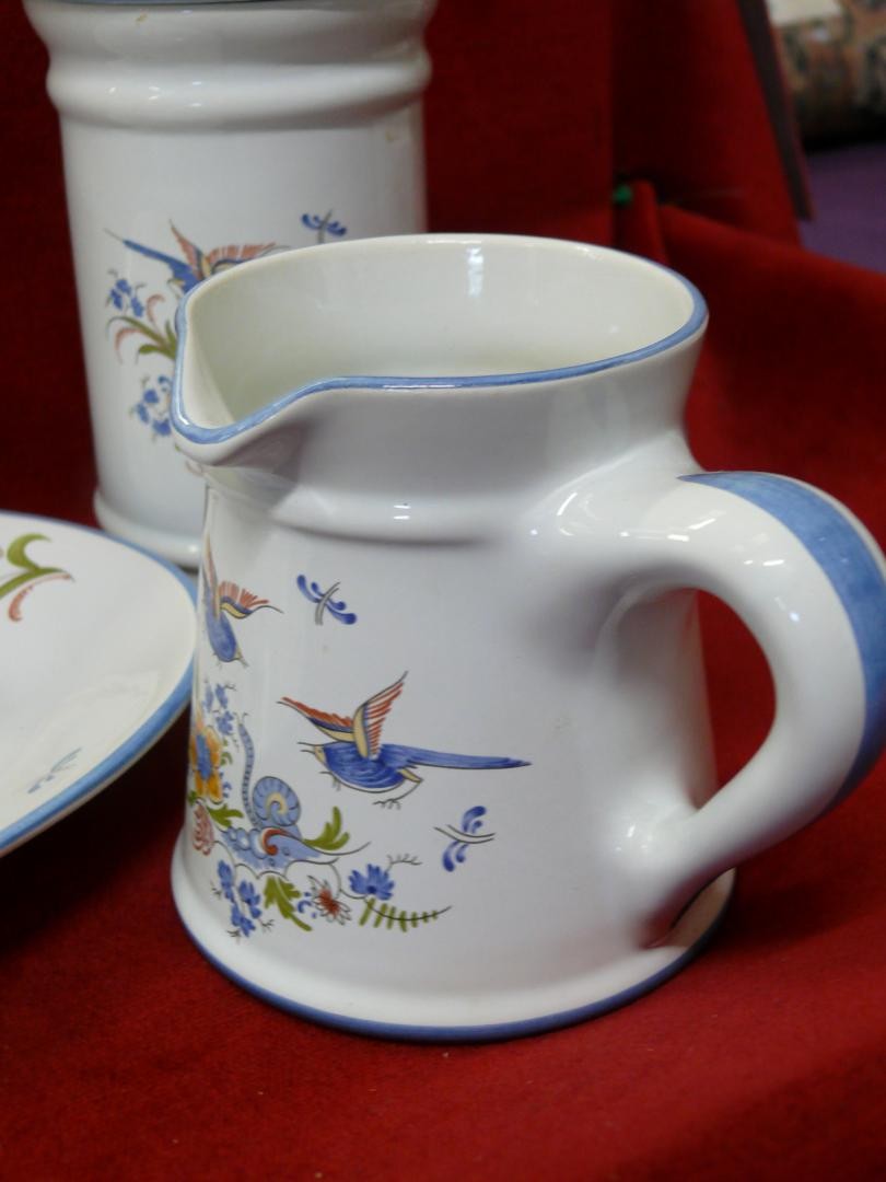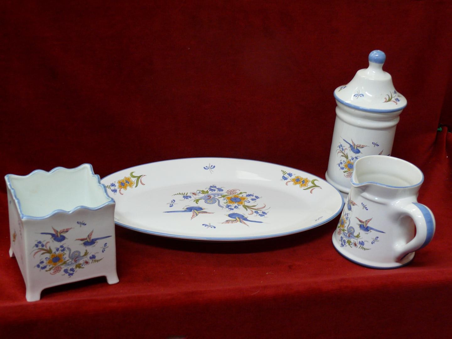 FRENCH POTERIE A LA CHAPELLE DES POTS- 4 PIECES - OVAL PLATE, PITCHER JUG, LIDDED CANDY POT AND SQUARE POT