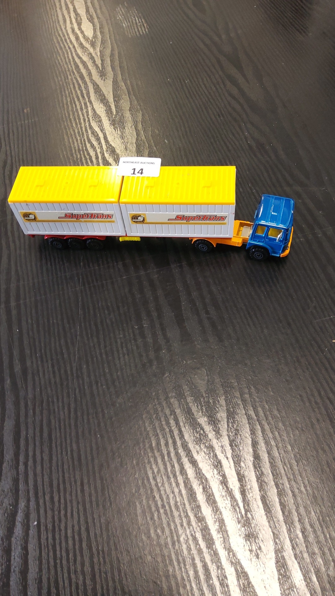 Majorette diecast articulated truck with twin “SuperTrans” containers, blue cab and yellow chassis, scale 1:60, made in France, c.1980s.