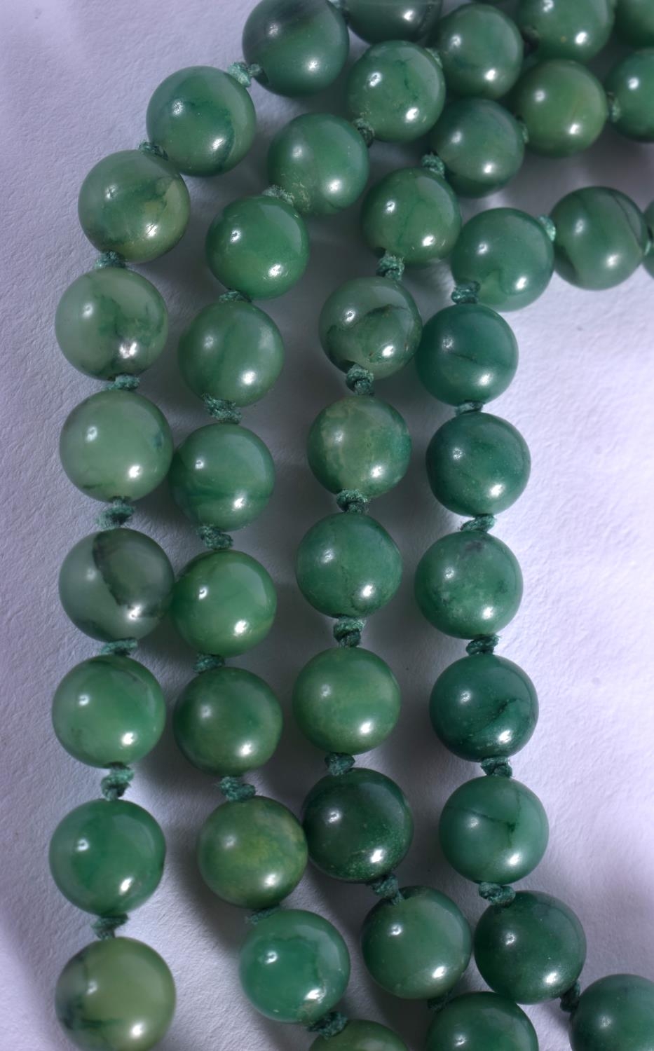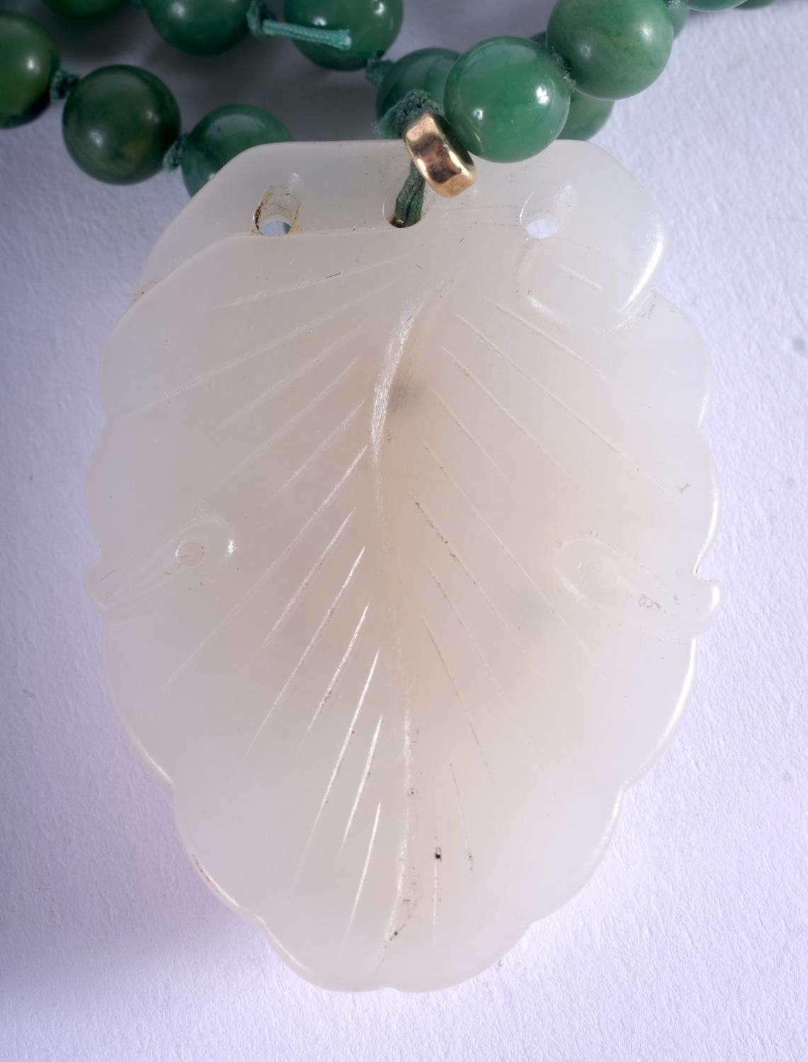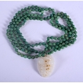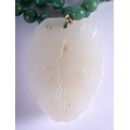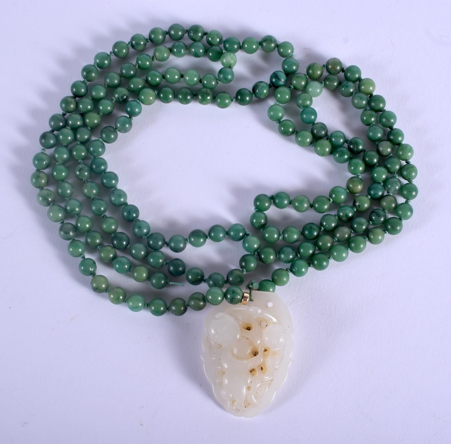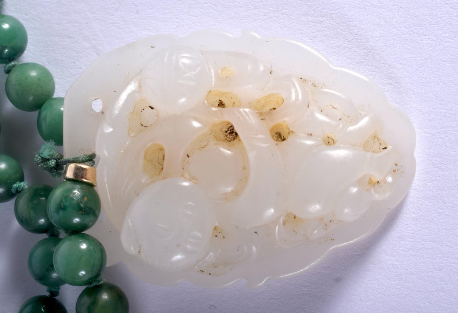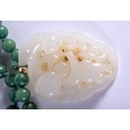 AN EARLY 20TH CENTURY CHINESE CARVED JADEITE AND GREEN JADE NECKLACE Late Qing/Republic. Pendant 4 cm x 3 cm, necklace 116 cm long.
