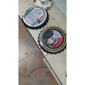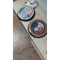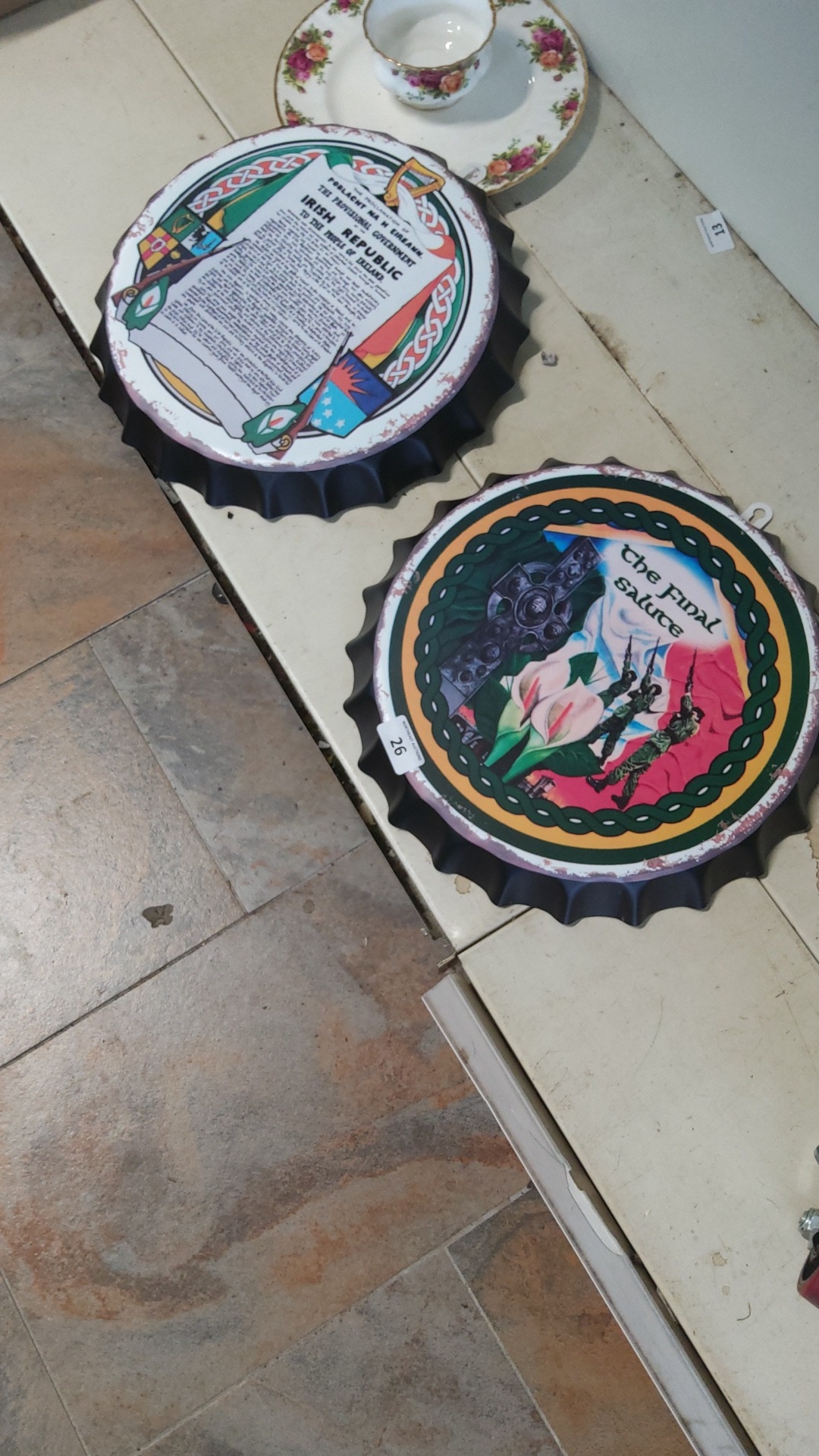 Two bottle-cap form metal wall plaques, printed with Irish-themed graphics: one centred with the text 'The Final Salute'; the other featuring an Irish Republic proclamation design with Celtic knot border and heraldic motifs.