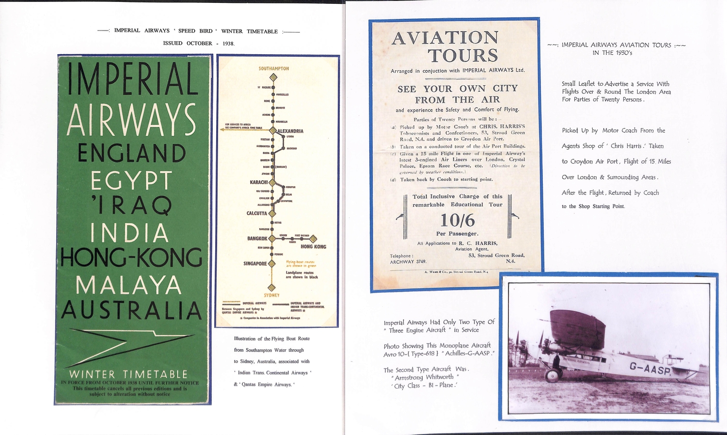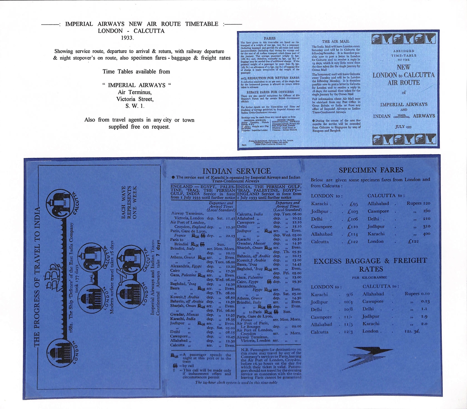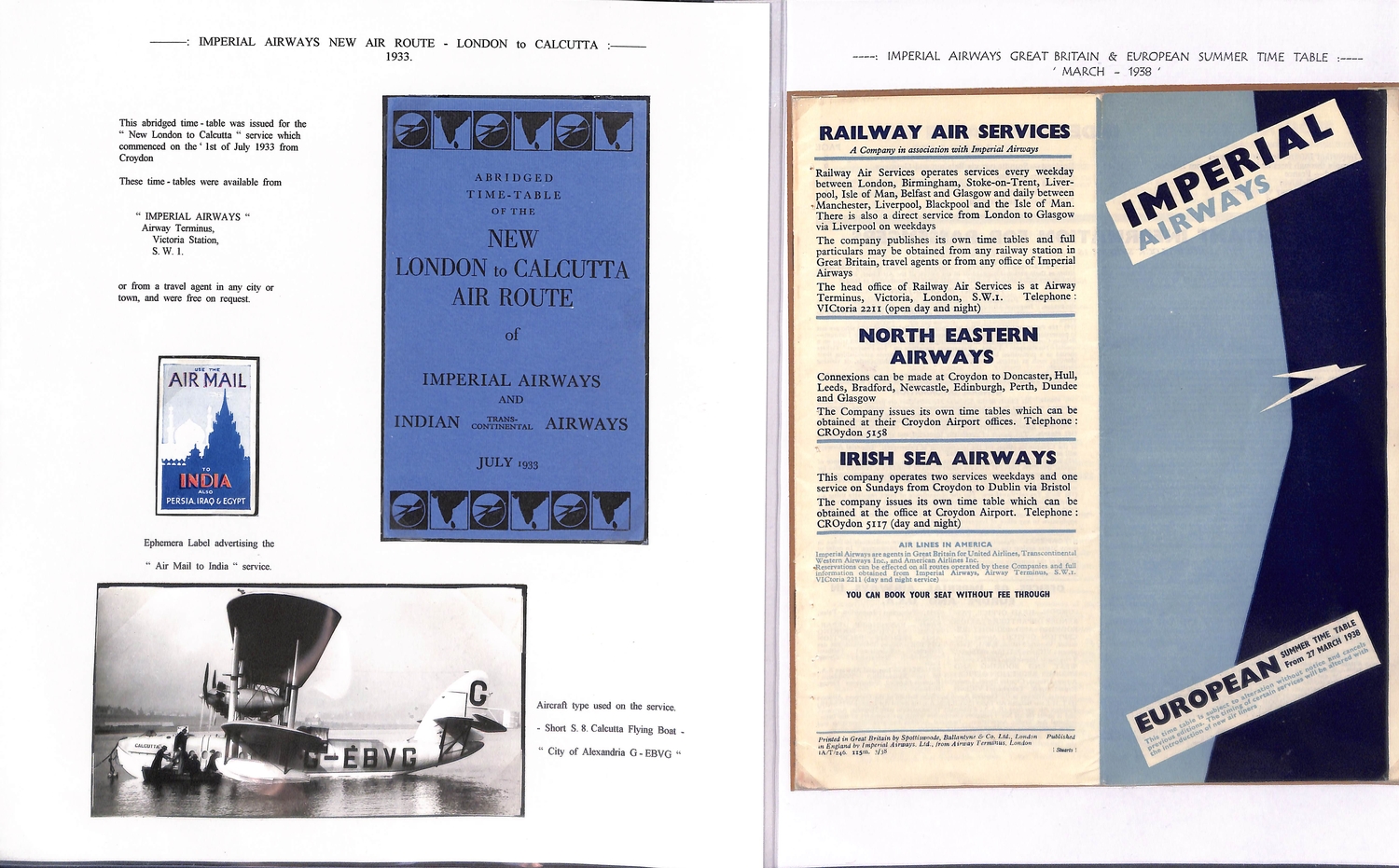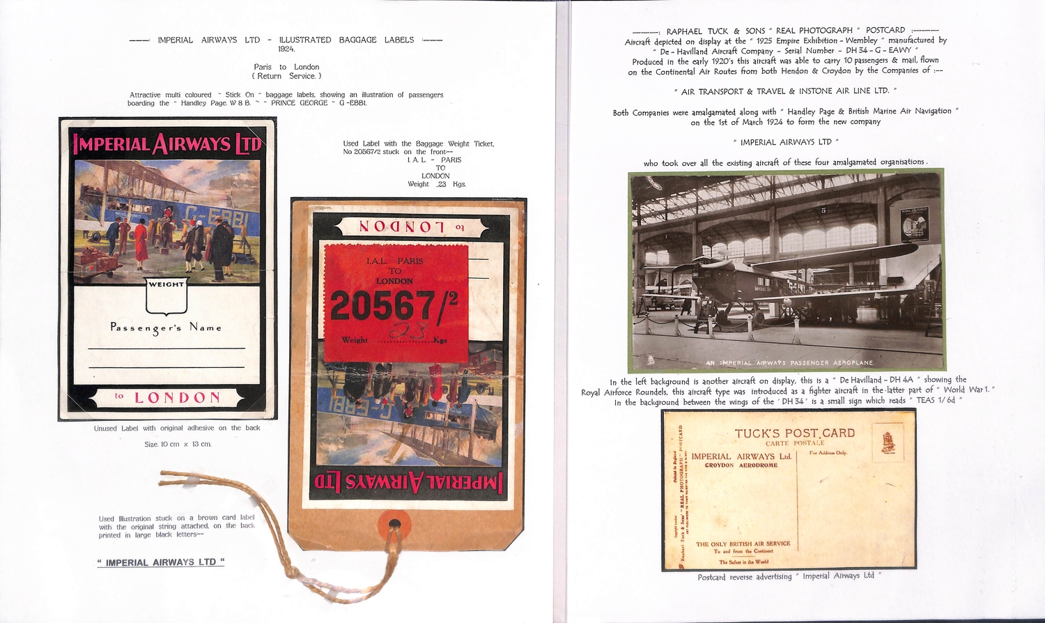 Imperial Airways. 1924-38 Ephemera including c.1924 illustrated Paris to London luggage labels (2, one applied to a tie-on tag with red weight label); leaflets comprising 1931 England to Egypt & Northern Africa, Summer 1931 European Services, July 1933 New London to Calcutta Air Route (2), Summer 1938 European timetable, 1938 Winter timetable England to Egypt, Iraq, India, Hong Kong, Malaya & Australia, also picture postcards (2), etc. (10+).