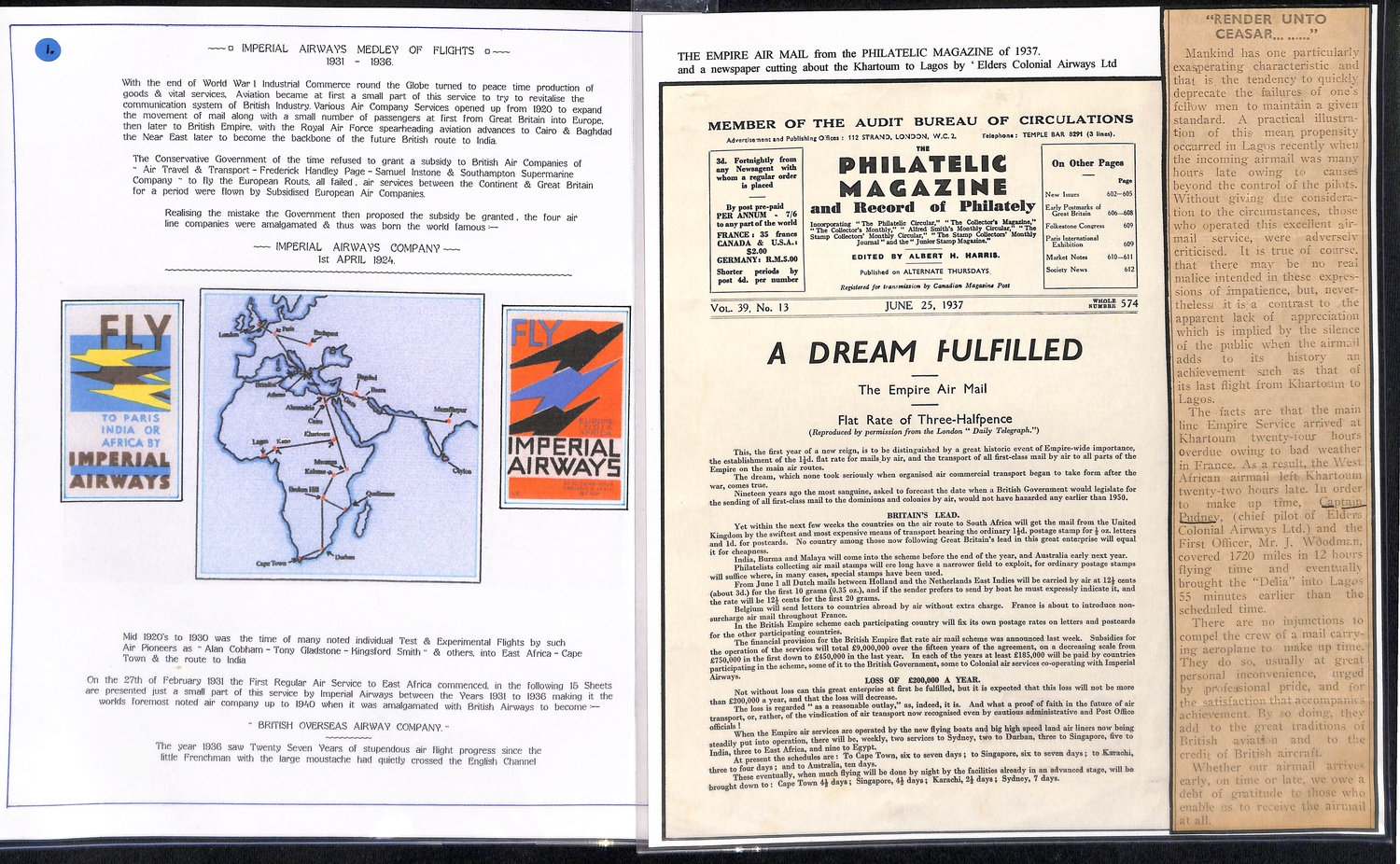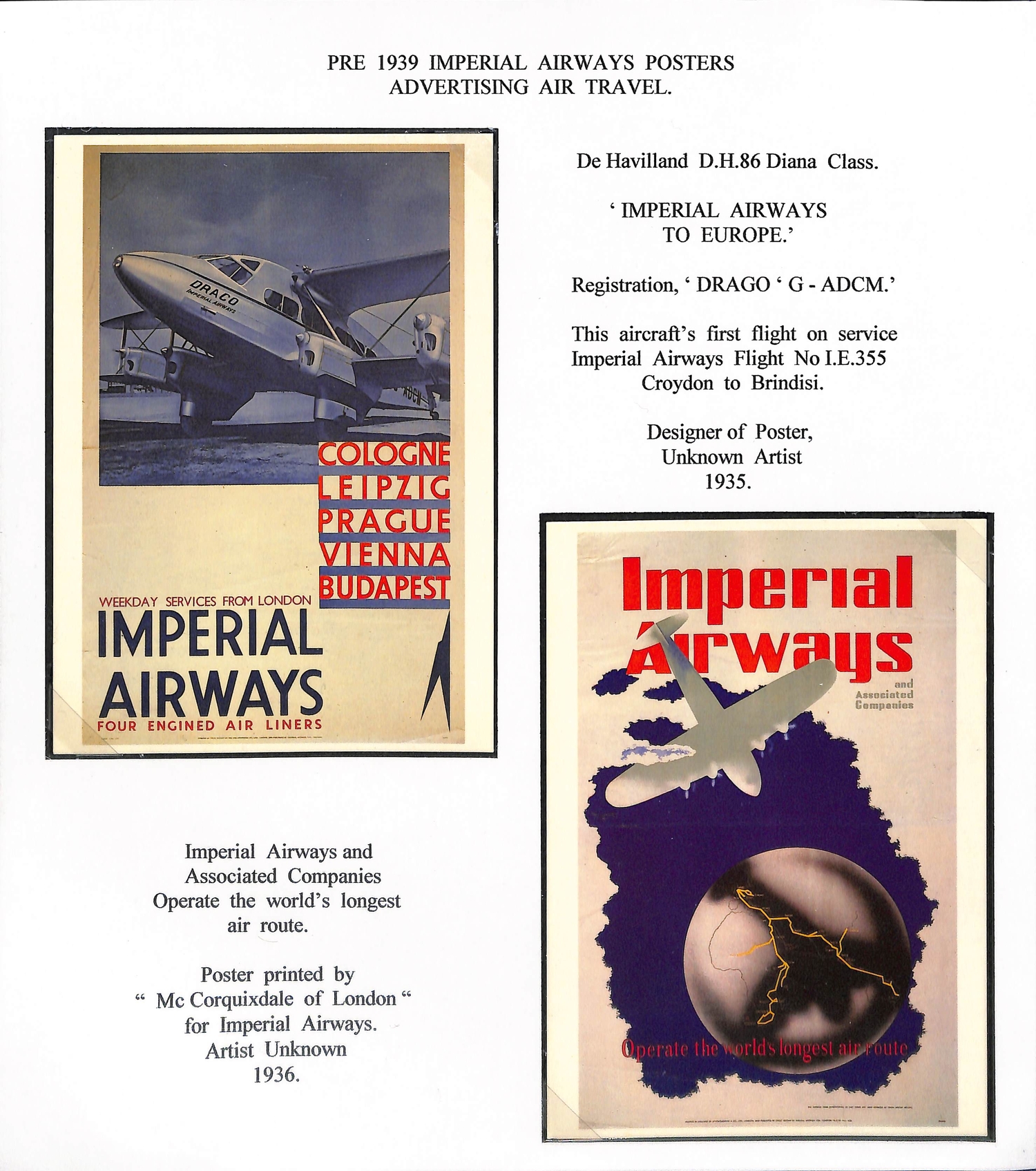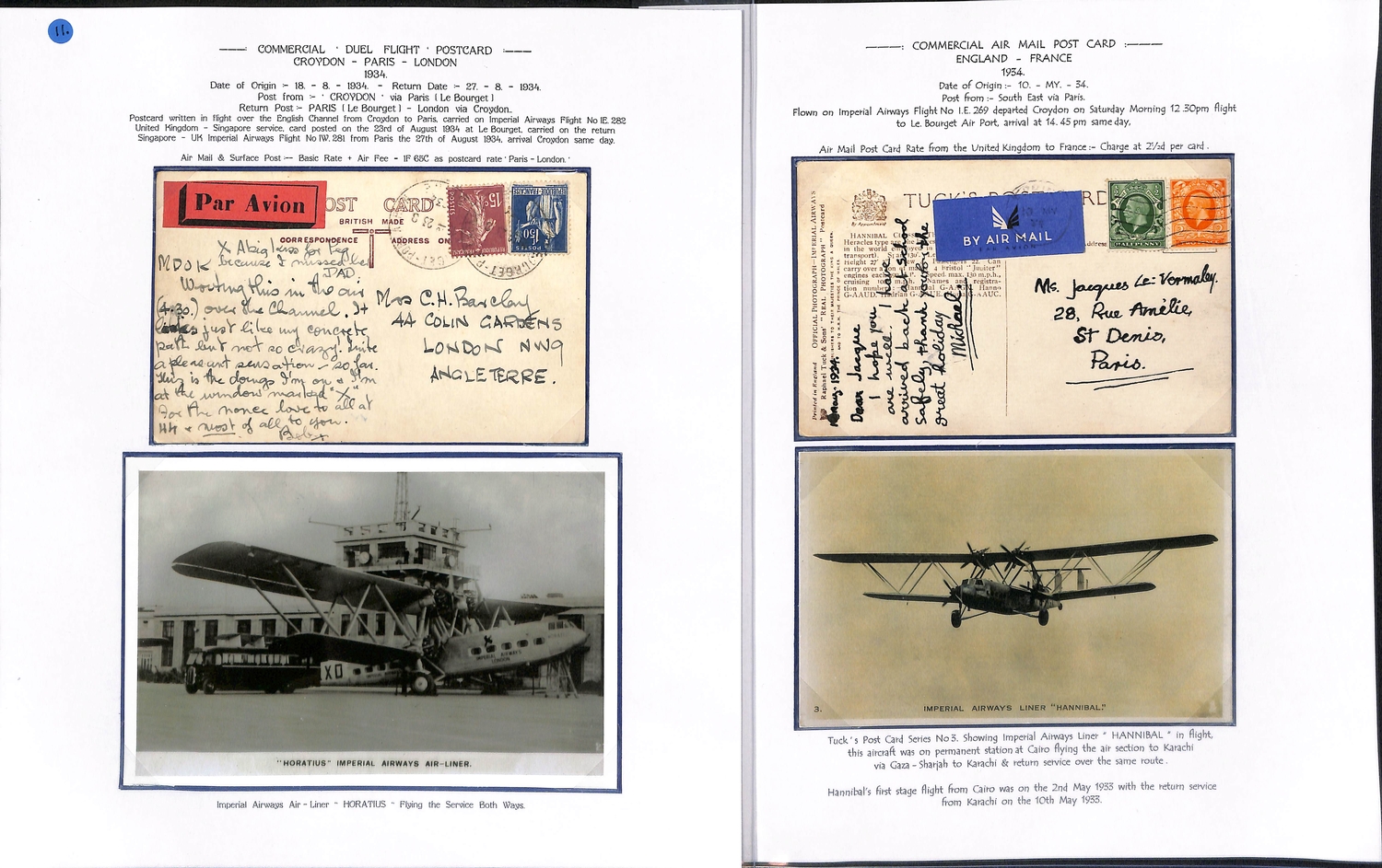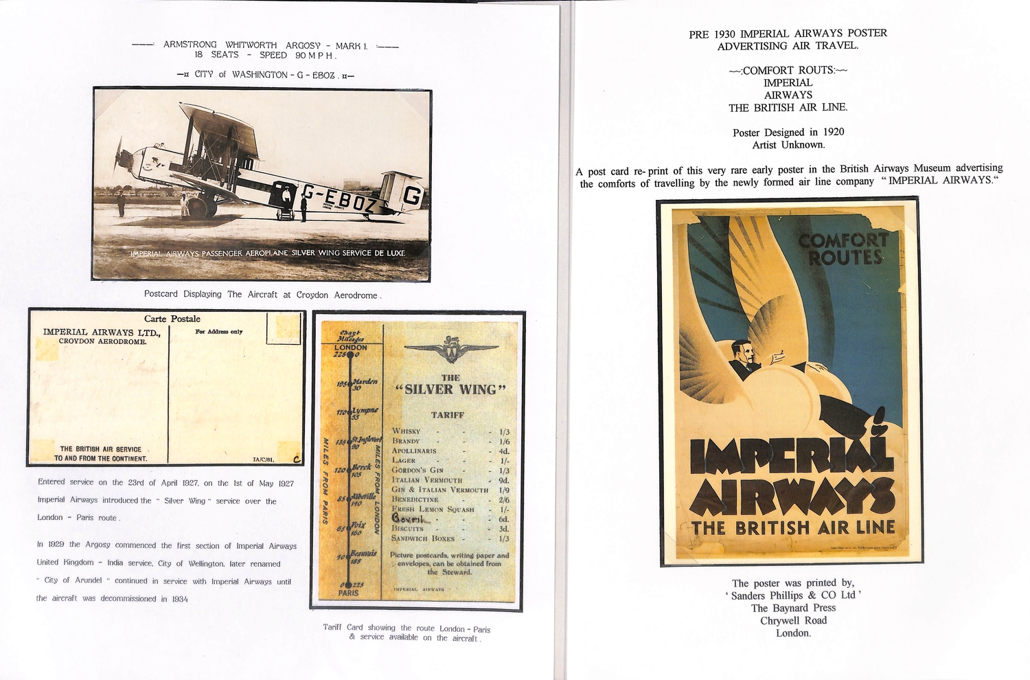 Imperial Airways. 1924-38 Ephemera including c.1924 illustrated Paris to London luggage labels (2, one applied to a tie-on tag with red weight label); leaflets comprising 1931 England to Egypt & Northern Africa, Summer 1931 European Services, July 1933 New London to Calcutta Air Route (2), Summer 1938 European timetable, 1938 Winter timetable England to Egypt, Iraq, India, Hong Kong, Malaya & Australia, also picture postcards (2), etc. (10+).