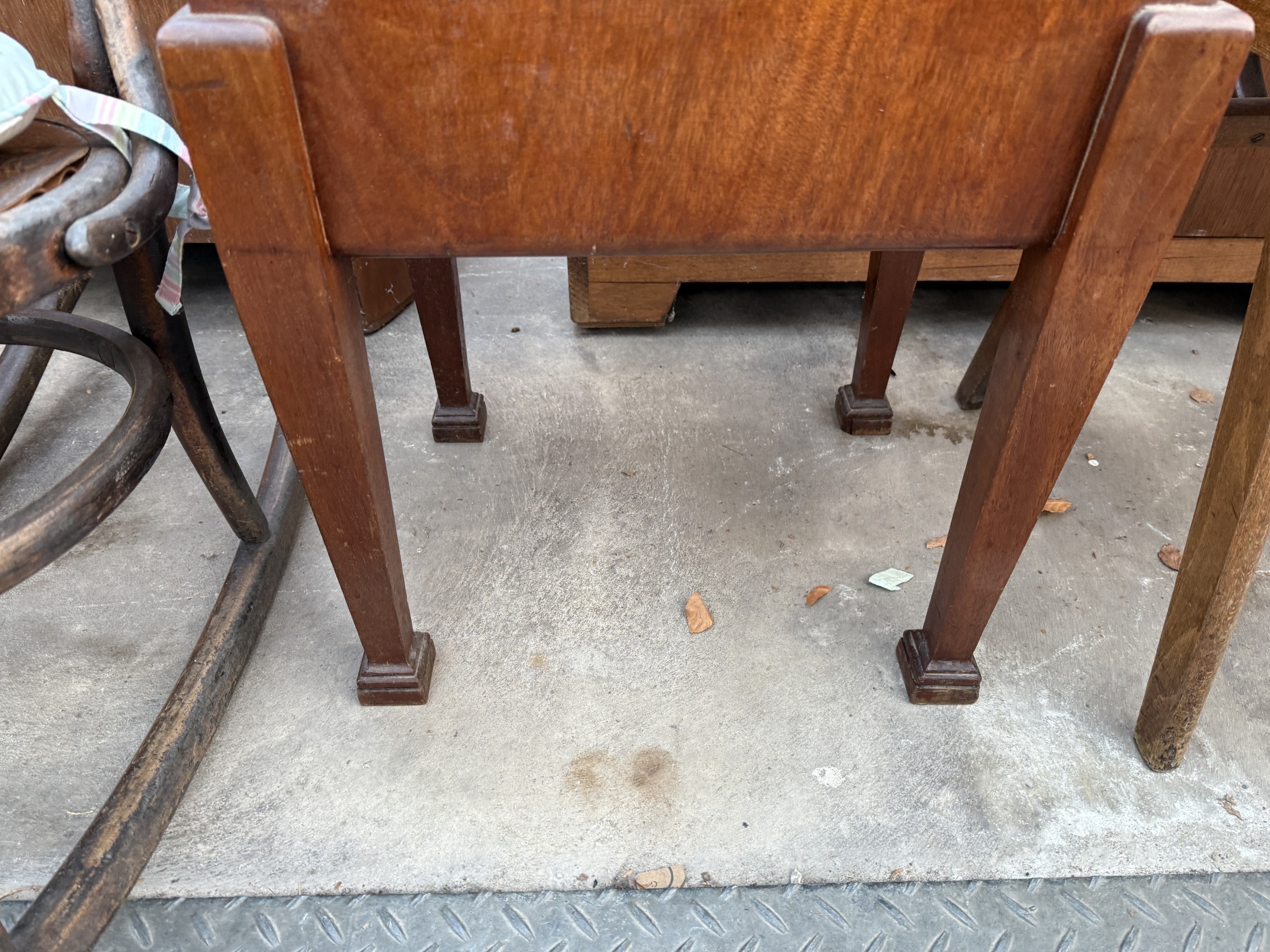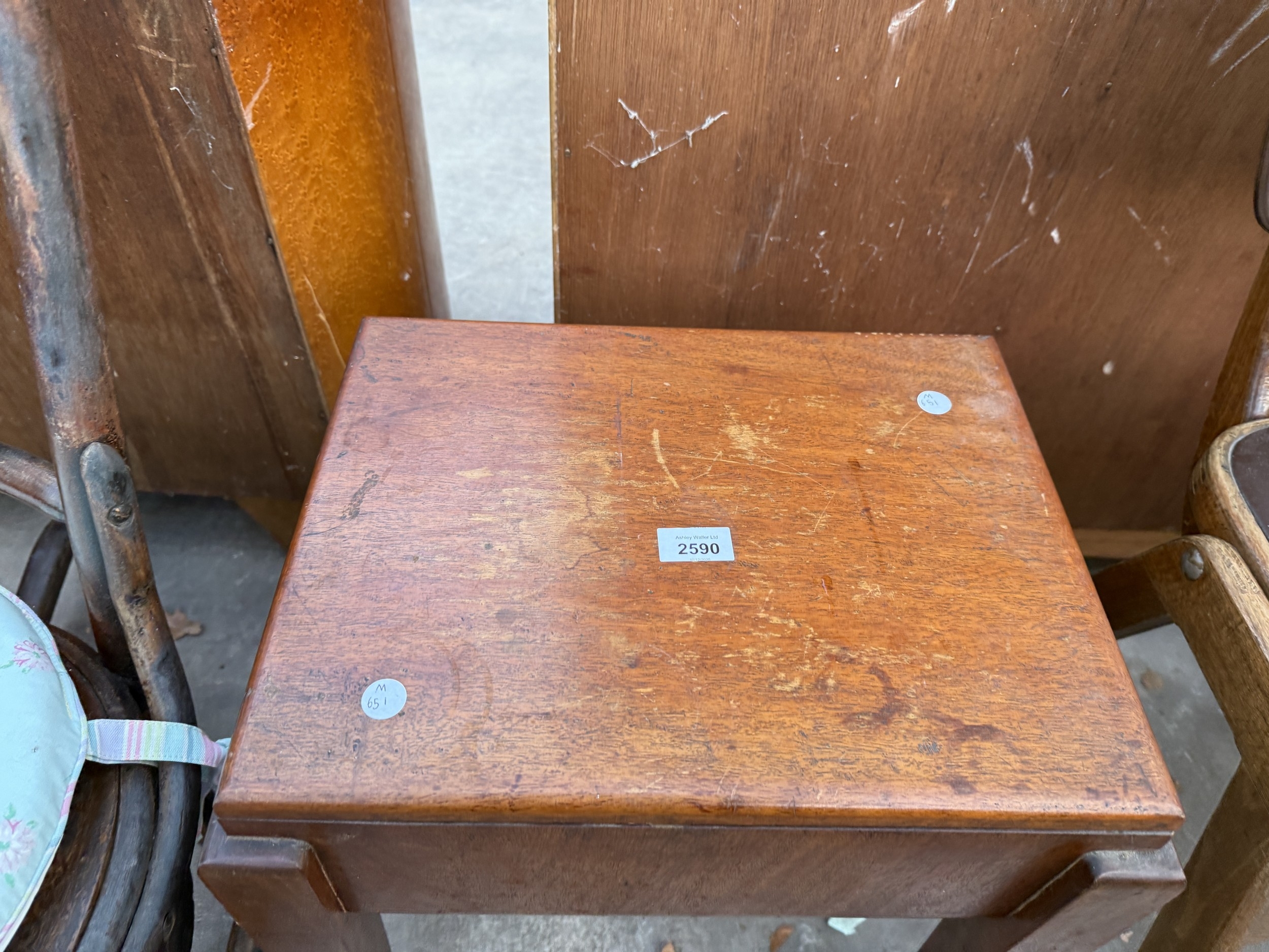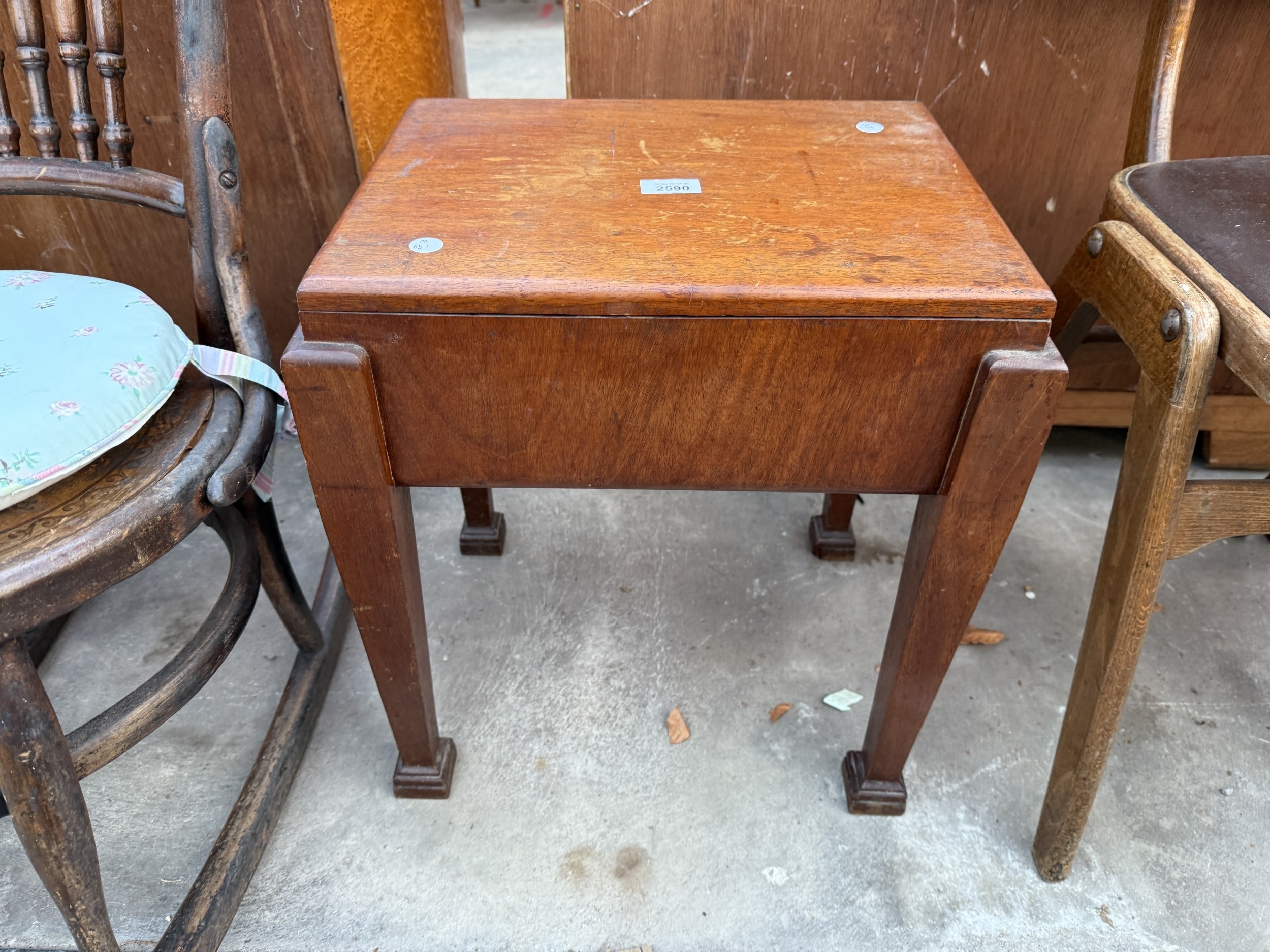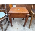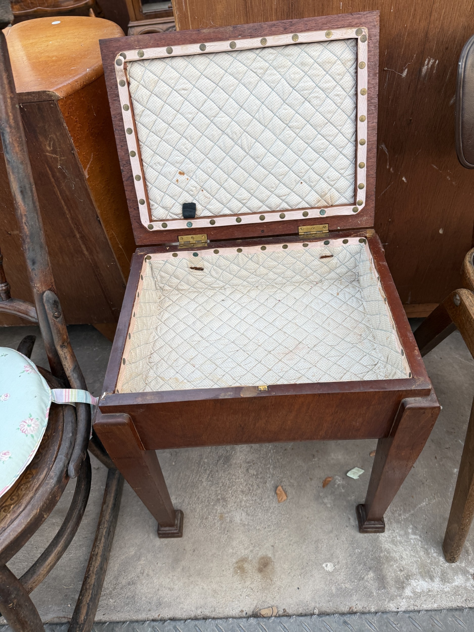 AN EDWARDIAN MAHOGANY SEWING BOX/STOOL ON TAPERING LEGS