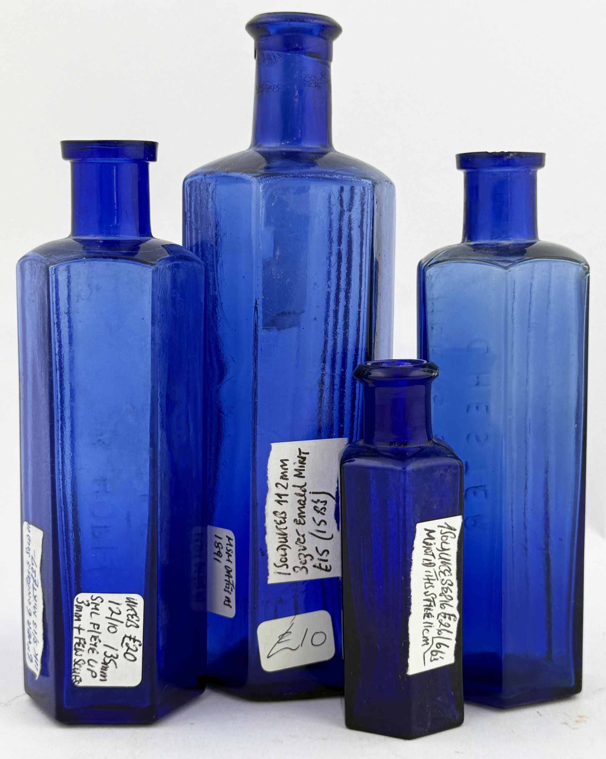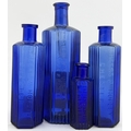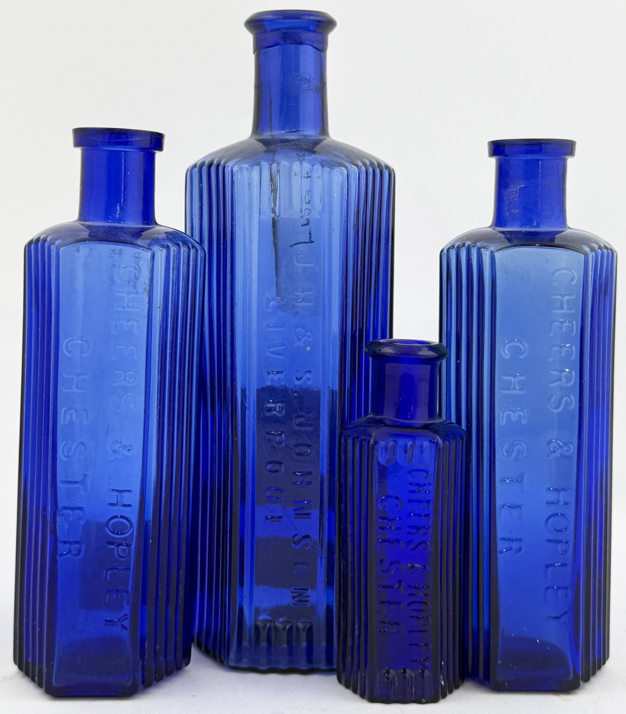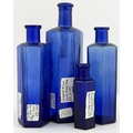 CHESTER & LIVERPOOL CHEMIST BOTTLES. Tallest 6.5ins. Embossed, cobalt blue glass. Cheers & Hopley plus J H & S Johnson. Lip nick. (4)