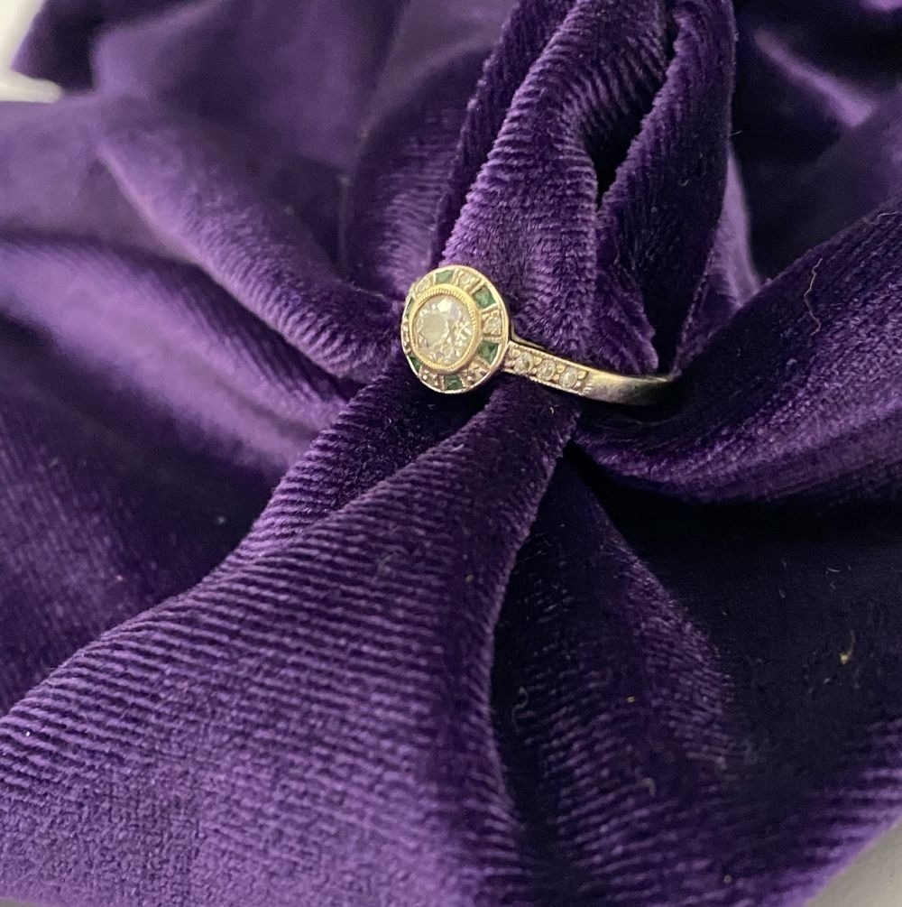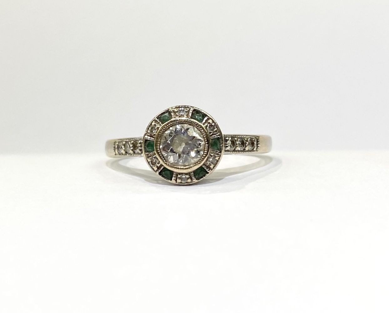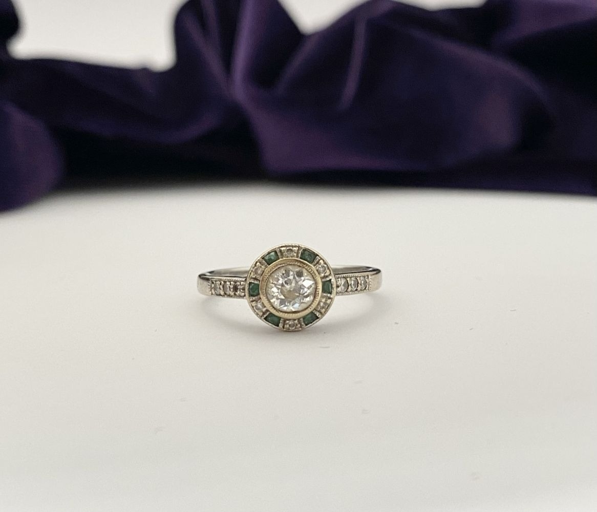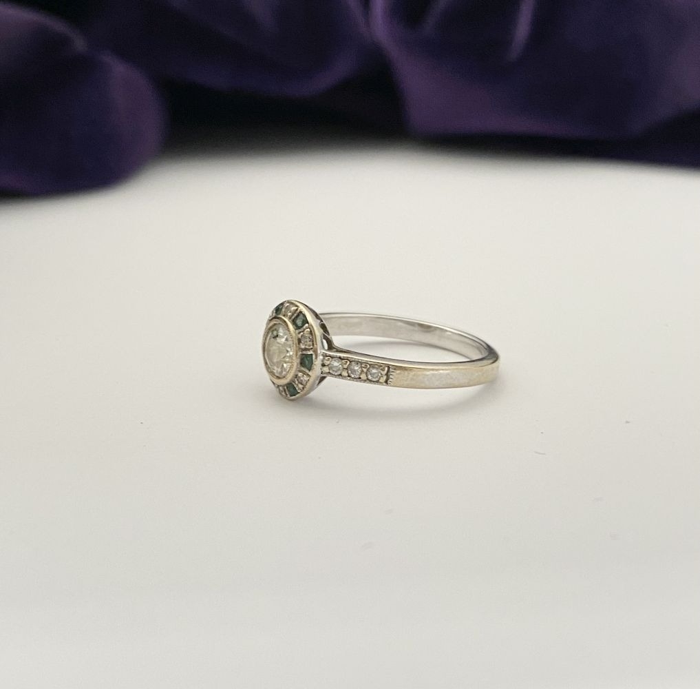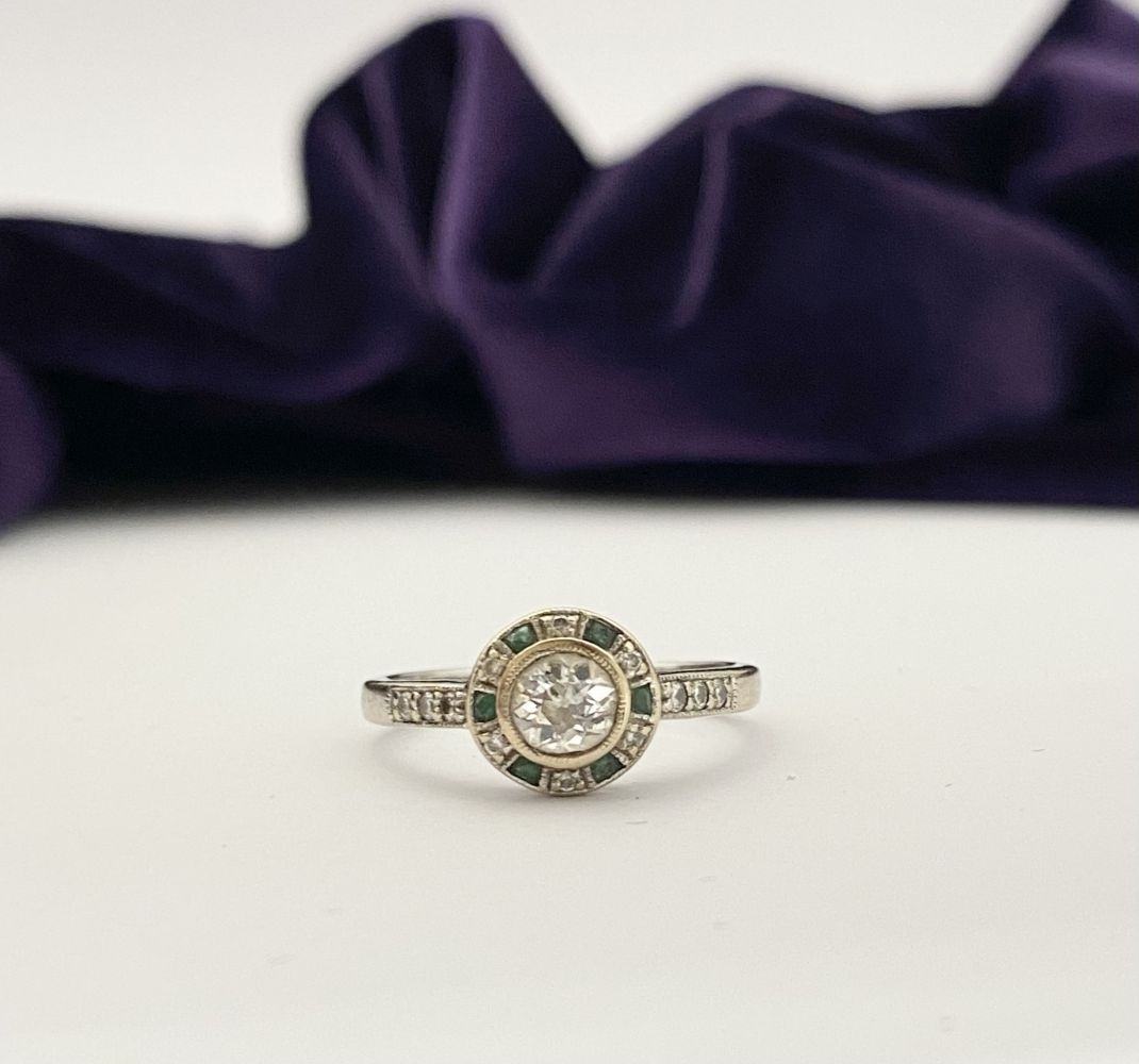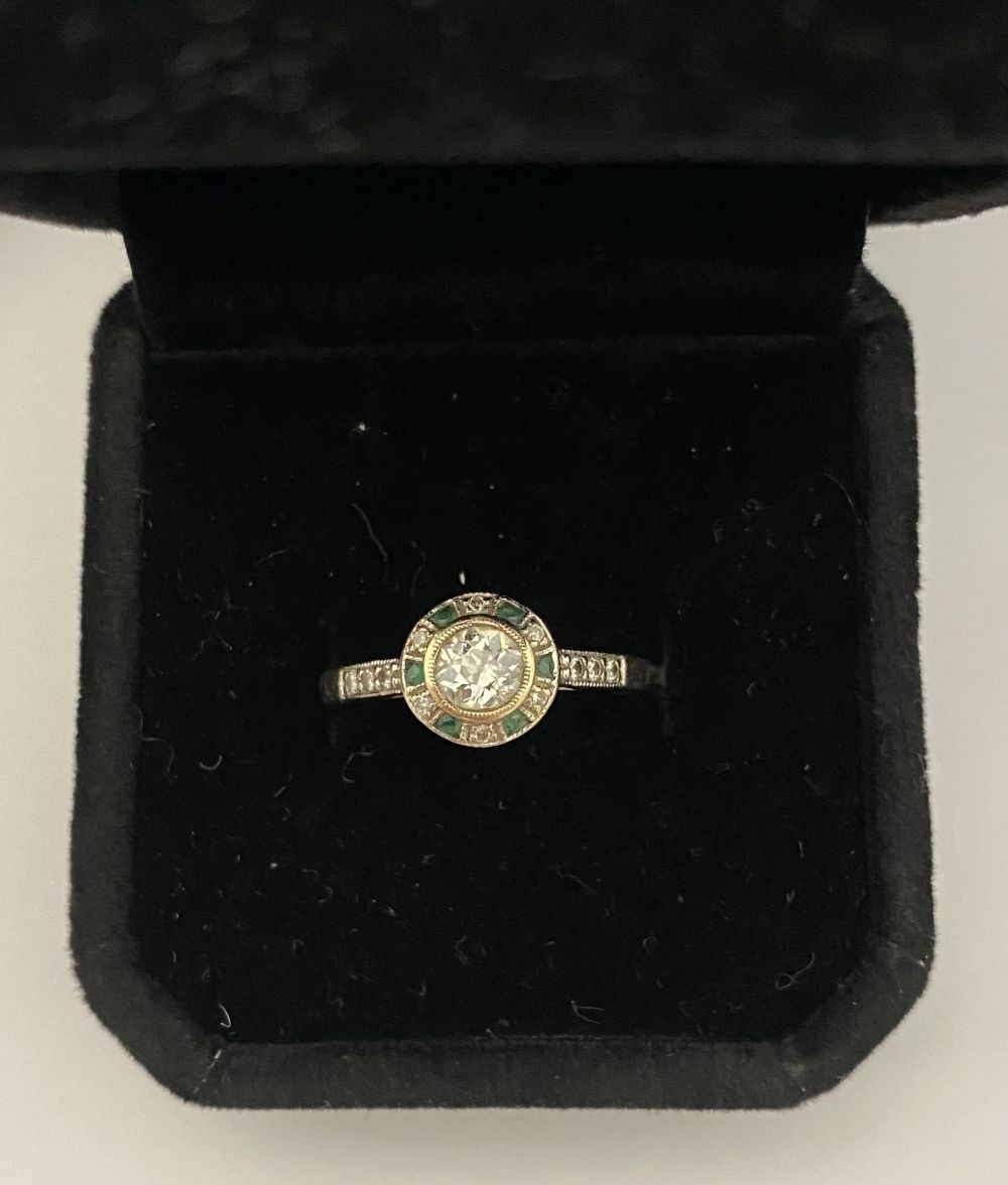 AN 18CT WHITE GOLD ART DECO STYLE DIAMOND & EMERALD TARGET RING, with central round cut diamond in millegrain bezel setting, surrounded by row of alternating diamonds and emeralds, with diamond set shoulders to 18ct white gold band. In excellent condition. Ring size: M