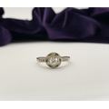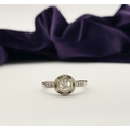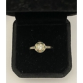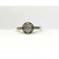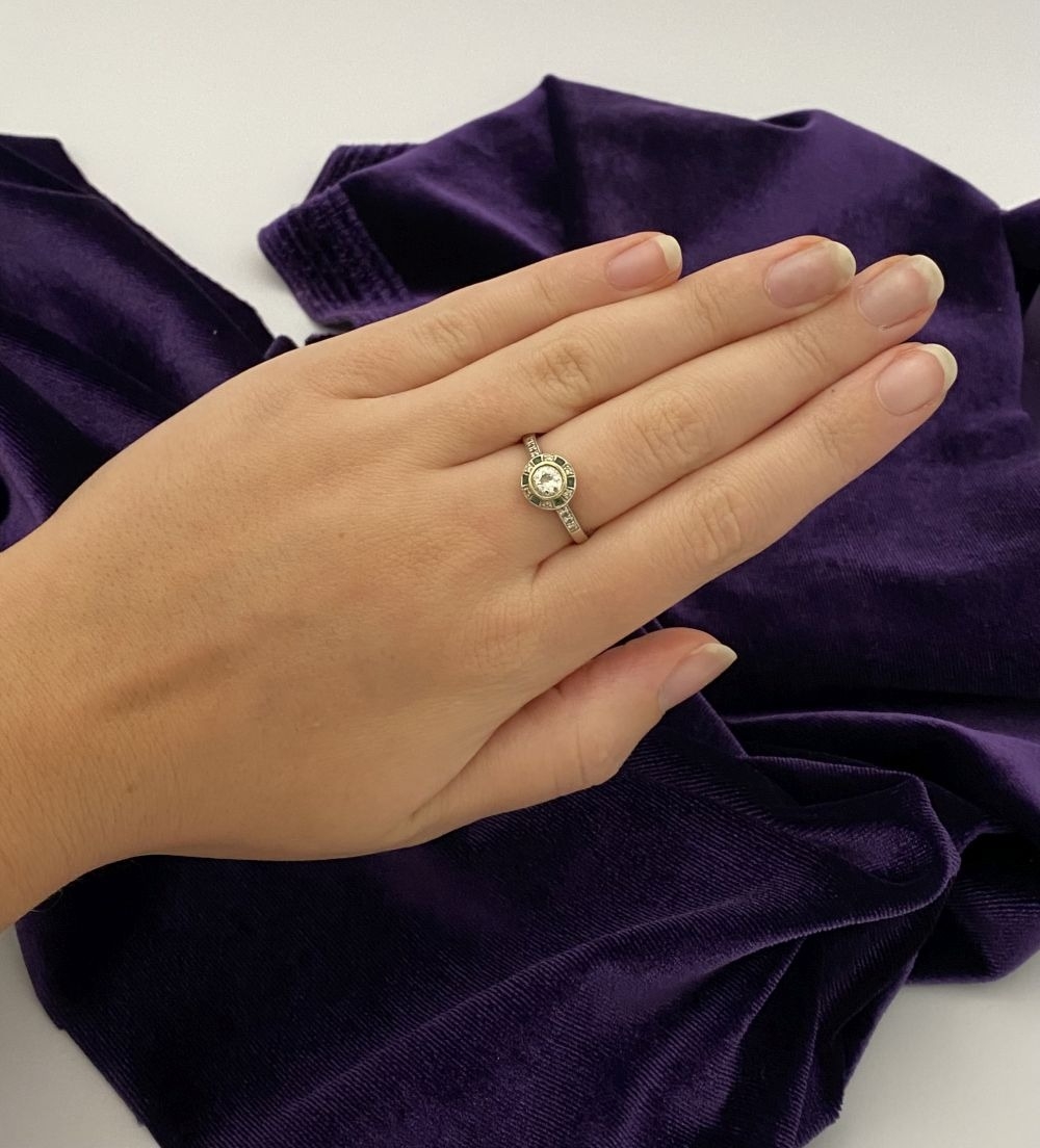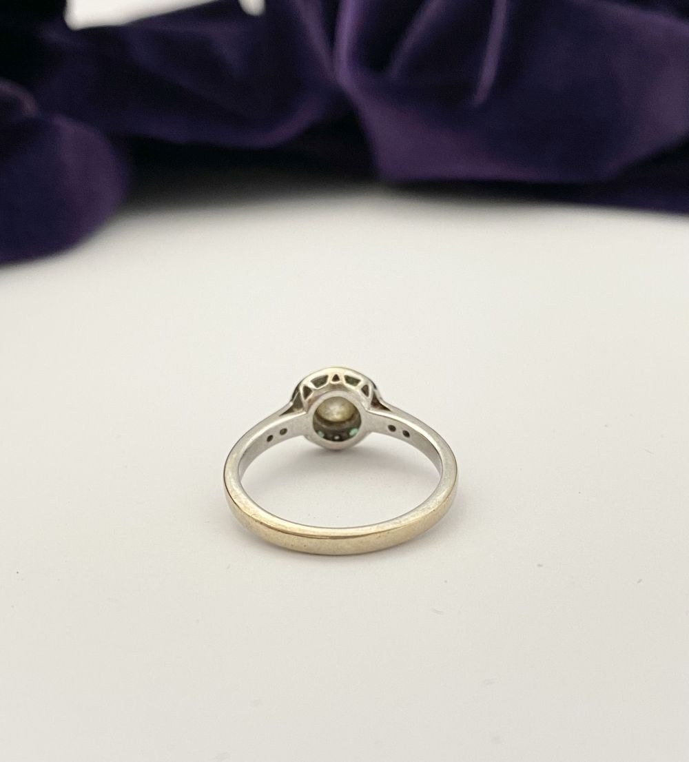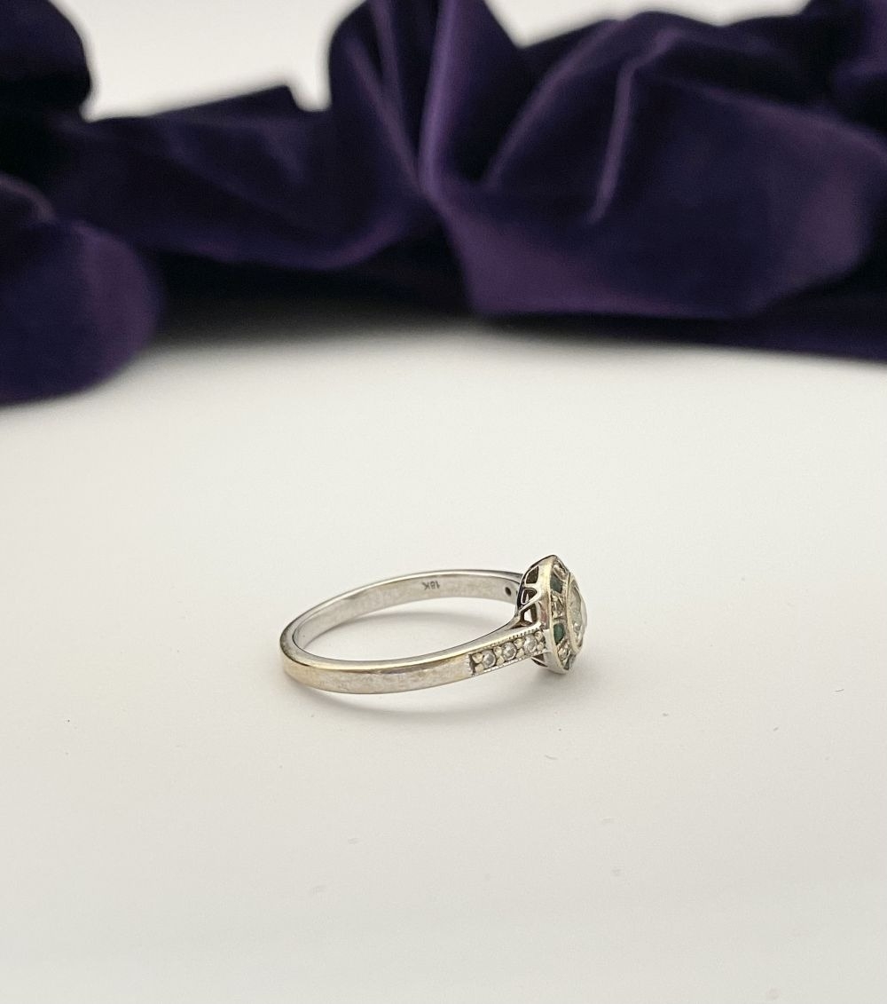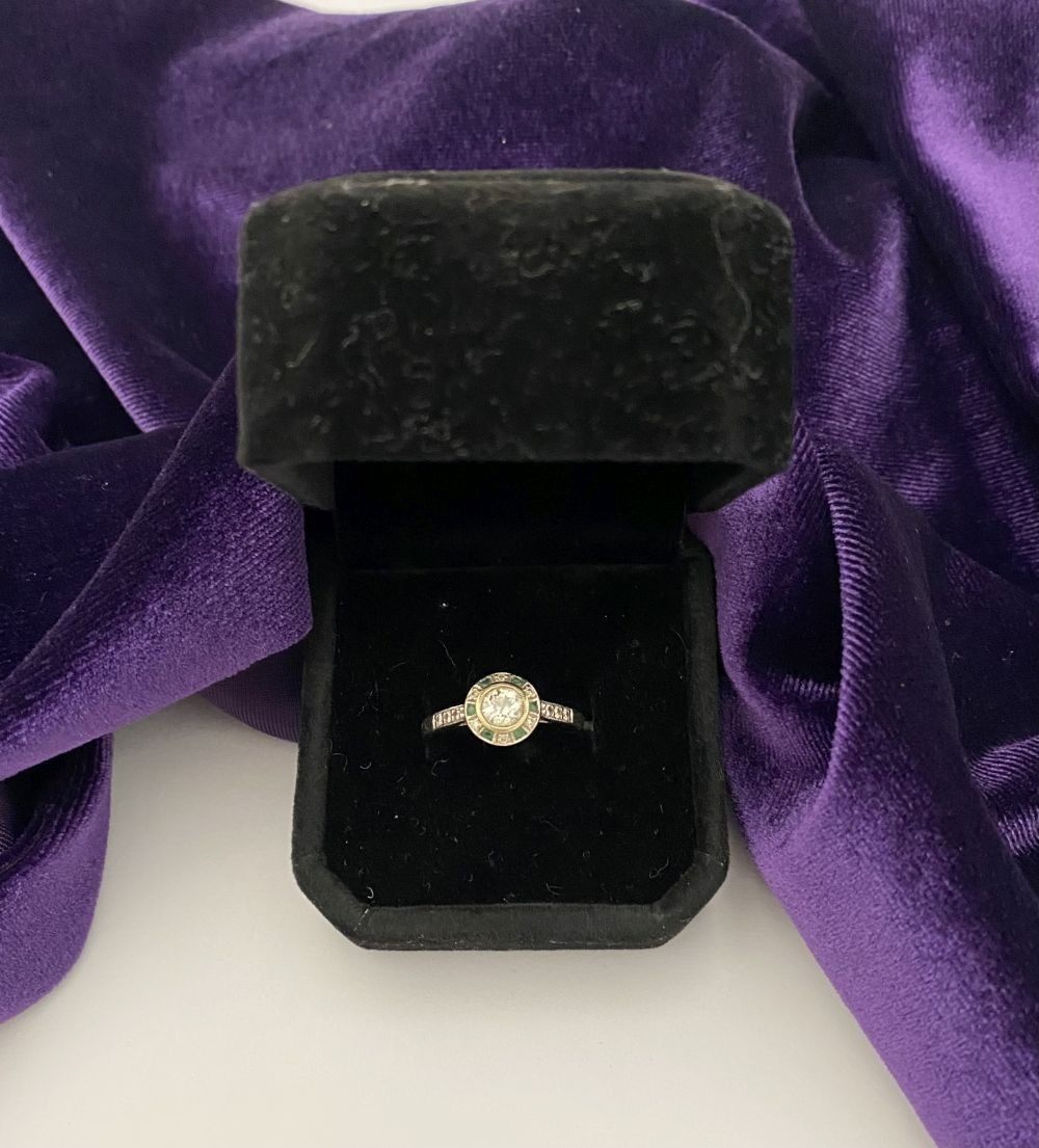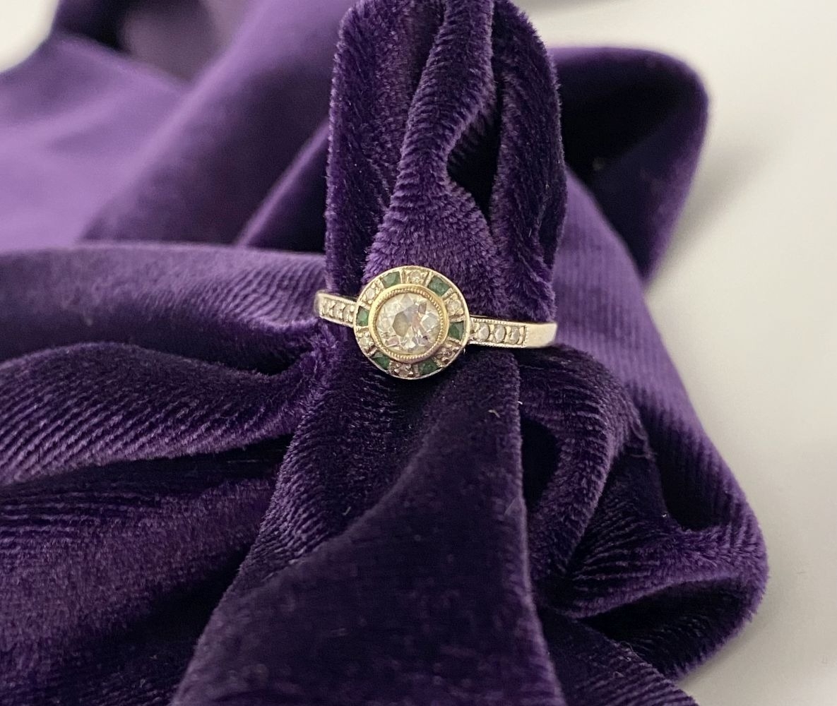 AN 18CT WHITE GOLD ART DECO STYLE DIAMOND & EMERALD TARGET RING, with central round cut diamond in millegrain bezel setting, surrounded by row of alternating diamonds and emeralds, with diamond set shoulders to 18ct white gold band. In excellent condition. Ring size: M