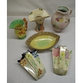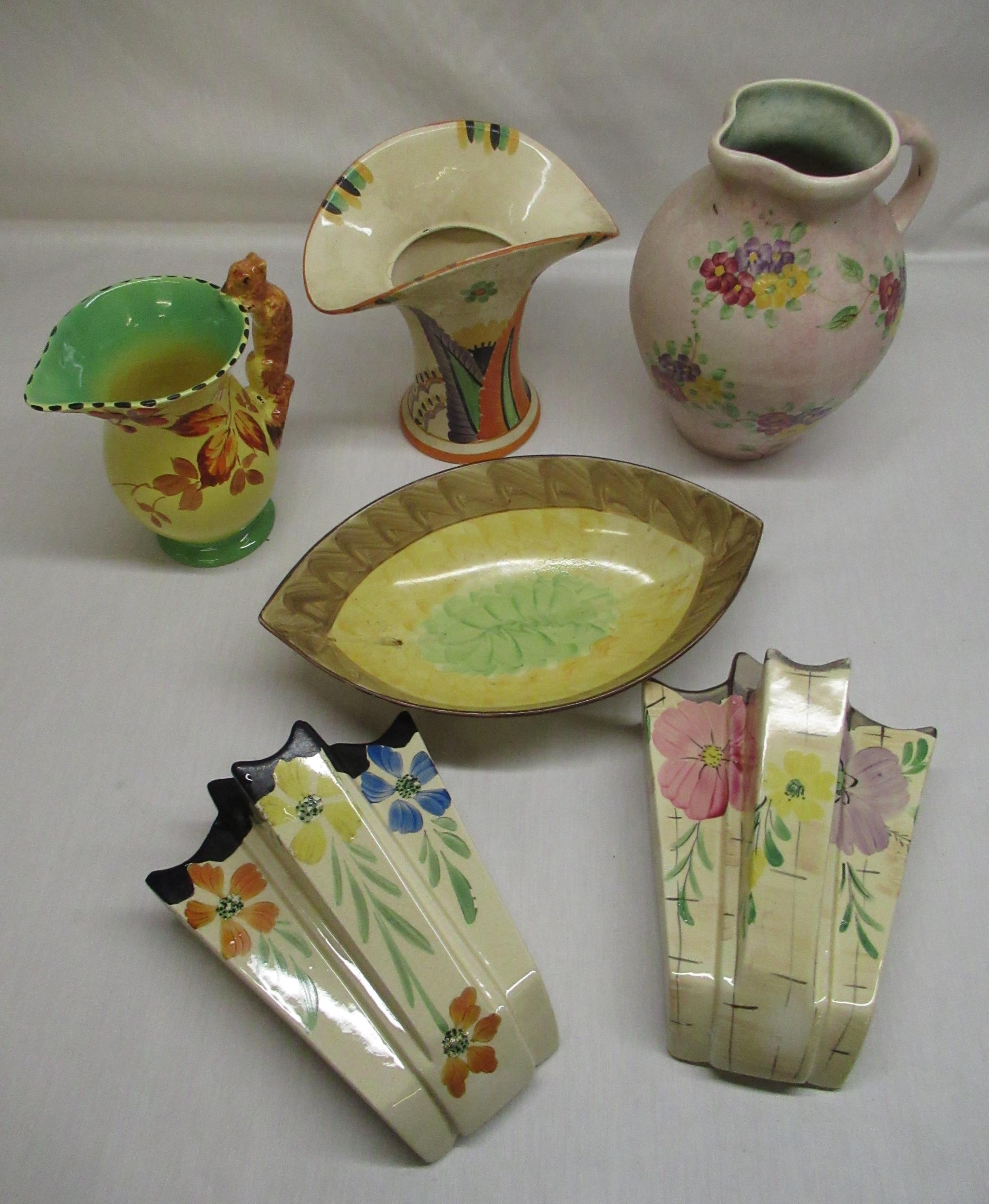 Pair of 1930's Arthur Wood wall pockets, with hand painted floral decoration, Burley Ware jug with squirrel handle and other similar 1930's decorative ceramics