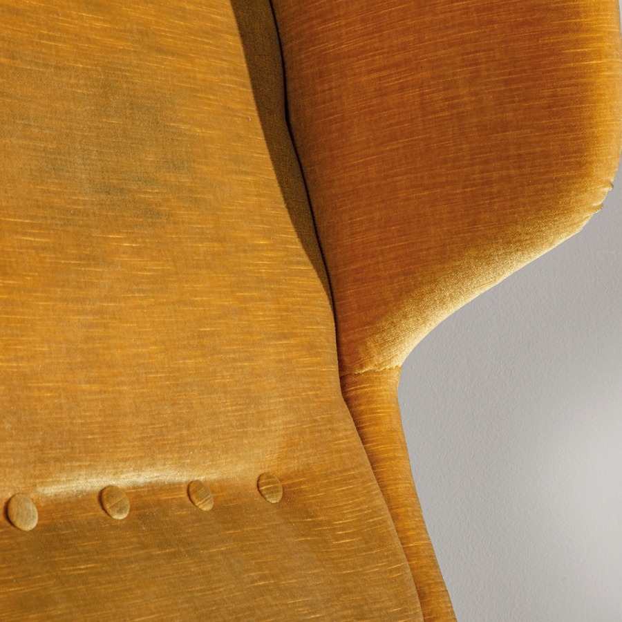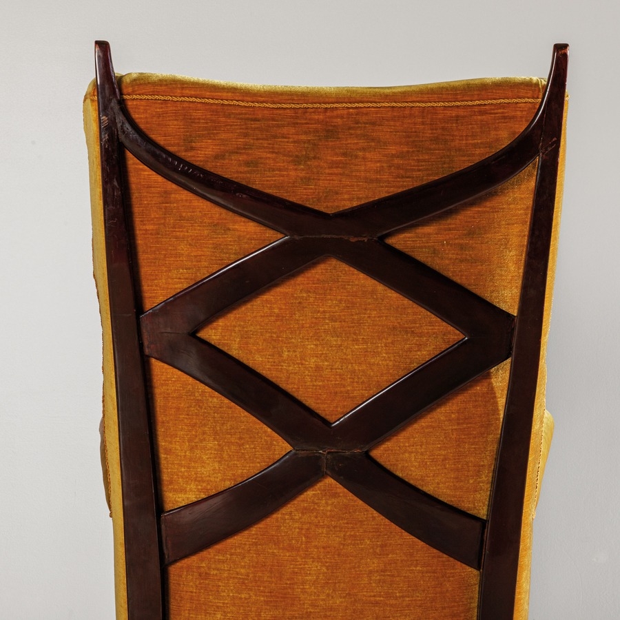 Buone condizioni generali. Piccole righe, leggeri graffi, normali segni di usura. Tessuto originale in buone condizioni vintage. Presenta lievi aloni e punti di maggiore usura. Sullo schienale in prossimità degli incroci lieve fessurazione, tracce di vecchi incollaggi.