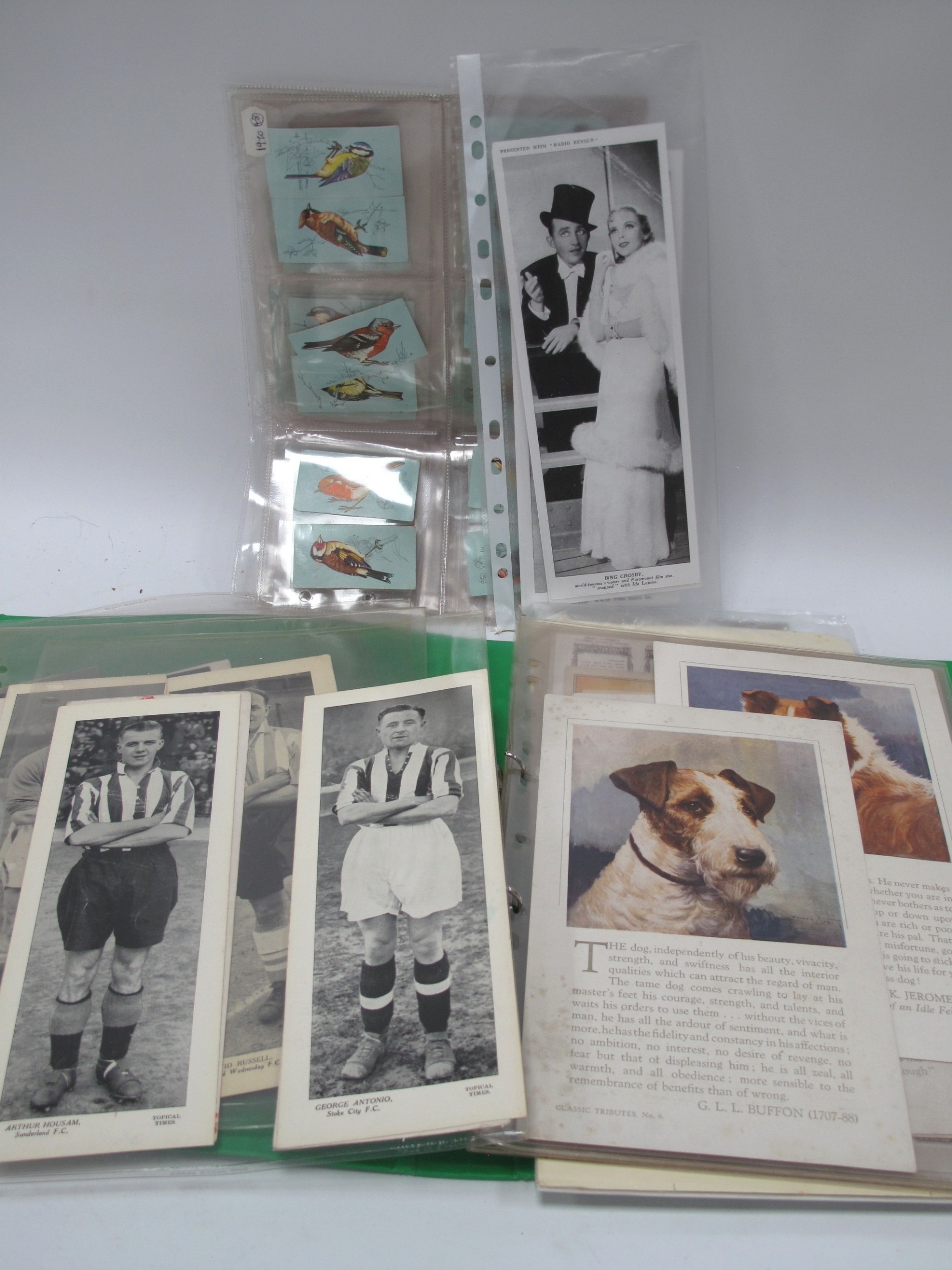 Trade Cards - Tetley Tea British Birds, topical times footballers (13), Spratt's ovals dog postcards, glamour pin-ups etc, in green album.