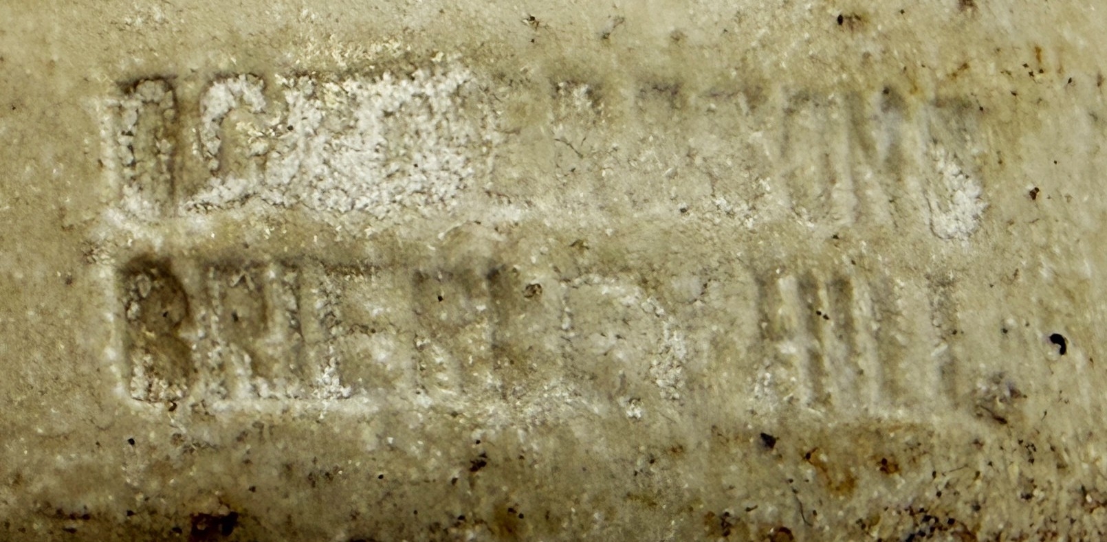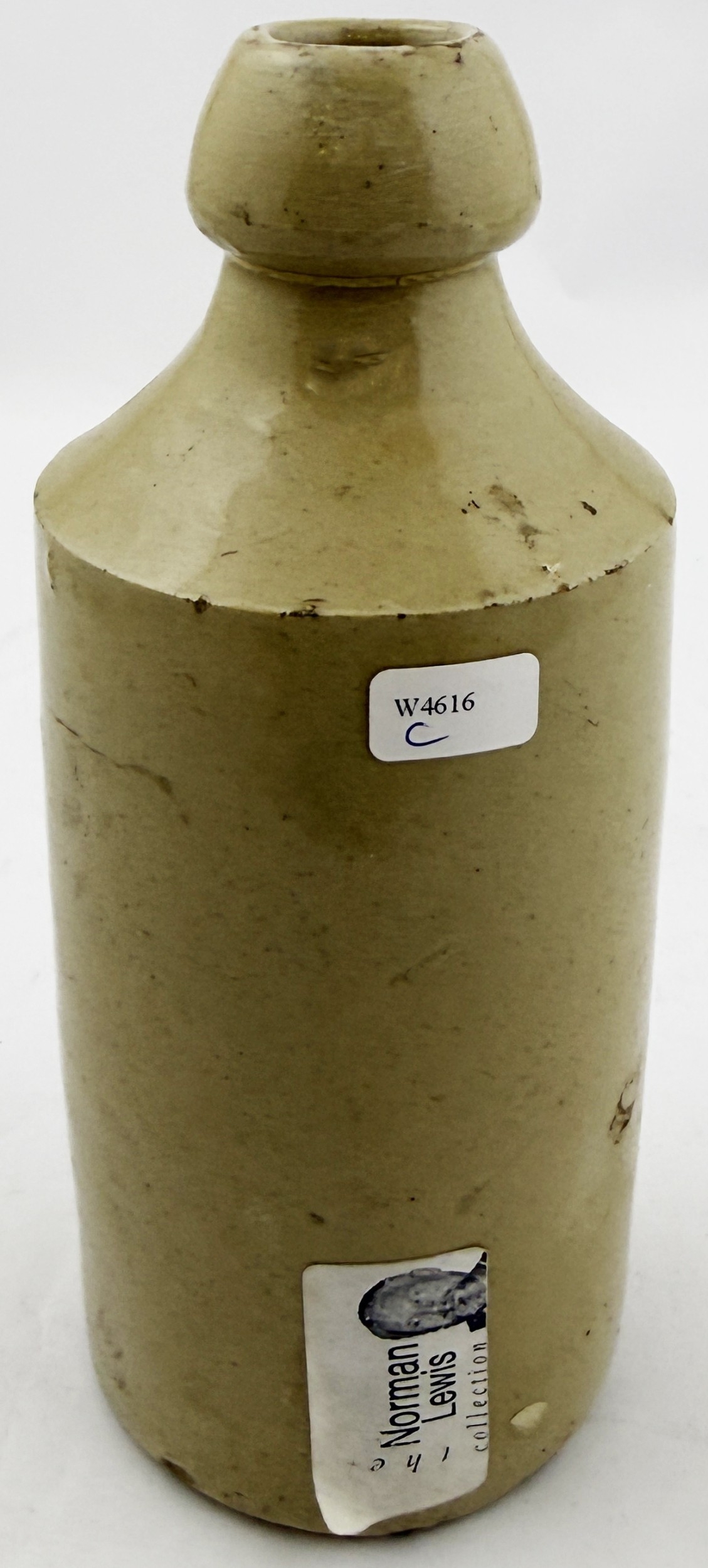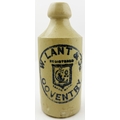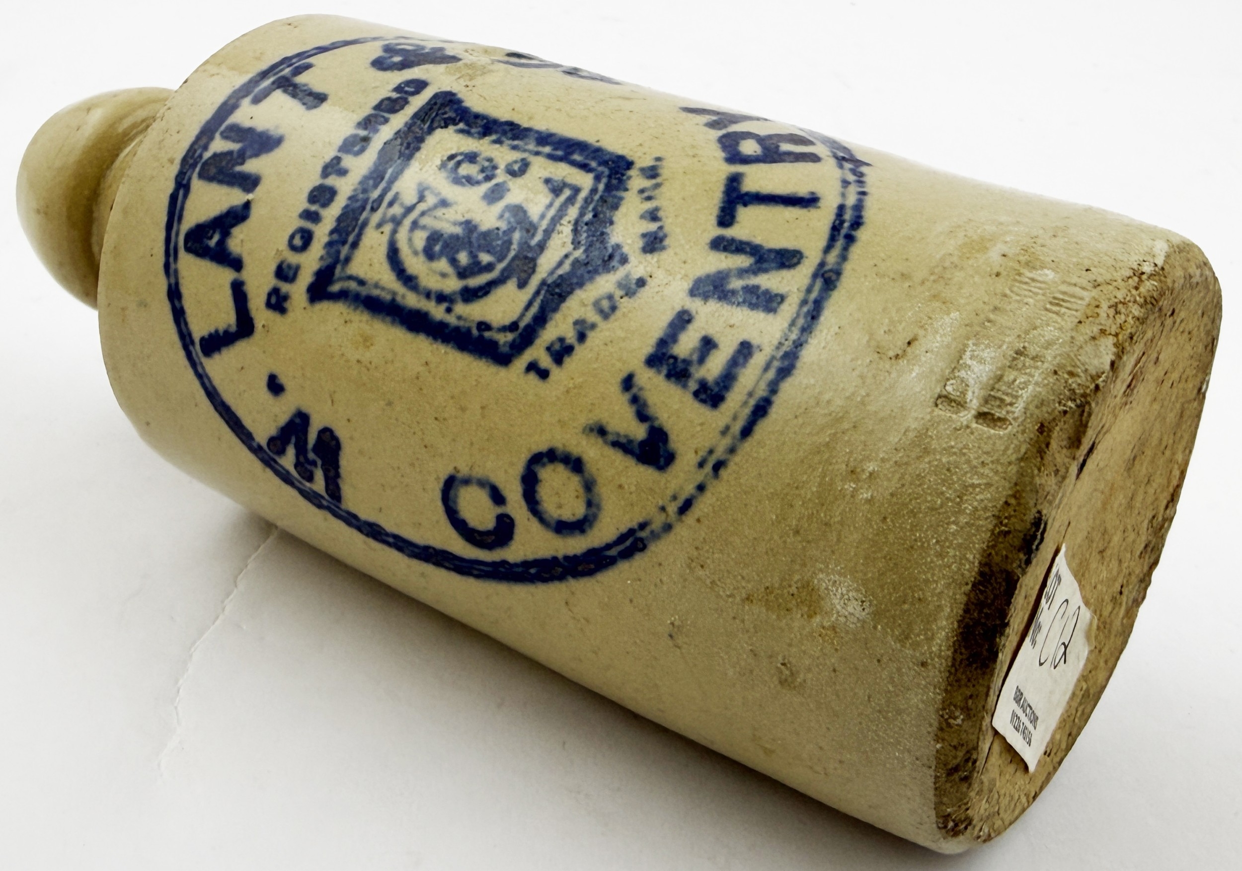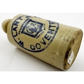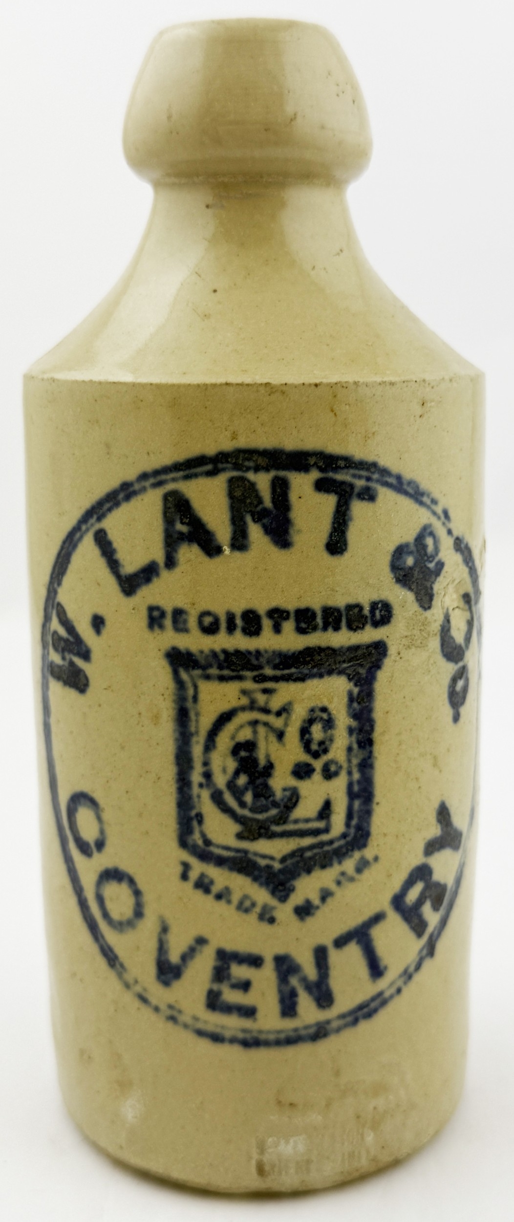 W LANT COVENTRY GINGER BEER BOTTLE. 6.75ins tall. All white std. blue print ginger W LANT & CO/ COVENTRY central trade mark of monogram in shield. Brierley Hill p.m.