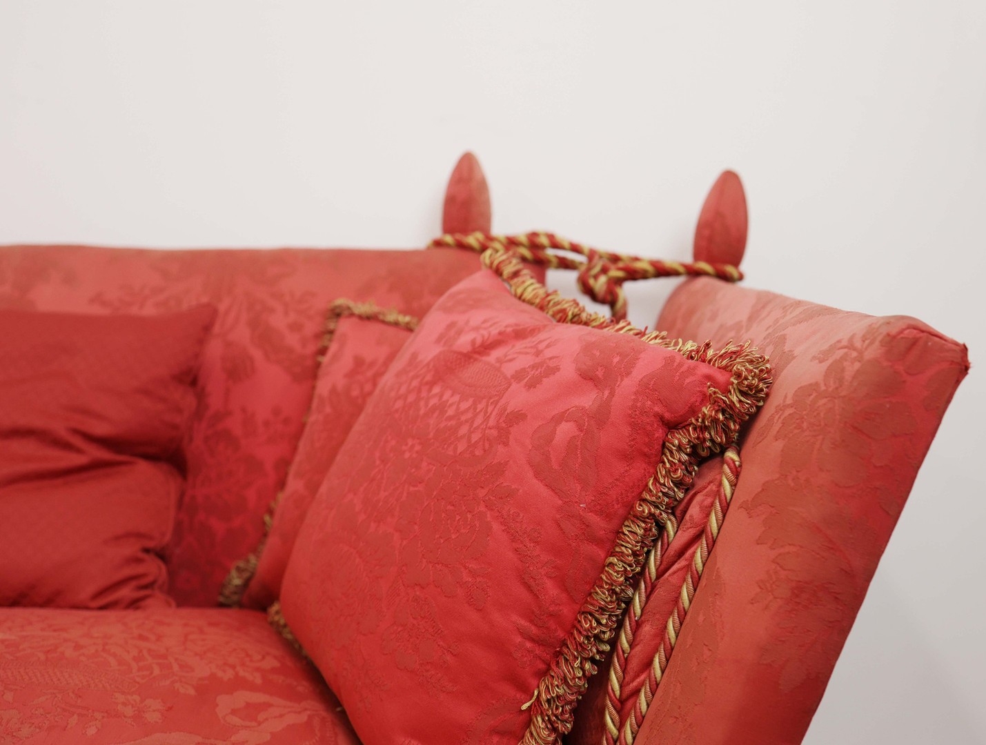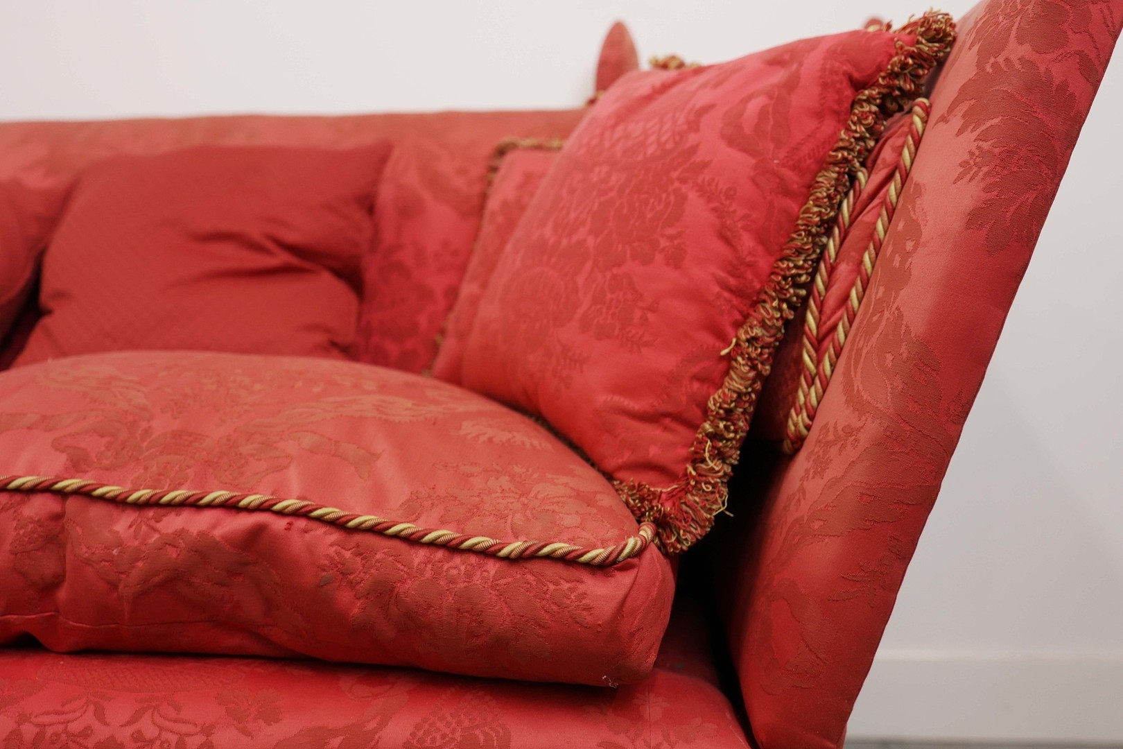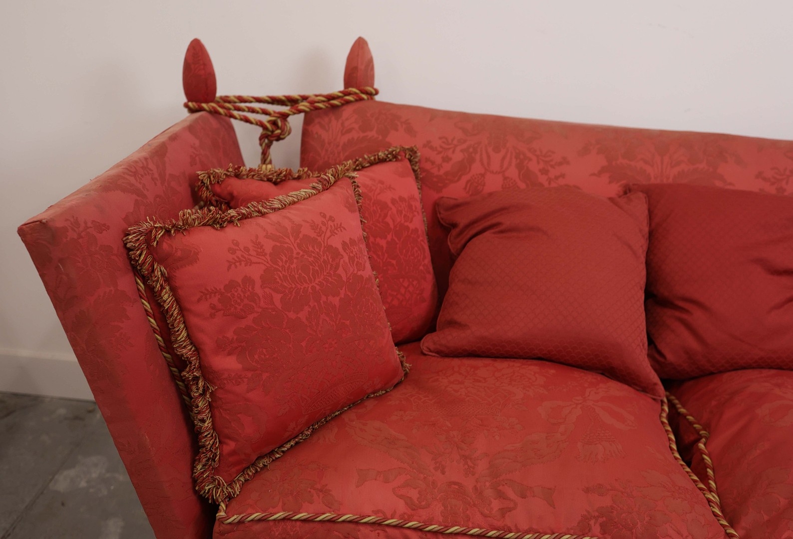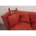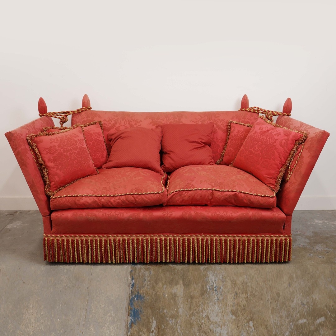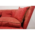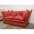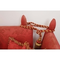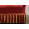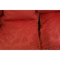 KNOLE SOFA. with drop ends in crimson damask, with bullion fringe 88cm t x 158cm w x 86cm d.