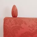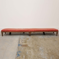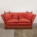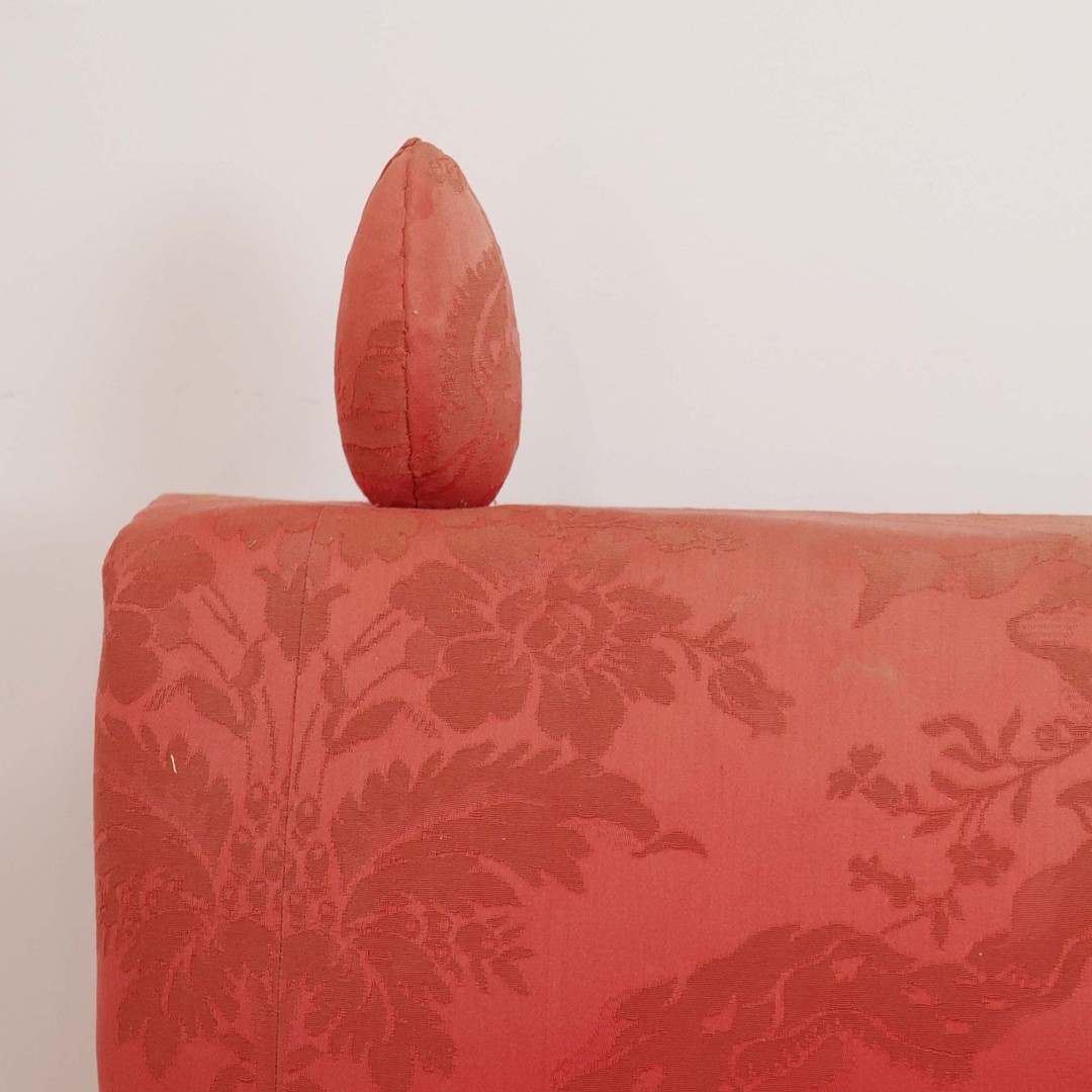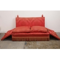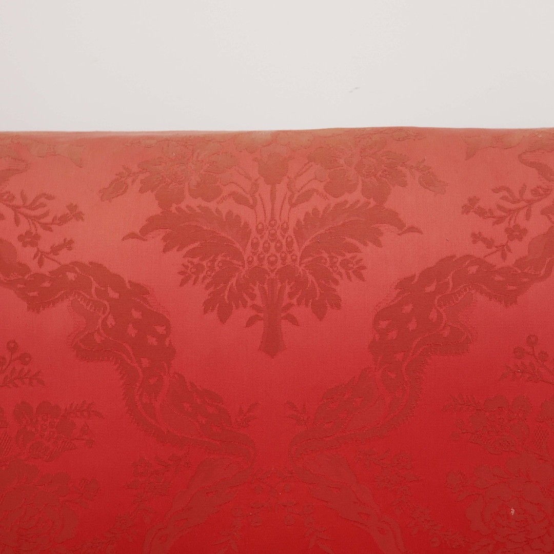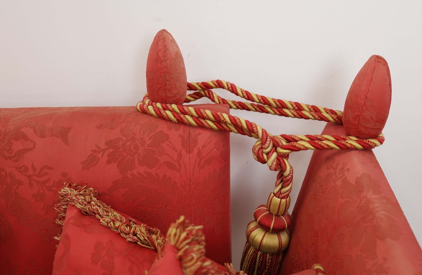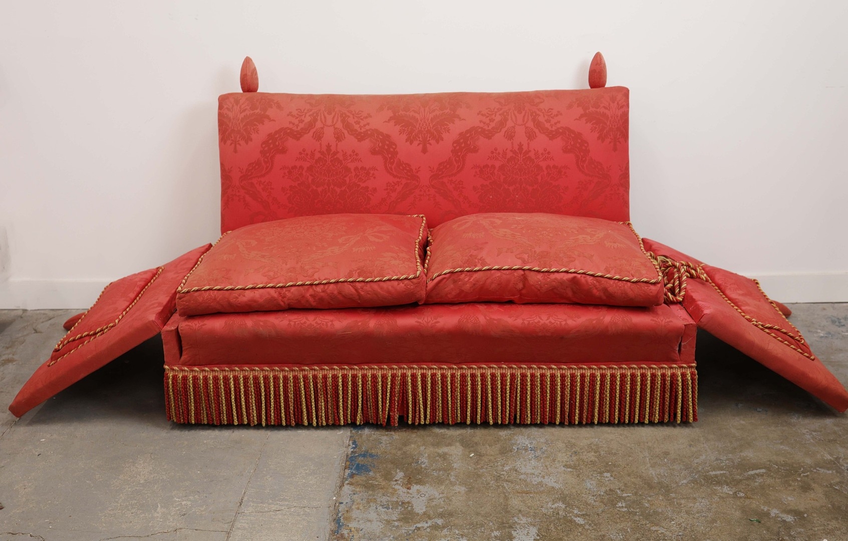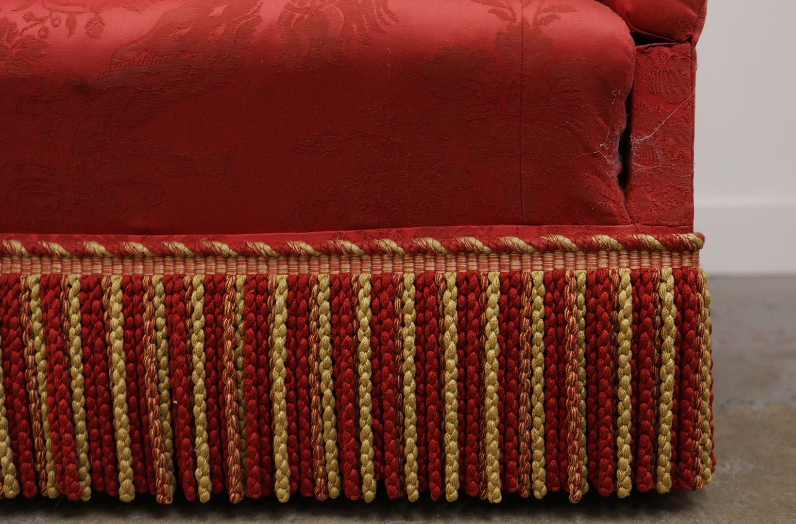KNOLE SOFA. with drop ends in crimson damask, with bullion fringe 88cm t x 158cm w x 86cm d.
